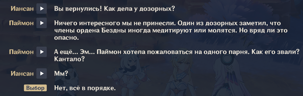 Алсо, кстати, квест с перевёрнутой статуей Барбатоса, с тем же Дайном, он тоже у меня тыщу вопросов вызывает. Не вижу там логичной связи, чтоб наш ГГ просто в тупую в углу сидел и смотрел, как там наш брат/сестра пиздится, а потом в портал заходит. Это совершенно не то поведение человека, который пол Тейвата на своих двоих прошёл и в любой жёсткий блудняк вписывался, чтоб хоть какую-то инфу про родственника узнать. Правильное поведение - это вставить меч в спину Дайна в крысу, а потом уйти со своим братеком хоть в бездну, хоть в Сызрань, вообще похуй.