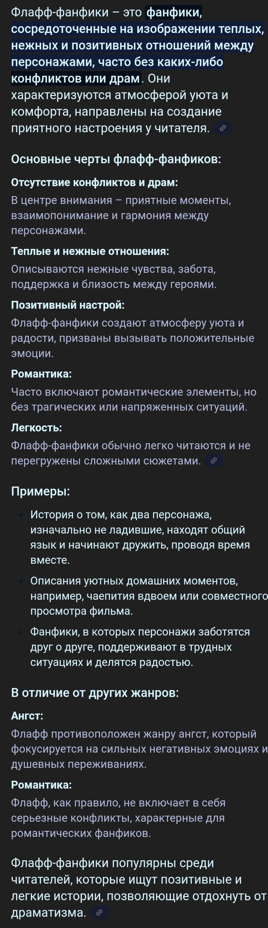 >>5234931 > Иногда его описывают как противоположность ангсту . Флафф может не иметь сюжета, однако, в отличие от фанфиков, основное внимание уделяется не сексу, а проявлению чувств между двумя или более персонажами, независимо от того, являются ли их отношения романтическими или нет. История флаффа может быть генетической и фокусироваться на взаимодействии членов семьи (или обретённой семьи).