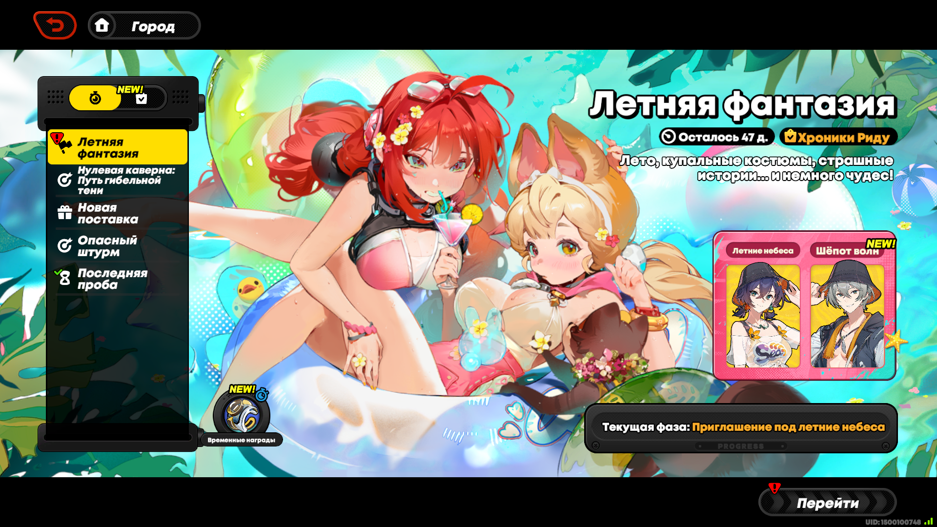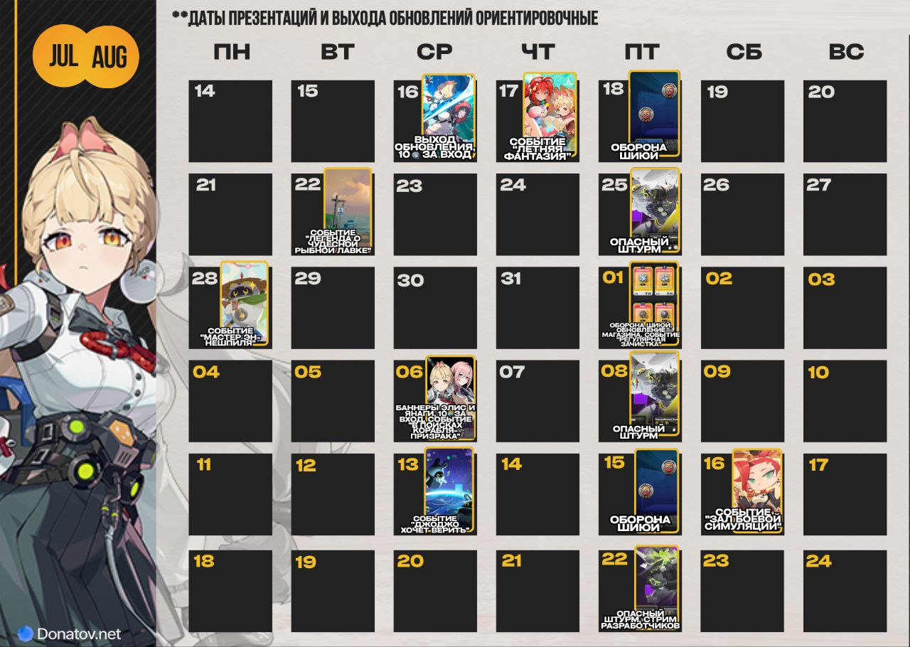 16 июля – выход обновления, 10 💰 за вход 17 июля - событие "Летняя фантазия' 18 июля - Оборона Шиюй 22 июля - событие "Легенда о чудесной рыбной лавке" 25 июля - Опасный Штурм 28 июля - событие "Мастер эн-нешпиля" 1 августа - Оборона Шиюй, обновление магазина, событие "Регулярная зачистка" 6 августа – баннеры Элис и Янаги, 10💰за вход, событие "В поисках корабля-призрака" 8 августа - Опасный Штурм 13 августа - событие "Джоджо хочет верить" 15 августа - Оборона Шиюй 20 августа - событие "Лето. Файлюм. Головоломки!" 22 августа - Опасный Штурм, стрим разработчиков 27 августа - событие "Зал боевой симуляции" 29 августа ‐ Оборона Шиюй