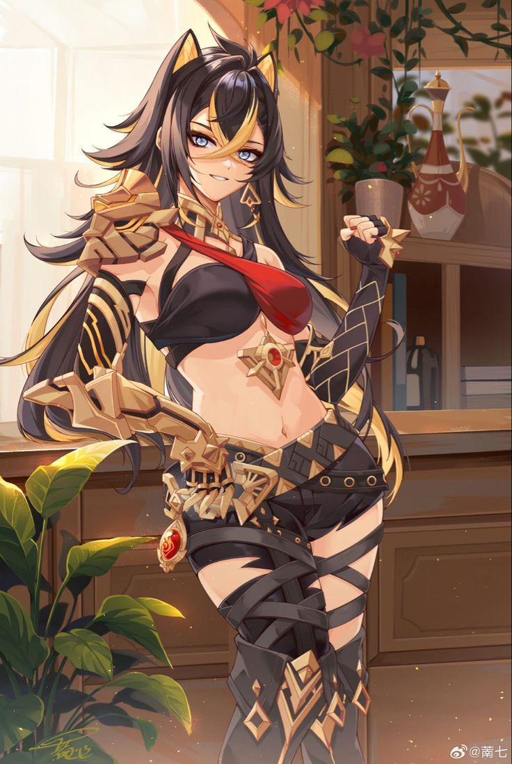 Представь, что Ляо действительно сидел года четыре назад и думал: -"Блять, у меня в Монде рыцари, в ЛиЮэ стражники, в Инадзуме самураи... Сука, одни бомжи средневековые, но ведь у меня ПЛАН(!), мне нужно как-то пропихнуть в игру новую Броню с пиксельной джинсовой юбкой, с очками ВиАр, глоком в кобуре за поясом и связкой гранат в нательной барсетке-банане."