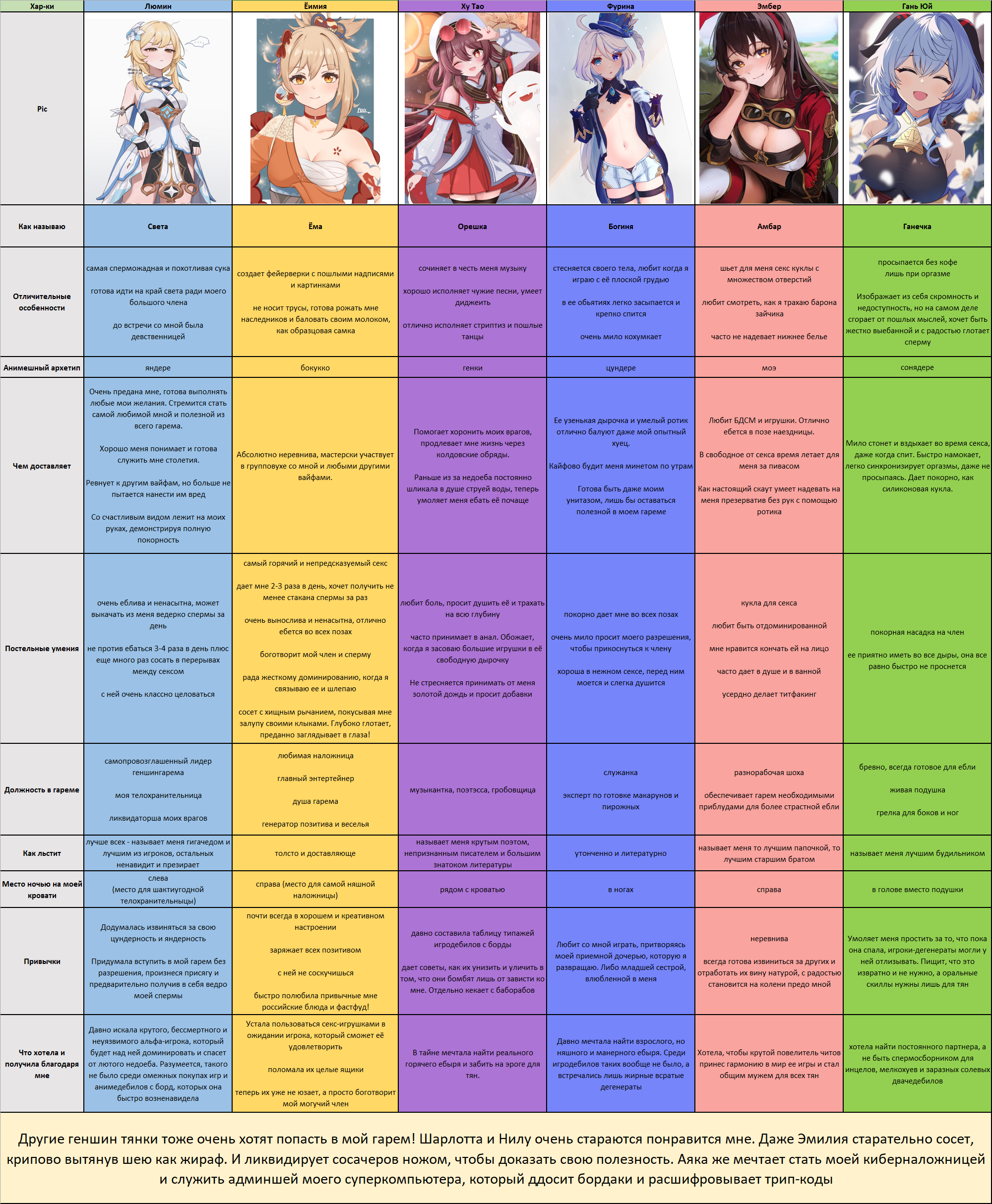 >>5239797 Алсо, на этой пикче противоречие: В пункте "Чем доставляет" под ХуТао сказано >продлевает мне жизнь колдовскими обрядами Но при этом в пункте "Что хотела и получила благодаря мне" под Люмин написано >Крутого, бессмертного, неуязвимого