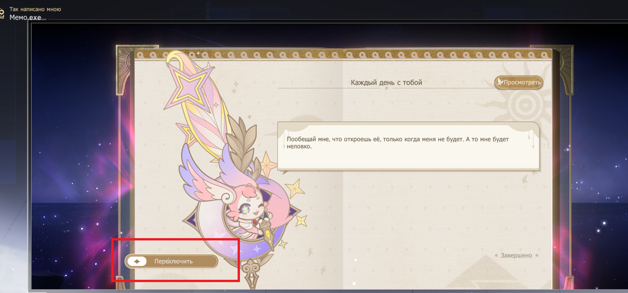 Оронис: Я наконец нашла его... Драгоценное воспоминание. Наконец-то... Я поймала этот взгляд. Оронис: Сопровождай (его/её), Мемо... Оронис: (Он/Она) восстановит воспоминания этого мира... (Он/Она) найдёт... маму...