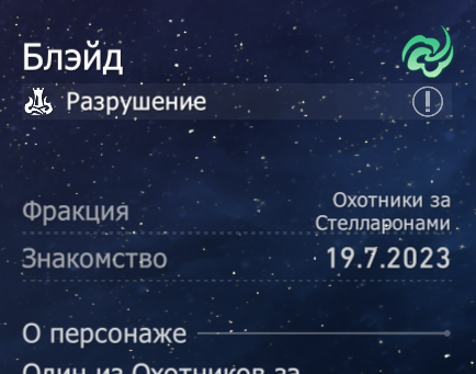 >>5241668 ГГ отдельная тема, что очевидно дожидается раскрытия, особенно как именно работает сила стелларона. Но примечательно, что в игре прямо написали, что ГГ следует Разрушению, скорее всего из-за стелларона же.