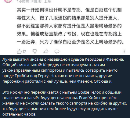 >>5237429 Во всех изначальных сливах её называли насадкой на Фаенона, так и оказалось. Во всех отзывах китаевичков с зарытых бета тестов Фаенона говорилось, что его нёрфят и подстраивают под кит Керидры, так и оказалось. Что там себе луна нафантазировал о её изначальном ките вообще хз. Главным универсальный чаром амфореусного патча должна быть Кирена, на неё делают ставку, а не на полтораху