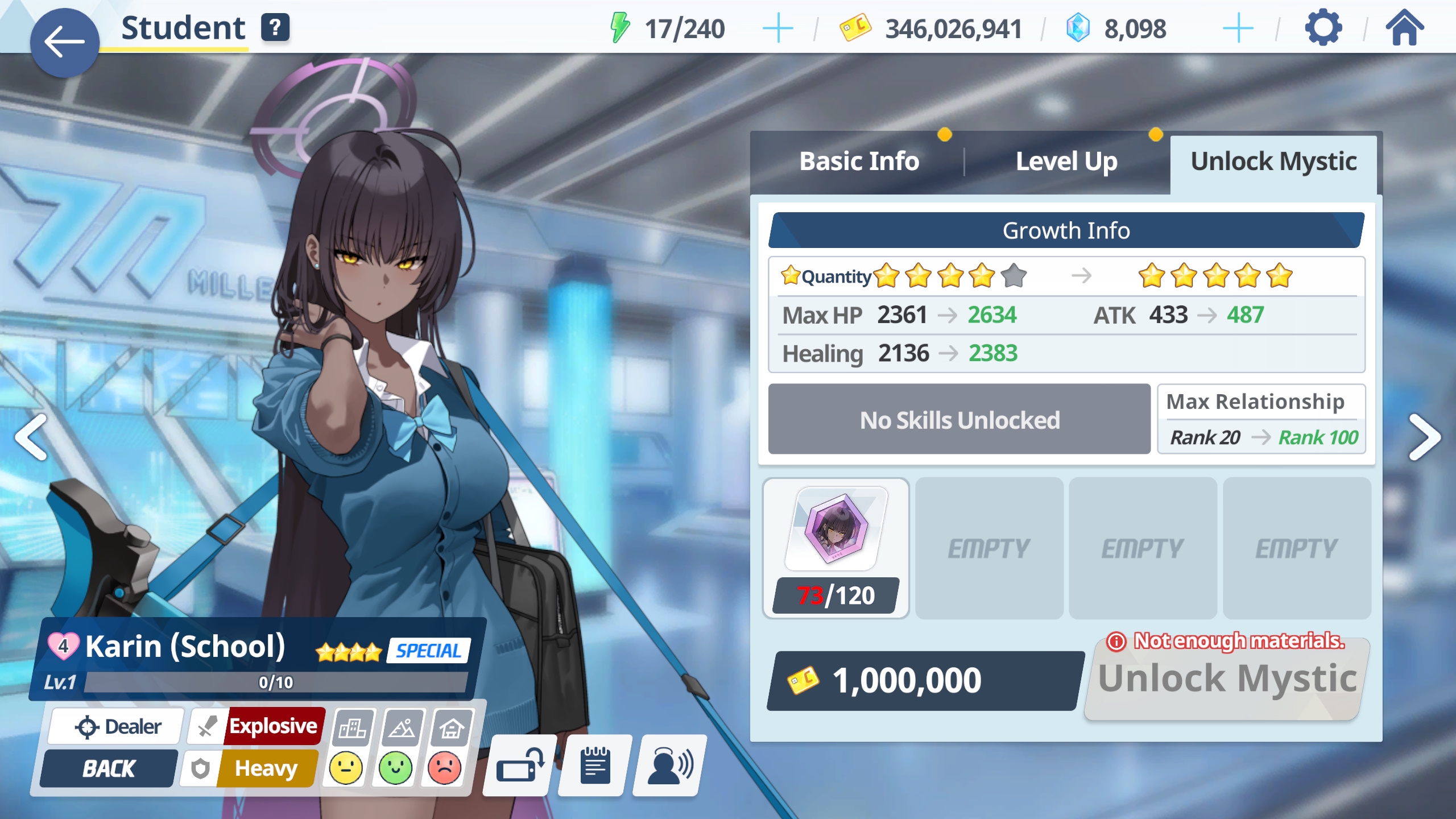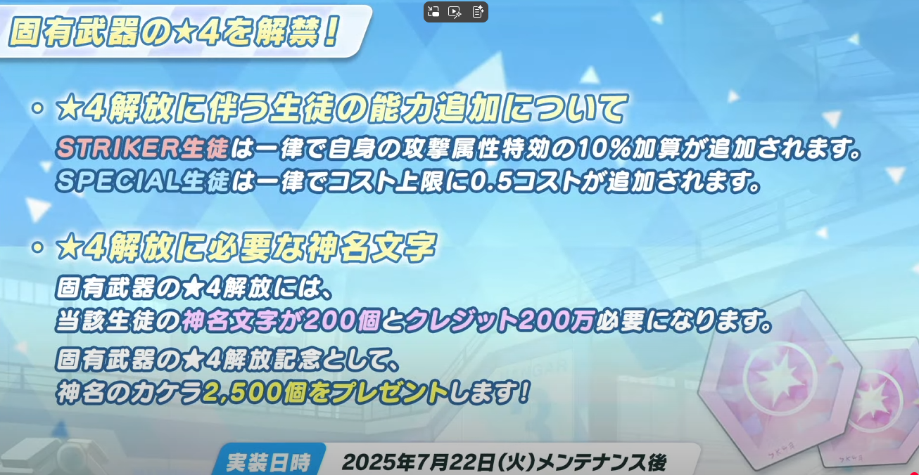 Дополнительные способности для учеников при открытии ★4 Ученики СТРАЙКЕРА получат бонус 10% к эффективности своих характеристик атаки. Ученики СПЕЦИАЛЬНОГО уровня получат бонус 0,5 к лимиту стоимости. Для открытия ★4 требуется символ божественного имени Чтобы открыть уникальное оружие для ★4, вам потребуется 200 символов божественного имени и 2 миллиона кредитов для ученика.