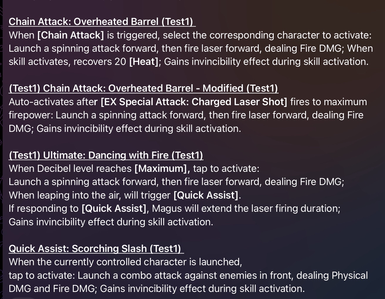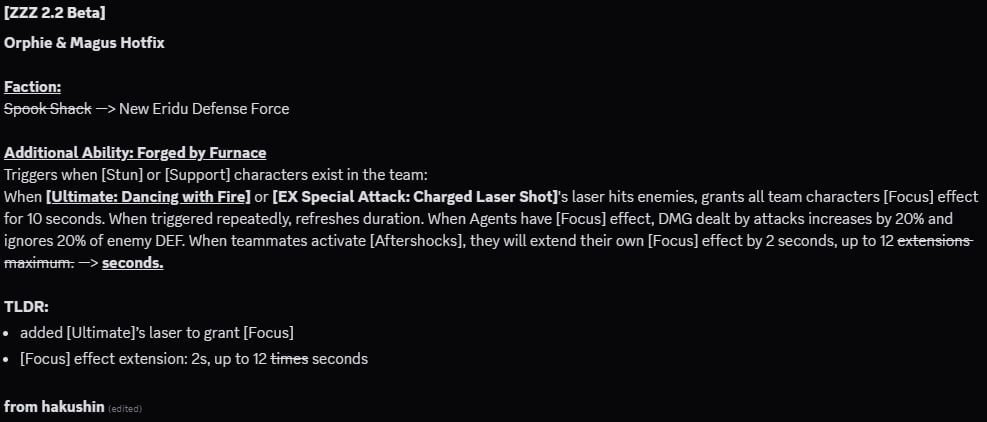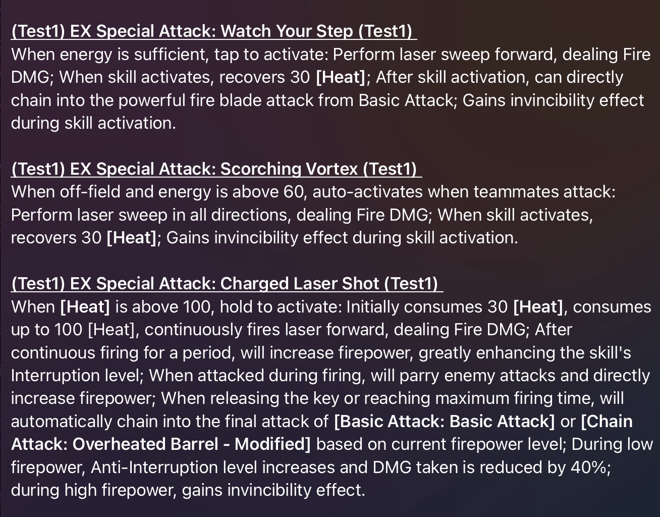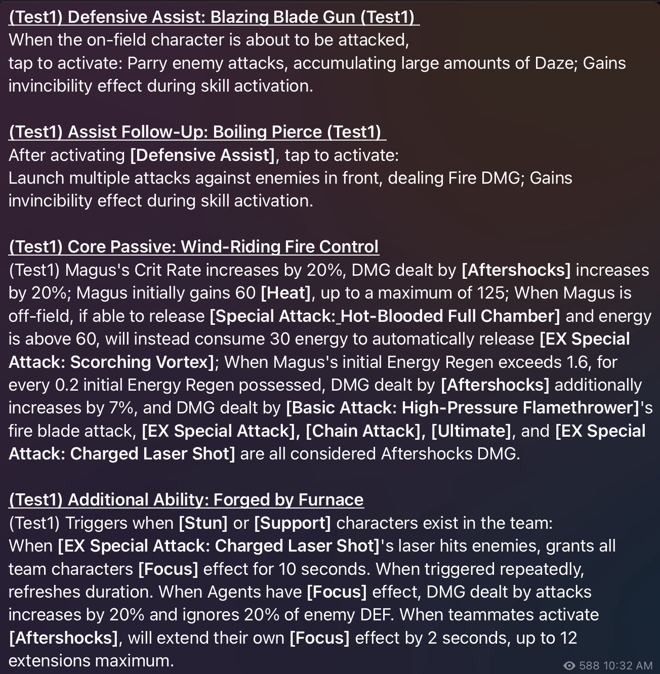 (Test1) Additional Ability: Forged by Furnace (Test1) Triggers when [Stun] or [Support] characters exist in the team: When [Ultimate: Dancing with Fire] or [EX Special Attack: Charged Laser Shot]'s laser hits enemies, grants all team characters [Focus] effect for 12 seconds. When triggered repeatedly, refreshes duration. When Agents have [Focus] effect, DMG dealt by attacks increases by 35% and ignores 25% of enemy DEF. When teammates activate [Aftershocks], will extend their own [Focus] effect by 2 seconds, up to 12 seconds maximum.