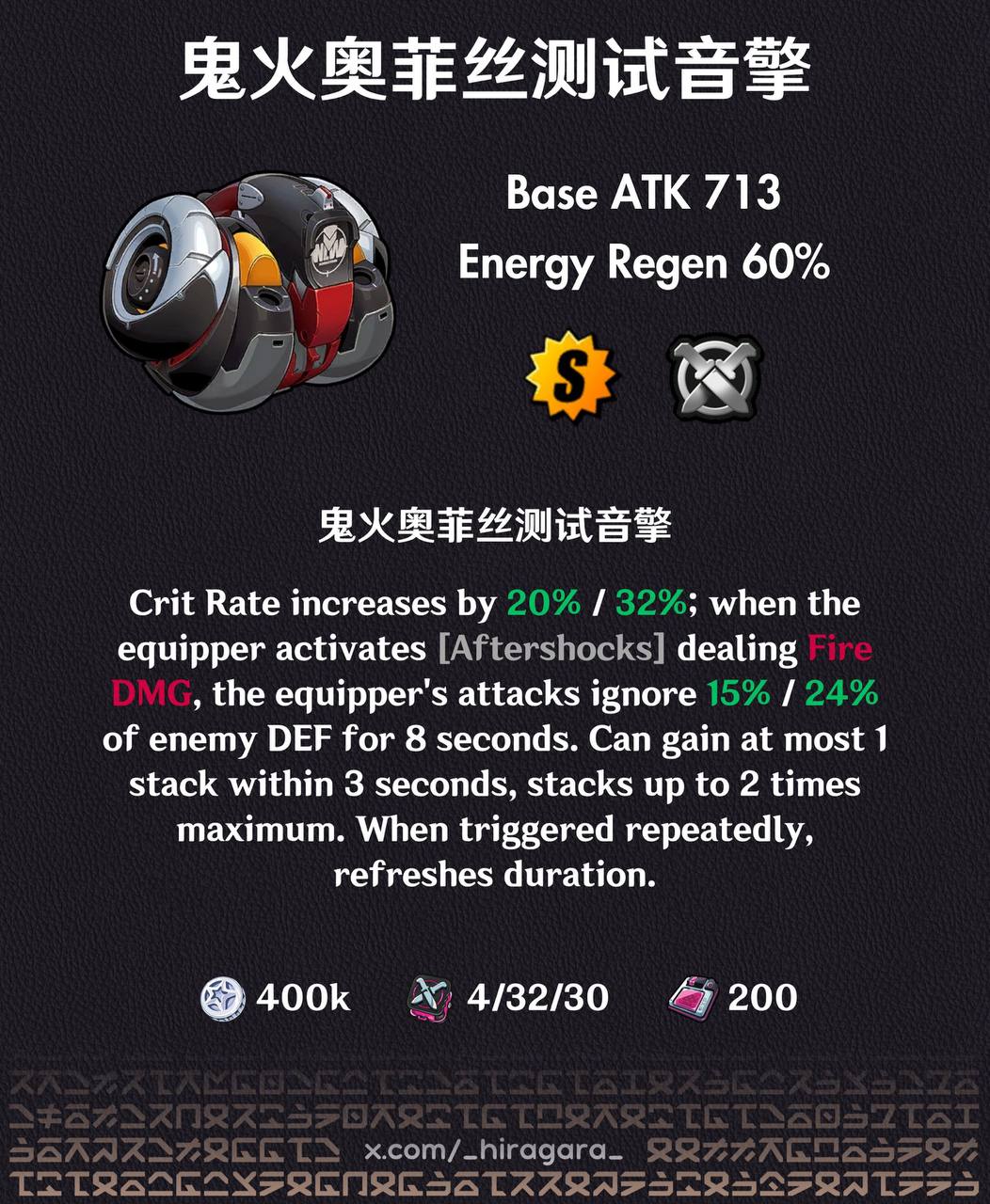 Base ATK : 713 Energy Regen : 60% Crit Rate increases by 20%; when the equipper activates [Aftershocks] dealing Fire DMG, the equipper's attacks ignore 15% of enemy DEF for 8 seconds. Can gain at most 1 stack within 3 seconds, stacks up to 2 times maximum. When triggered repeatedly, refreshes duration.
