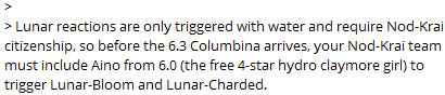 Лунные реакции активируются только водой и требуют гражданства Нод-Край, поэтому до появления Колумбины 6.3 ваша команда Нод-Край должна включить Айно из 6.0 (бесплатную 4-звёздную гидро-девушку-клеймор), чтобы активировать Лунный Цветок и Лунный Чардел.