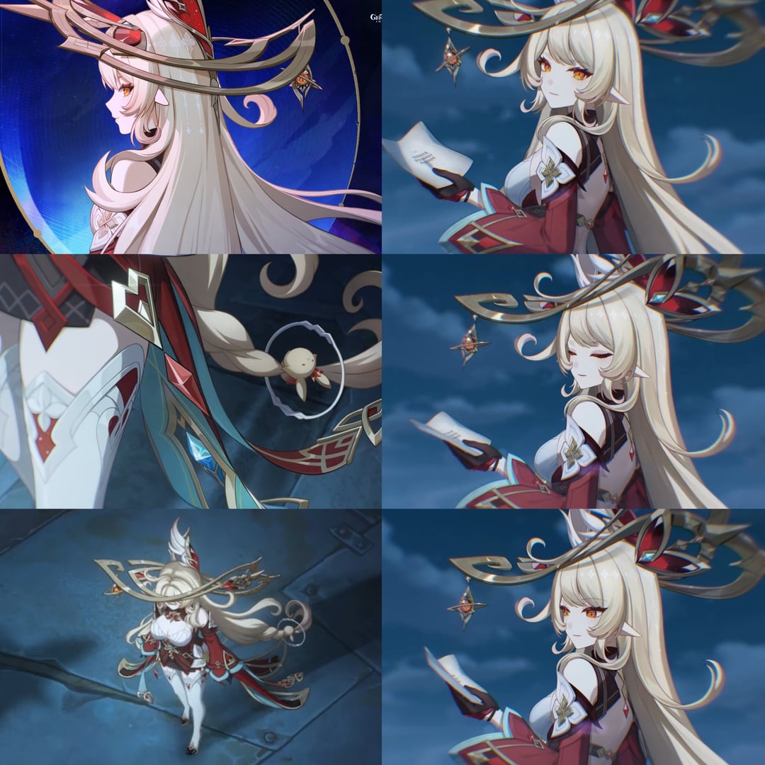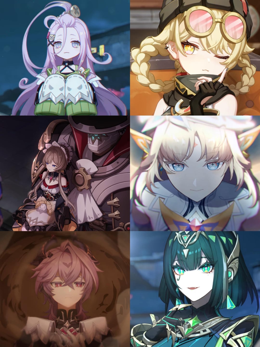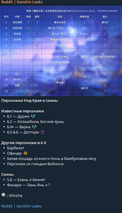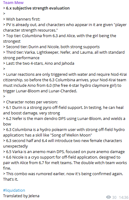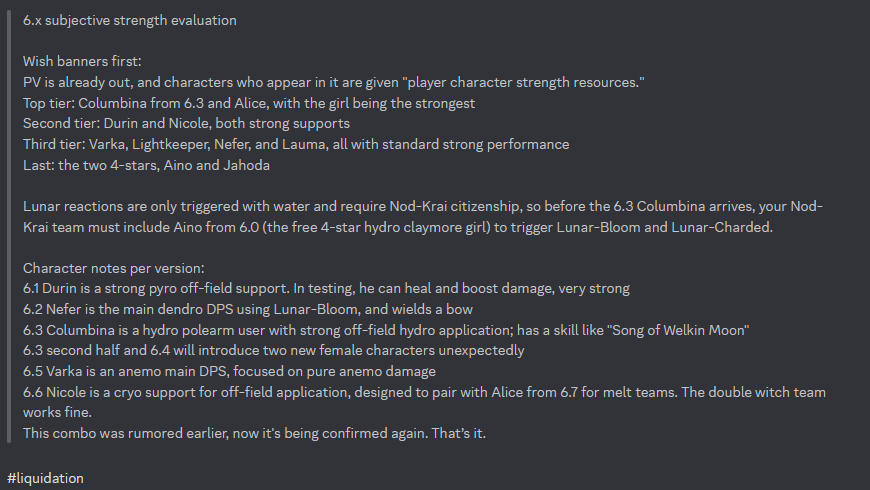 Примечания к персонажам для каждой версии: 6.1 Дурин — сильный пиро-саппорт вне поля. В тестировании он может исцелять и усиливать урон, очень силён. 6.2 Нефер — основной боец дендро, использующий Лунный Цветок, и вооружённый луком. 6.3 Колумбина — владелица гидрокопья с сильным гидроприменением вне поля; обладает навыком, подобным «Песне Велькинской Луны». Во второй половине 6.3 и 6.4 неожиданно появятся два новых женских персонажа. 6.5 Варка — основной боец анемо, сосредоточенный на чистом анемо-уроне. 6.6 Николь — крио-поддержка для применения вне поля, разработанная для парной игры с Алисой из 6.7 в командах, использующих расплавленные магические способности. Команда из двух ведьм отлично работает. Слухи об этой комбинации ходили и раньше, теперь её снова подтверждают. Вот и всё.