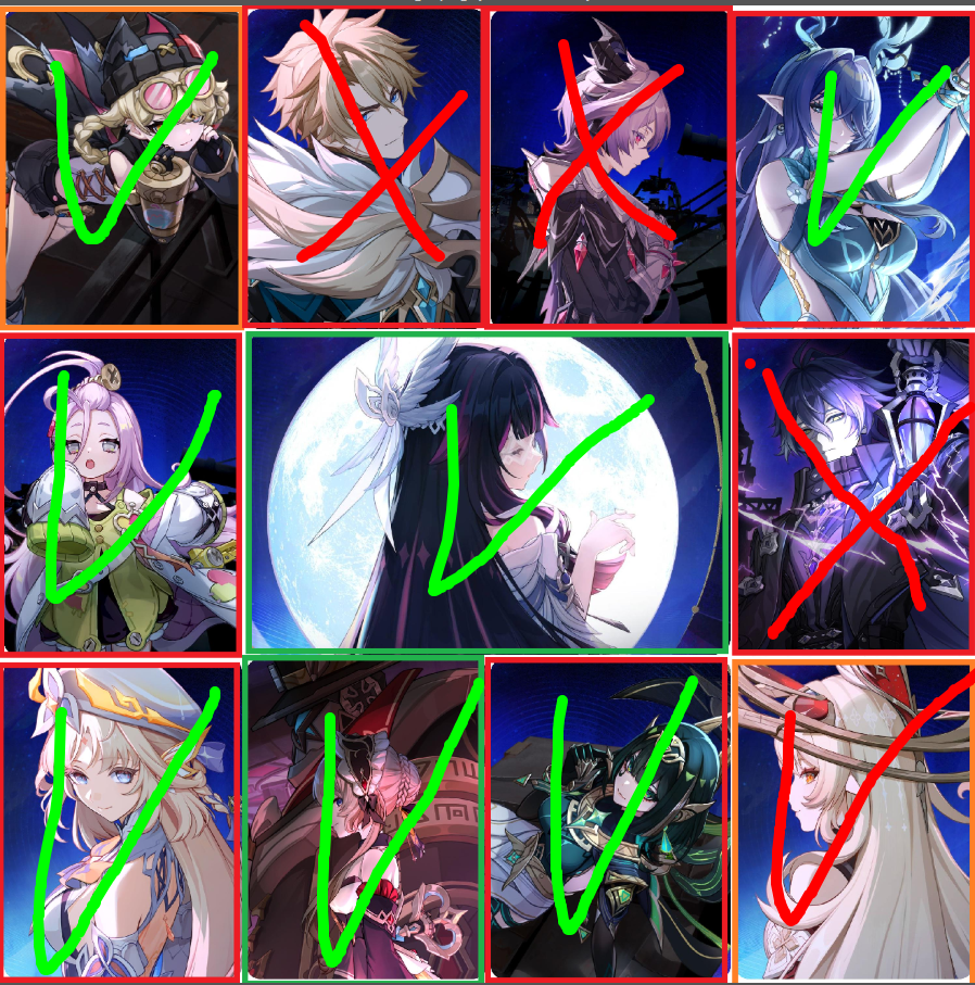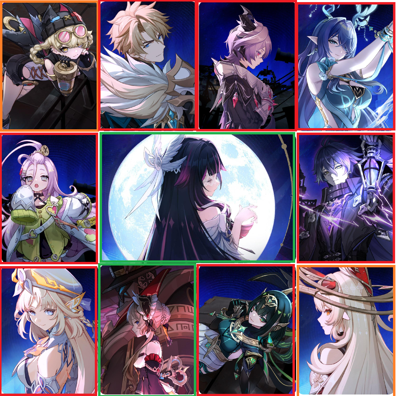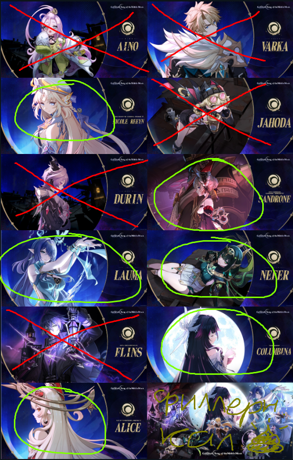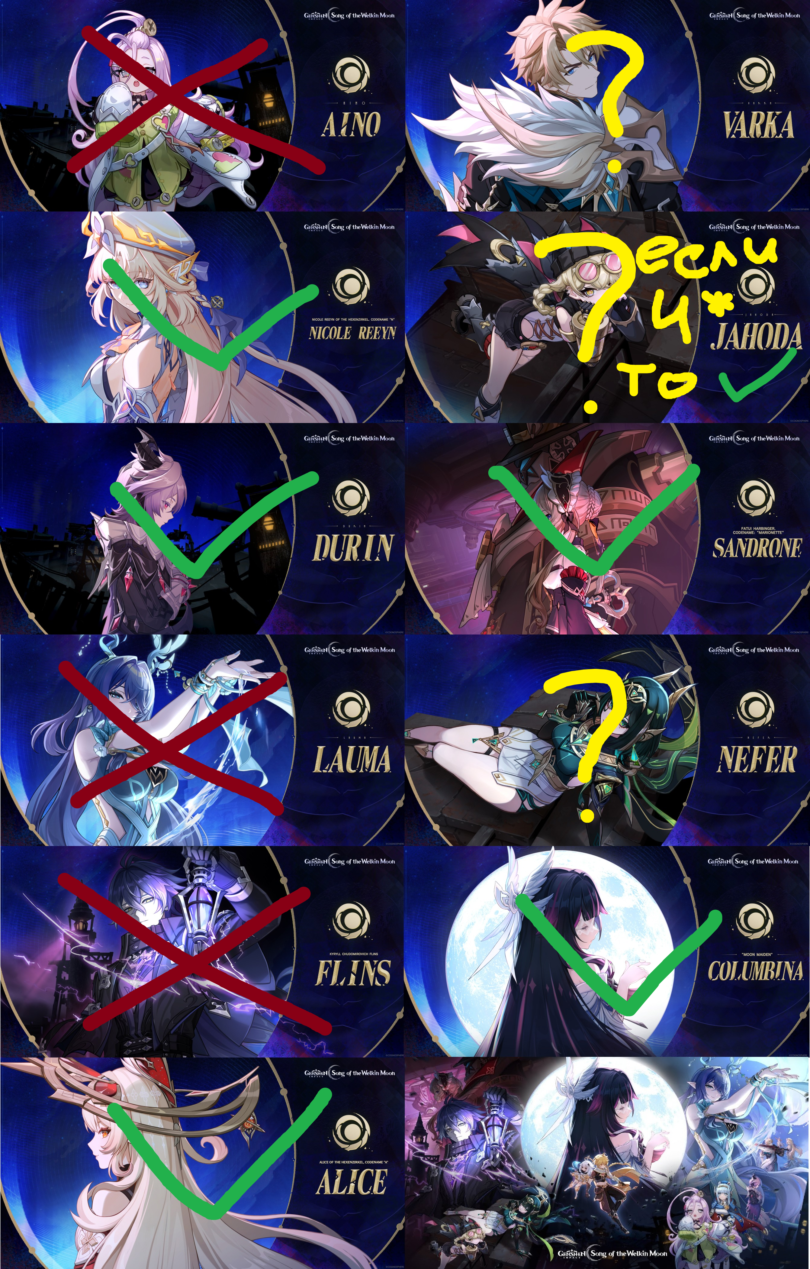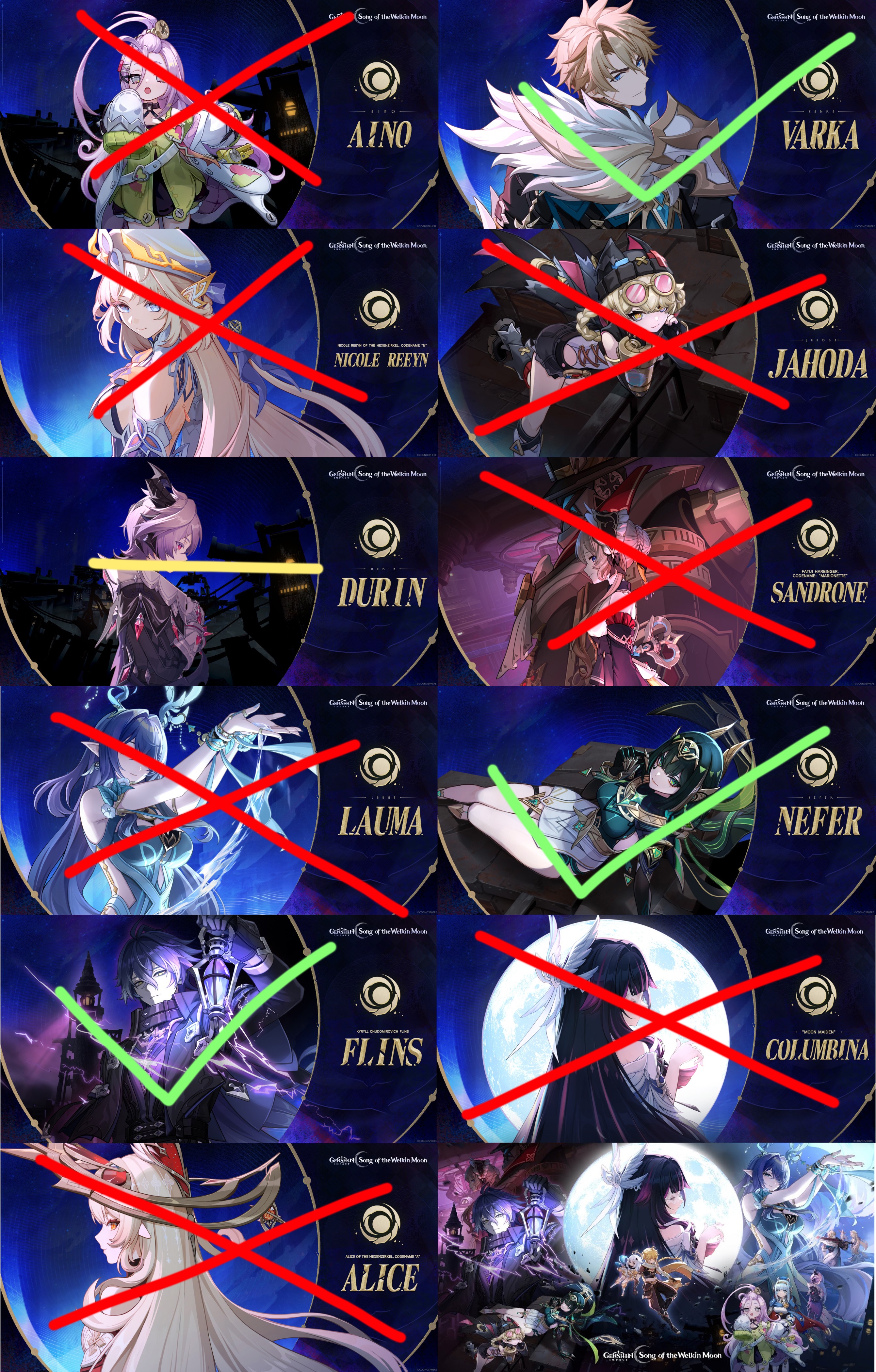 Высший уровень: Колумбина из 6.3 и Алиса, причём девушка — самая сильная. Второй уровень: Дурин и Николь, оба сильные саппорты. Третий уровень: Варка, Флинс, Нефер и Лаума, все со стандартной сильной эффективностью. Последний уровень: два 4-звёздочных персонажа, Айно и Джахода.
