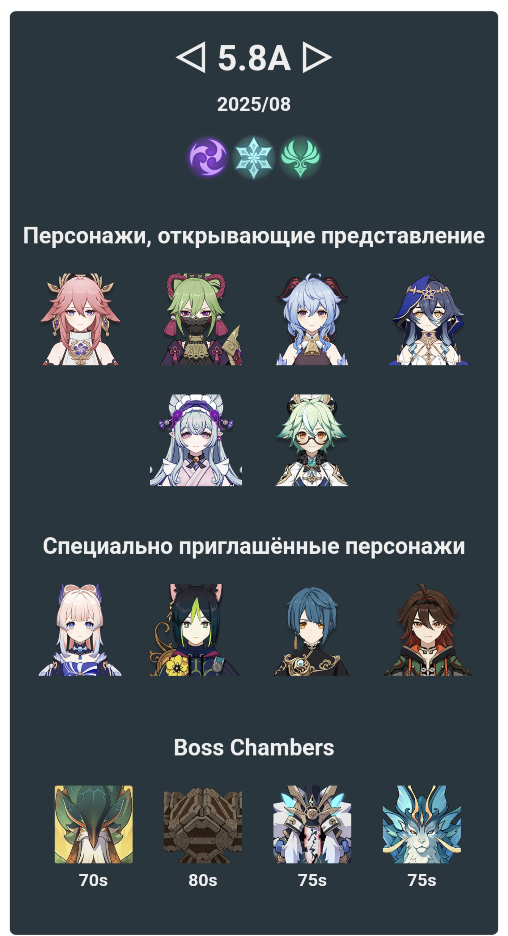 ✦ Показать персонажей картинкой https://akasha.cv/ (включая лидерборды по сборкам персонажей) ∙ https://enka.network/