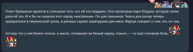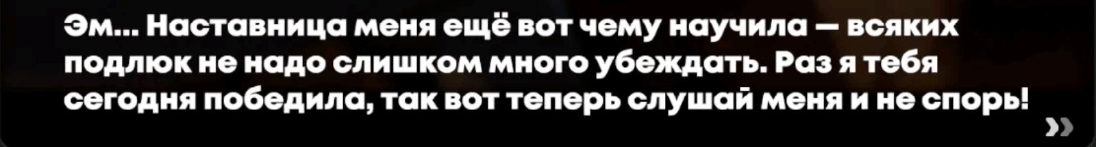 >>5300433 >На её флирт естественно плевать, ибо флиртует она со всеми, это часть её характера Вот тут у тебя и дыра в логике, чел. Флиртует-то она со всеми, вот только отдачу на этот флирт - такую, чтобы у нее самой в груди ворохнулось, и заставило ее саму иначе на этот флирт взглянуть - ей может дать только гг. Нам прямым текстом намекают, что развести ее на очень банальные бытовые вещи дорого стоит, потому что она вот такая вот, необычная. И гг это делает.