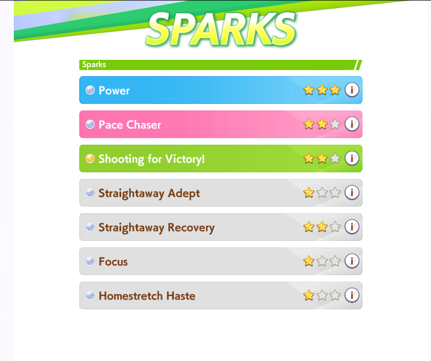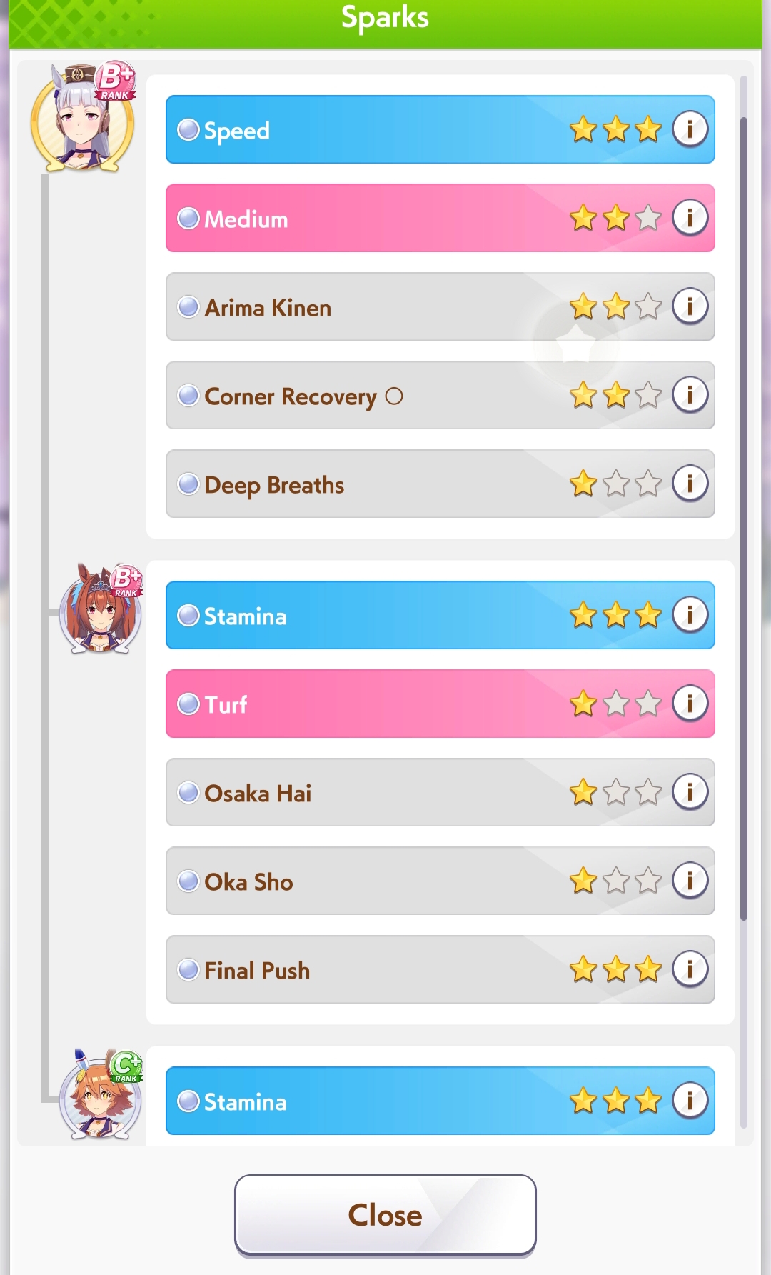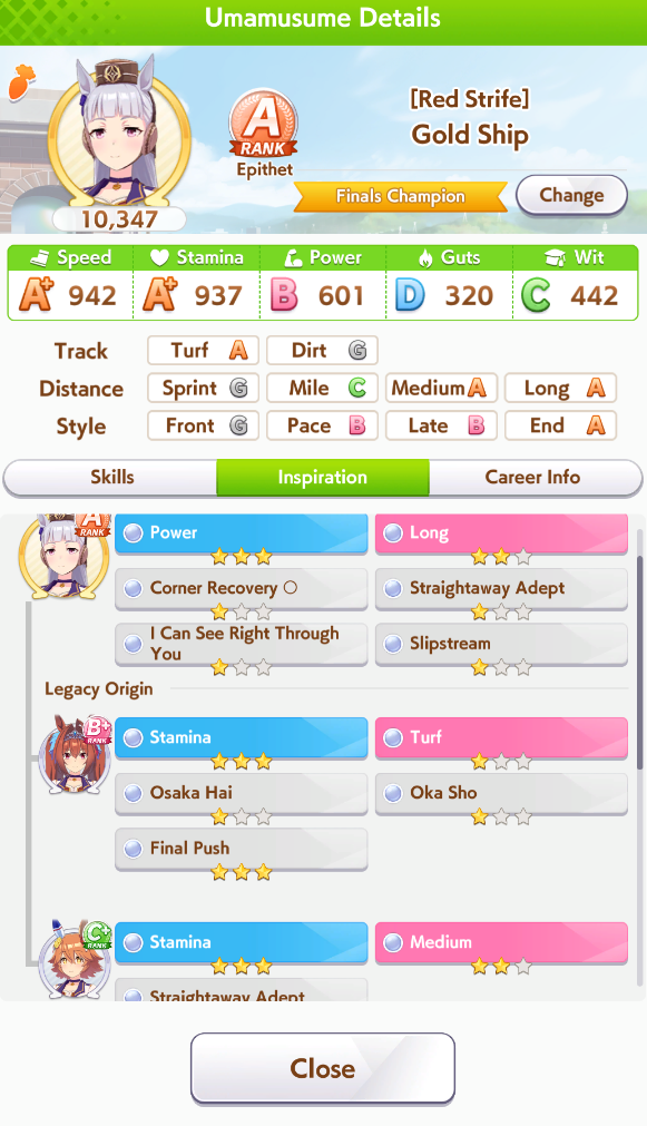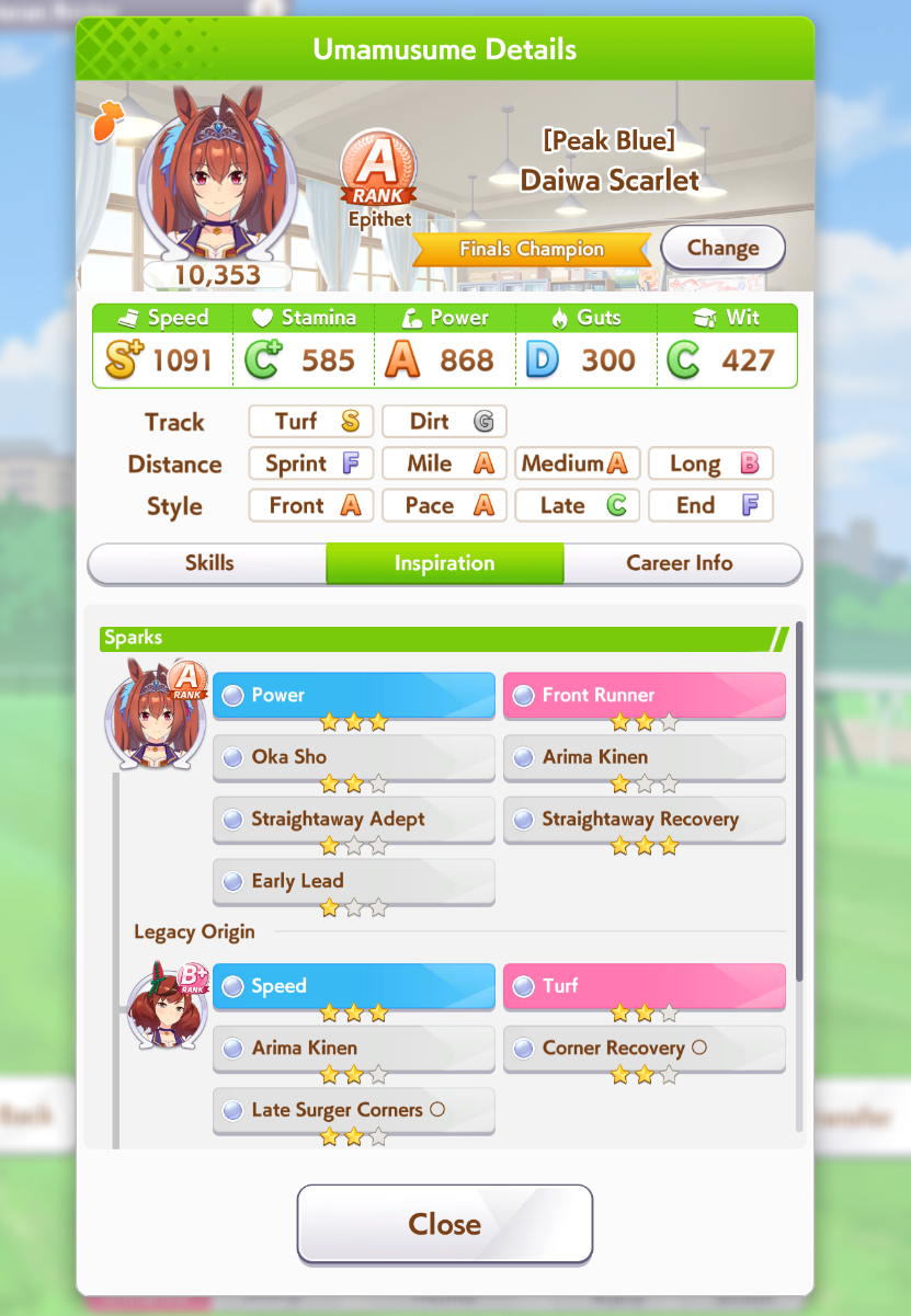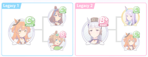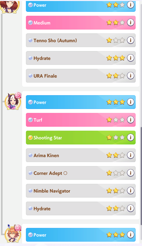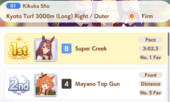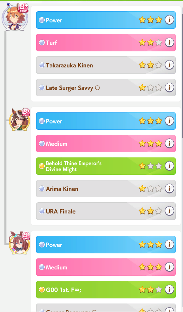 Wit Fine Motion > Mr. C.B. 9 november 2022 > Mejiro Ramonu 24 february 2023 > Daiwa Scarlet 29 october 2024 Stamina Super Creek > Sounds of Earth 20 november 2023 > Air Shakur 29 october 2024 Guts Ines Fujin > K.S.Miracle 30 january 2023 > Orfevre 24 february 2024 Speed Kitasan > Maruzensky 29 july 2022 > Agnes Tachyon 24 august 2022 > Jungle Pocket 19 may 2023 > El Condor Pasa 23 august 2023(OP) > Still in Love 24 august 2024