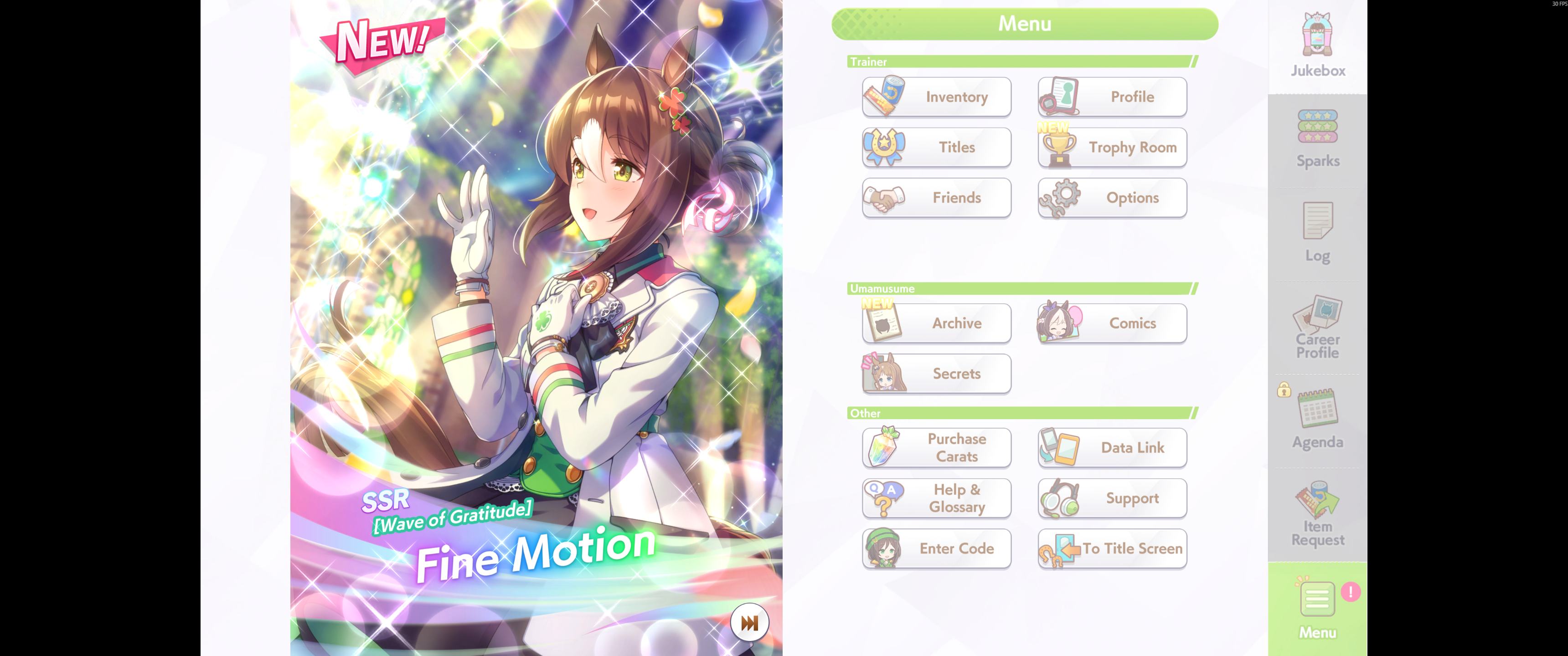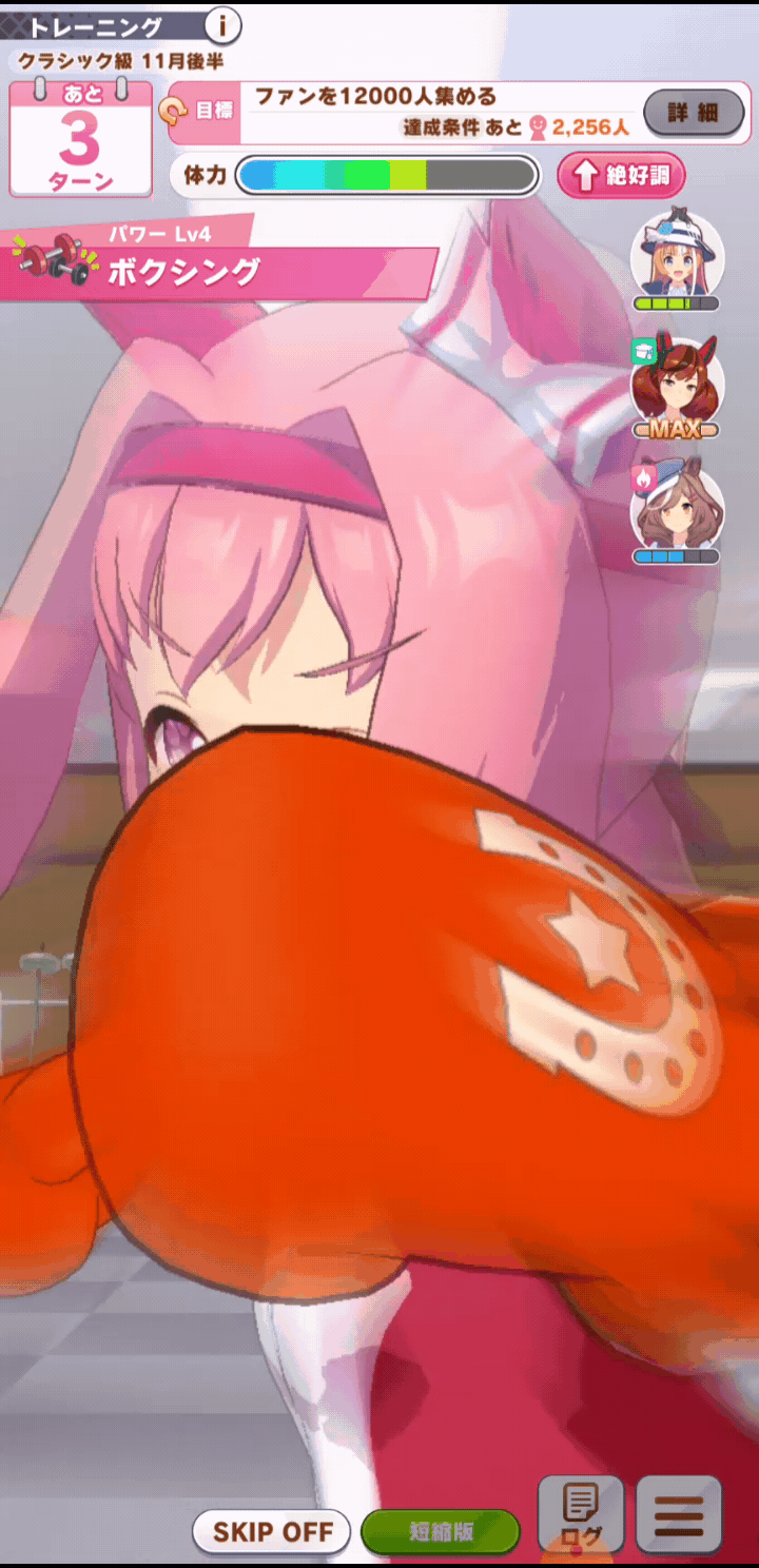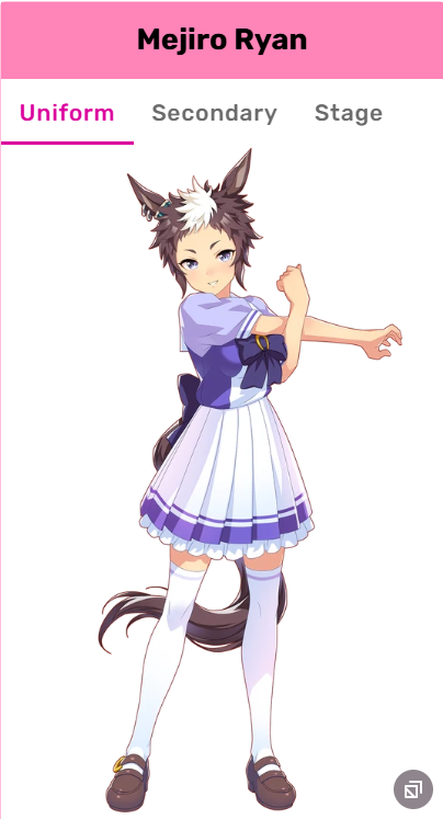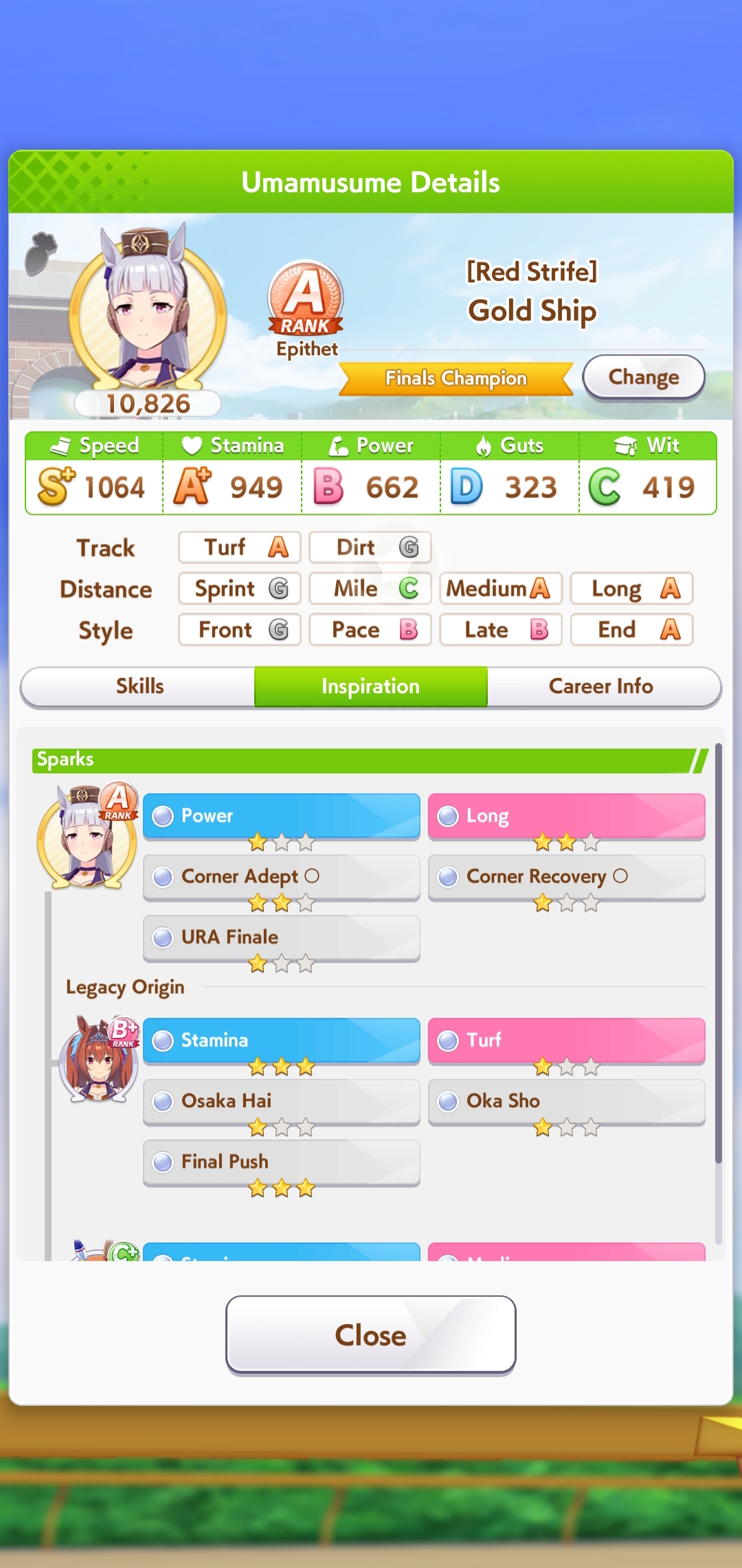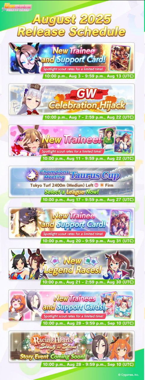 Wit Fine Motion > Mr. C.B. 9 november 2022 > Mejiro Ramonu 24 february 2023 > Daiwa Scarlet 29 october 2024 Stamina Super Creek > Sounds of Earth 20 november 2023 > Air Shakur 29 october 2024 Guts Ines Fujin > K.S.Miracle 30 january 2023 > Orfevre 24 february 2024 Speed Kitasan > Maruzensky 29 july 2022 > Agnes Tachyon 24 august 2022 > Jungle Pocket 19 may 2023 > El Condor Pasa 23 august 2023(OP) > Still in Love 24 august 2024