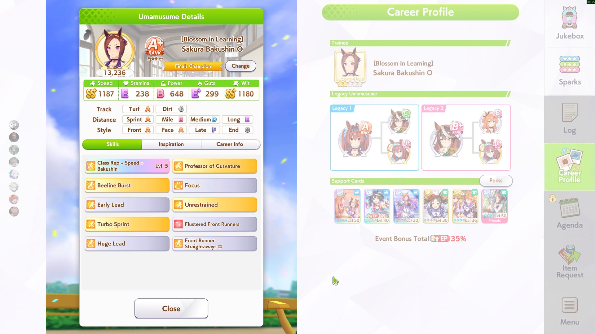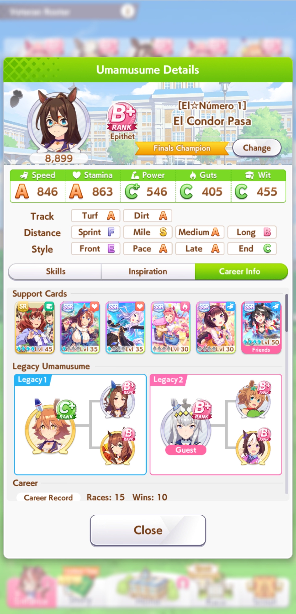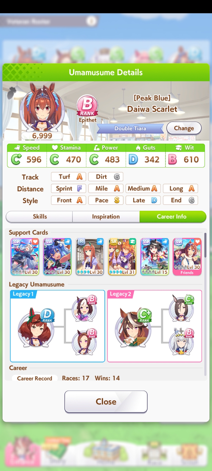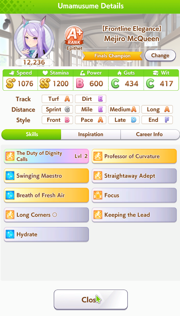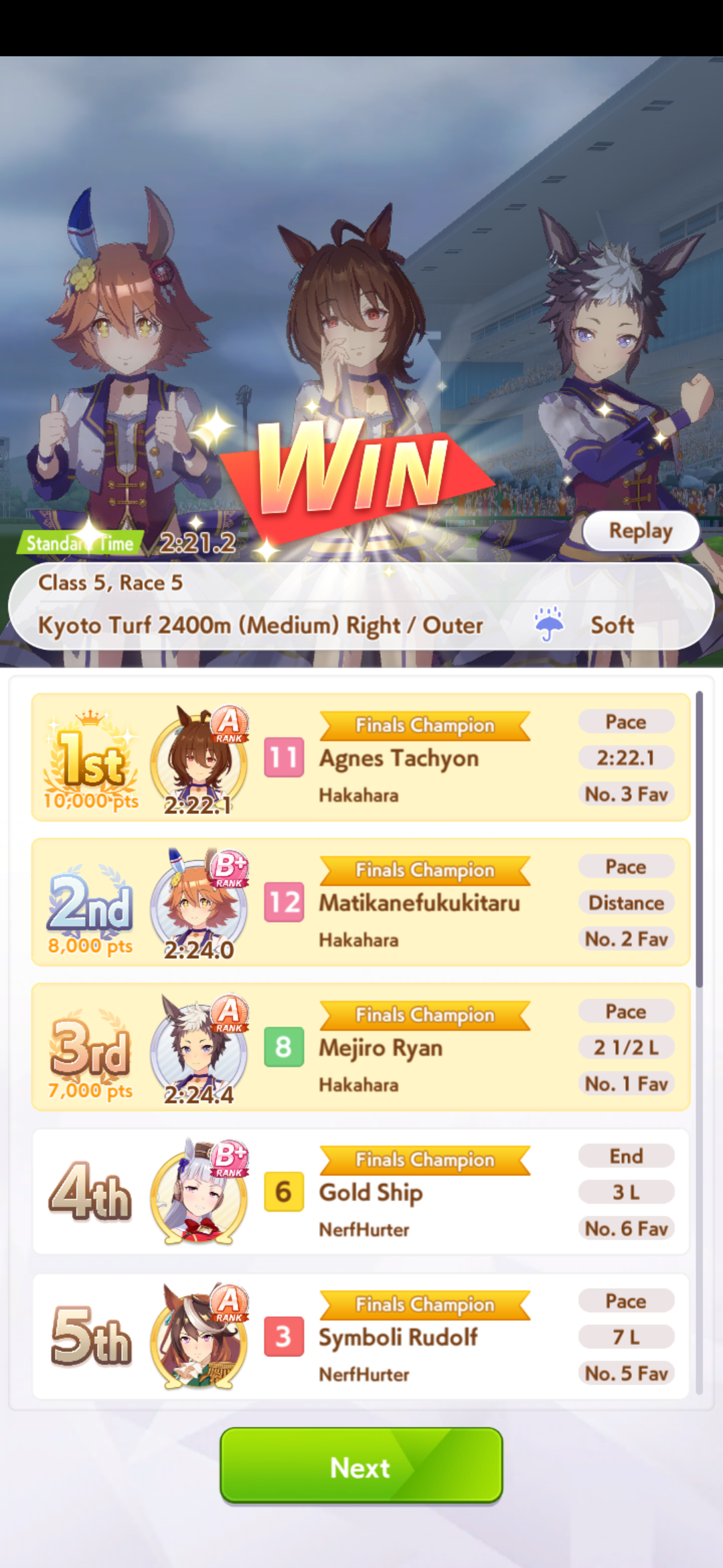 Всё-таки млбшная Китасан взятая у китовичков делает вещи. Даже на столько криво вкачаная Кинг смогла Уру пройти, да еще и не истратив практически ни одного будильника халявный не в счет. Таки шестая закомплитленая карьера из 60 всего, можно сказать символично, но не думал что это так тяжело будет.