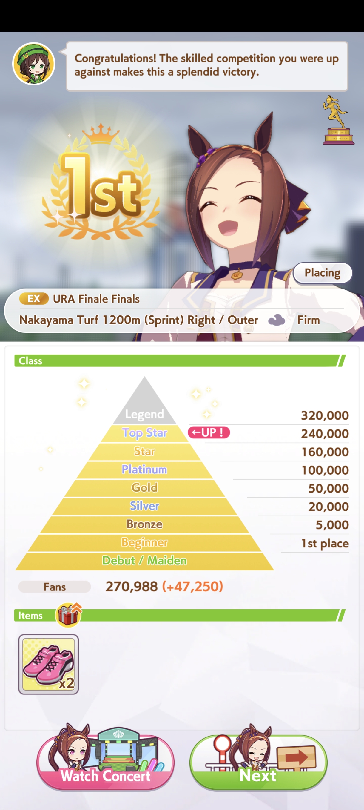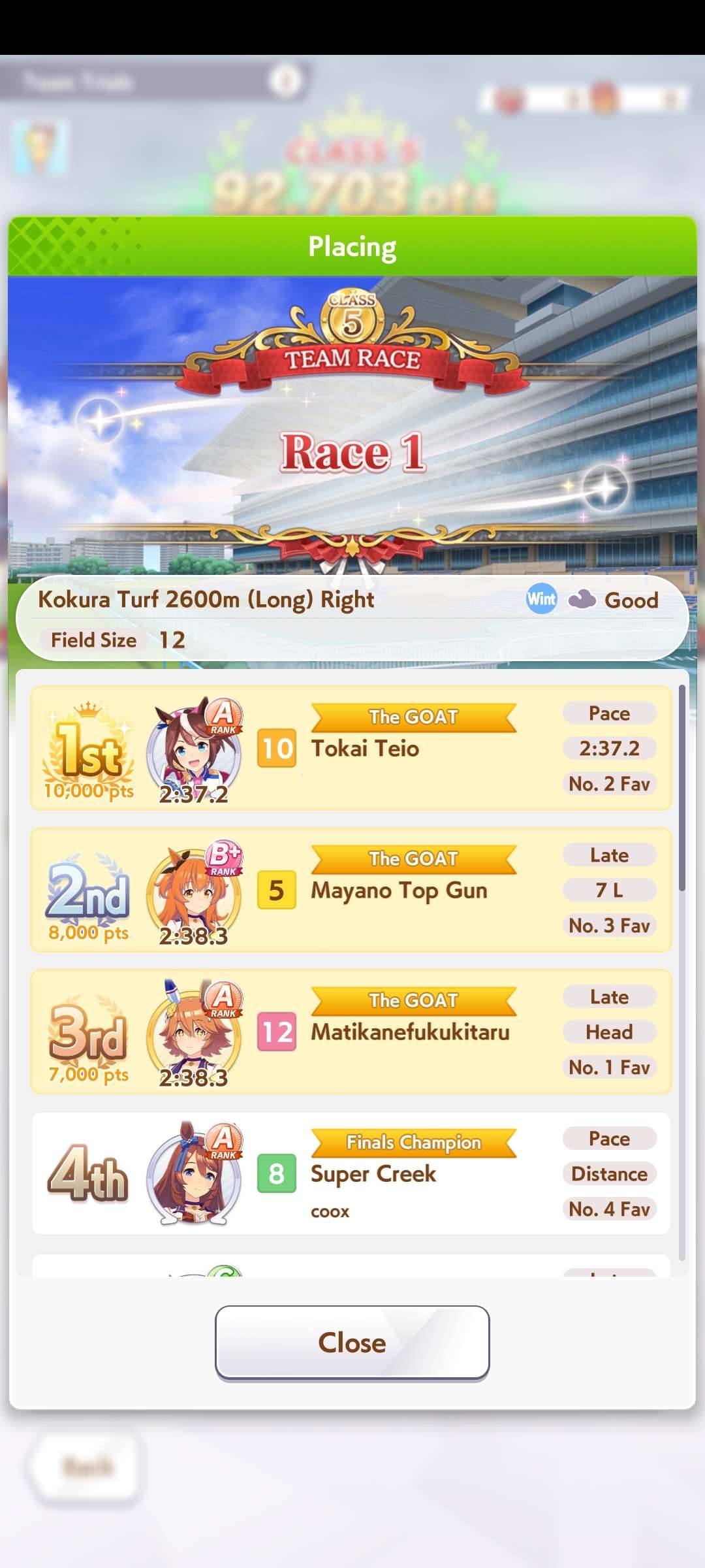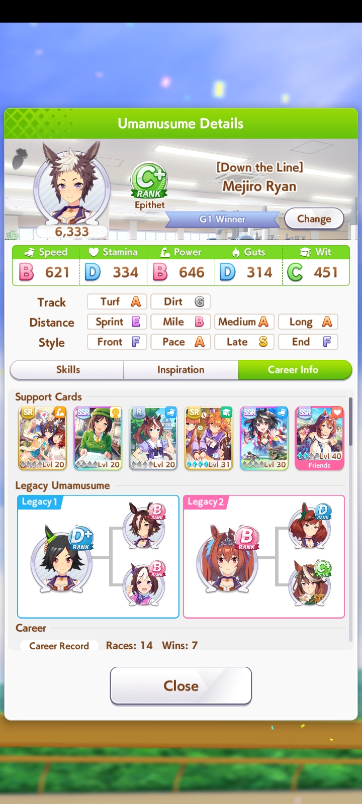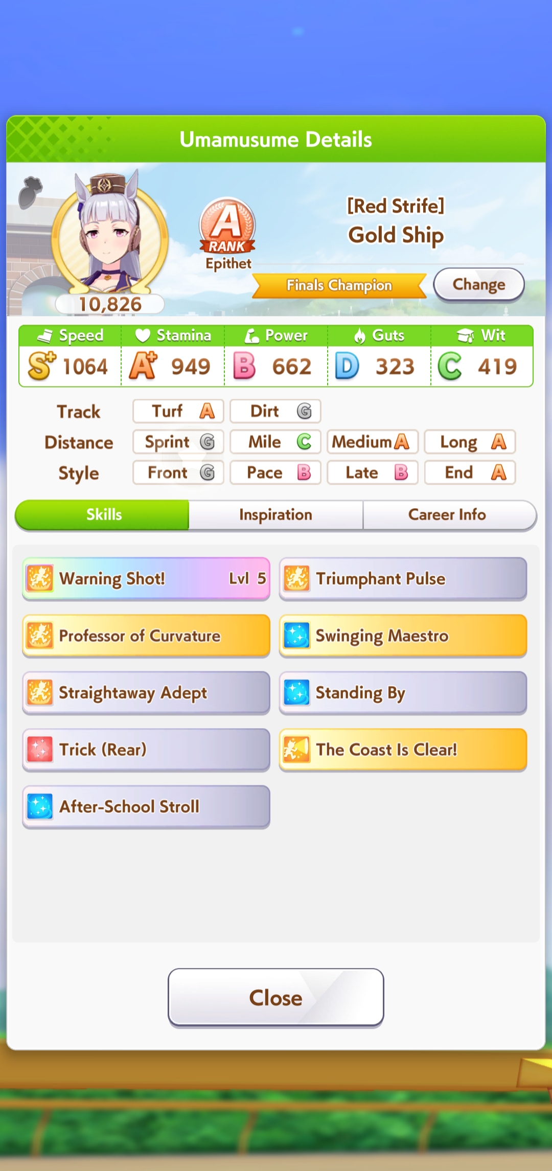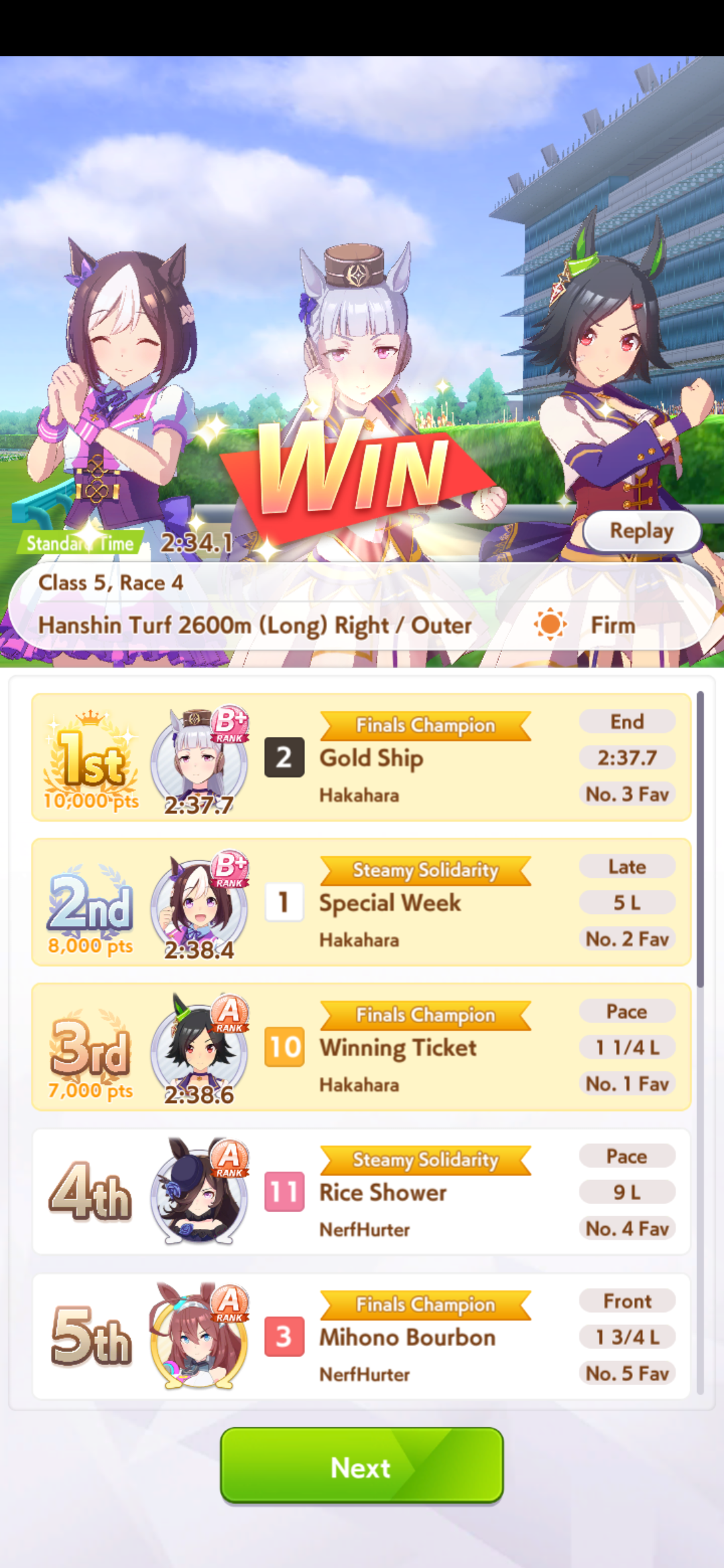 Всё-таки млбшная Китасан взятая у китовичков делает вещи. Даже на столько криво вкачаная Кинг смогла Уру пройти, да еще и не истратив практически ни одного будильника халявный не в счет. Таки шестая закомплитленая карьера из 60 всего, можно сказать символично, но не думал что это так тяжело будет.
