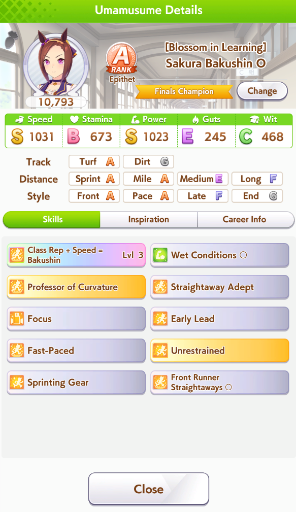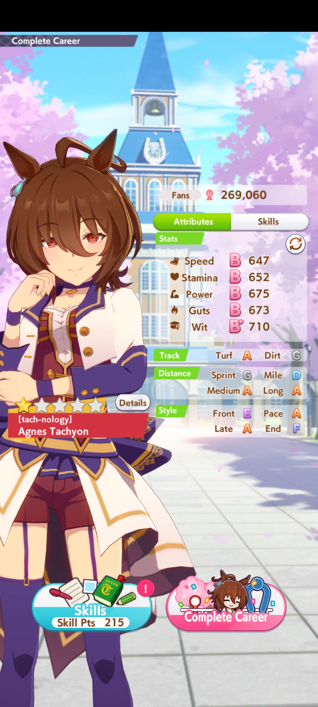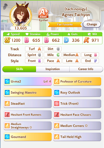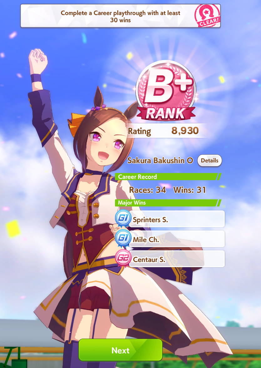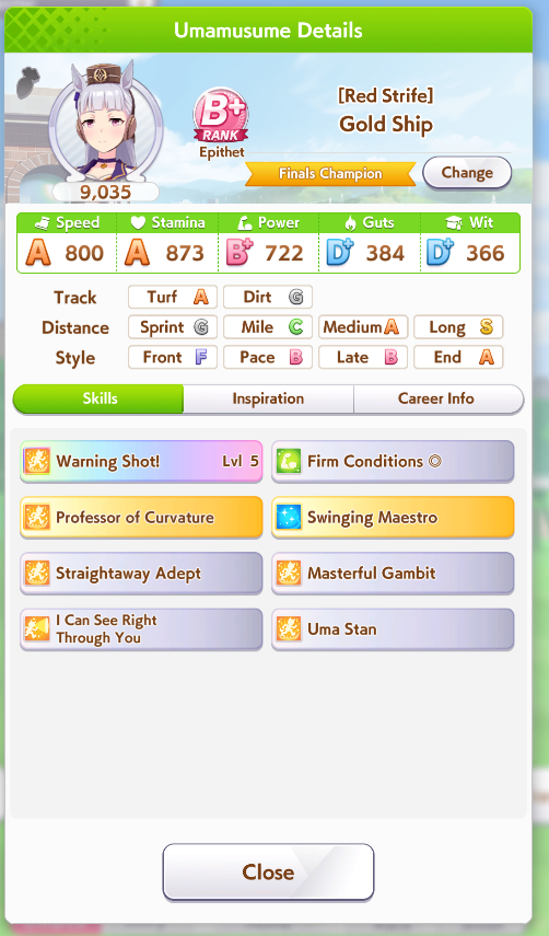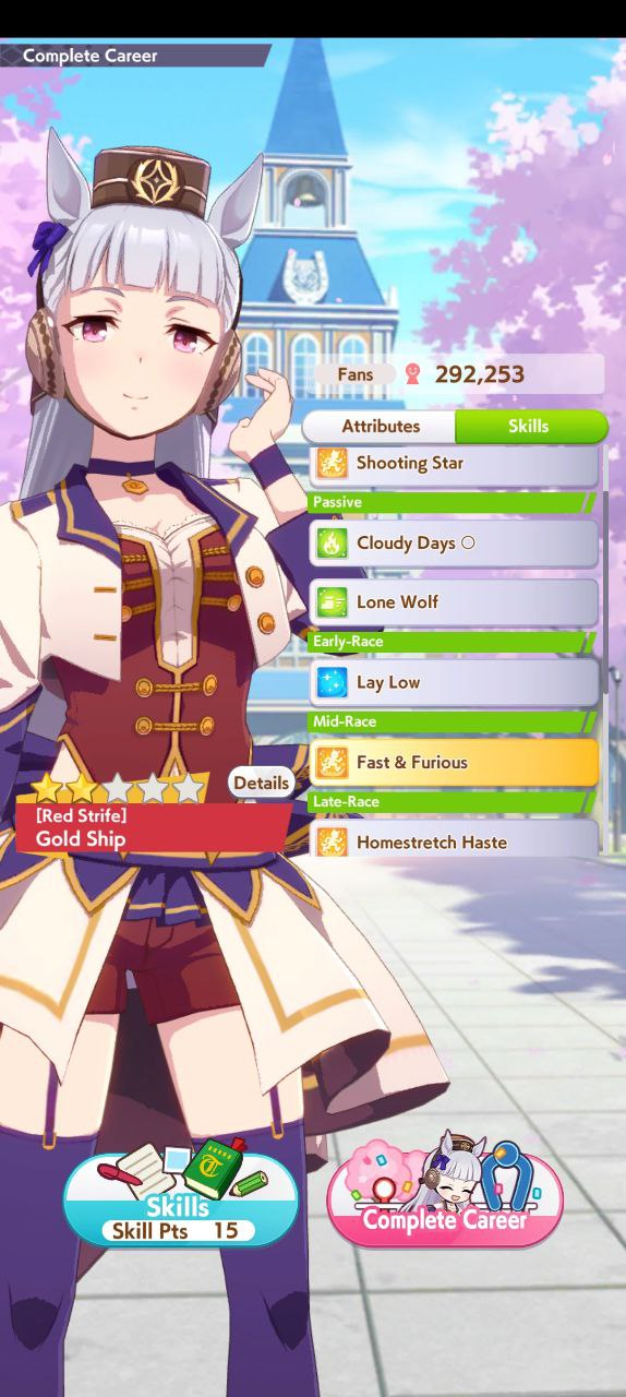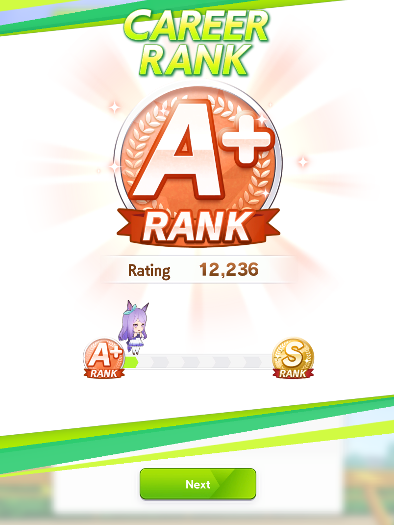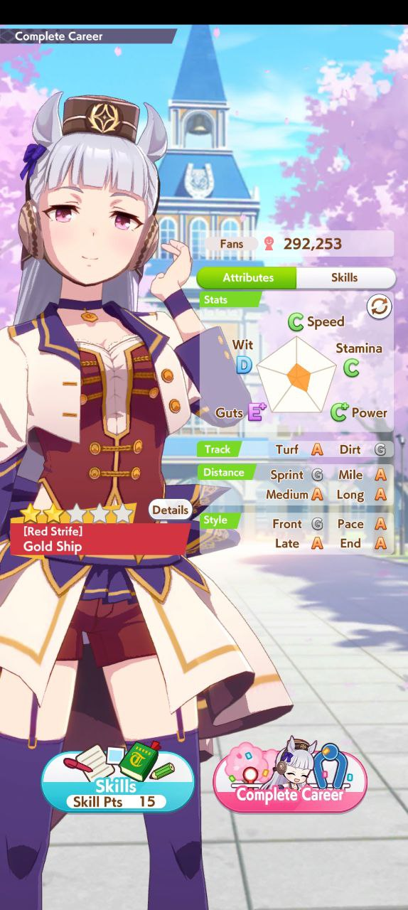По ощущениям спида можно было и больше вкачать, намерено пропустил как минимум две радужные тренировки на 20-30 очков, где-то с середины карьеры началось просто дичайшее проседание по стамине, всё боялся что её не хватит и останусь у разбитого корыта, приходилось жать на свои +13 на тренировке. Приходилось практически одну стамину тренировать и всё-равно отставание не покрылось нормально. Ну и карьера у неё немножко дебильная, как уже упоминали, чистого спринтера не построить на ней, спасибо хоть Ариму бежать и побеждать не заставляют еще.