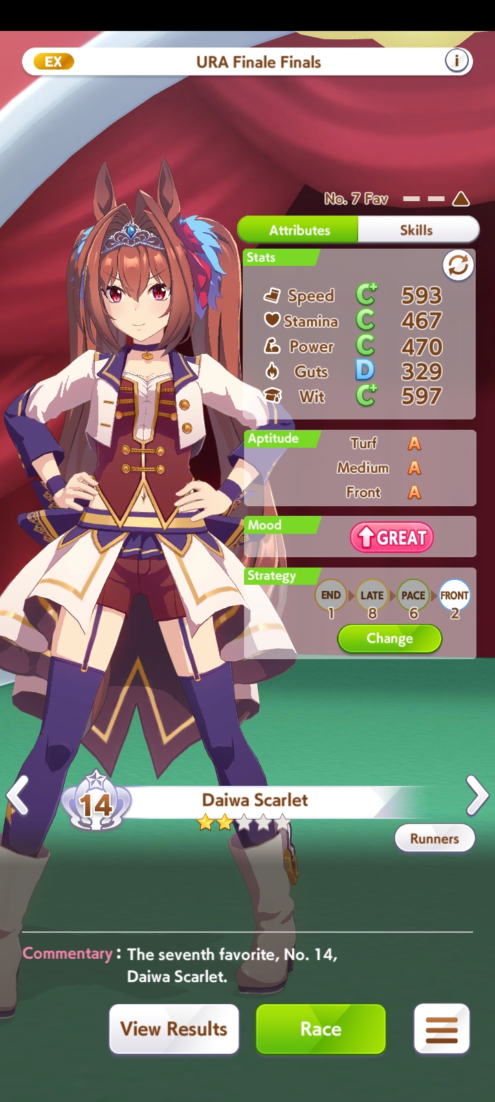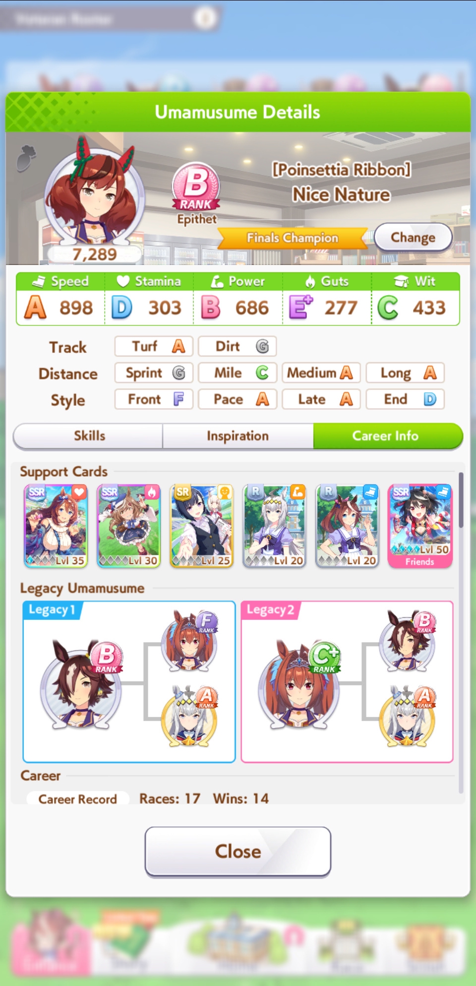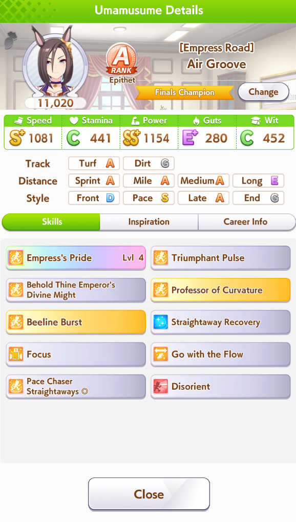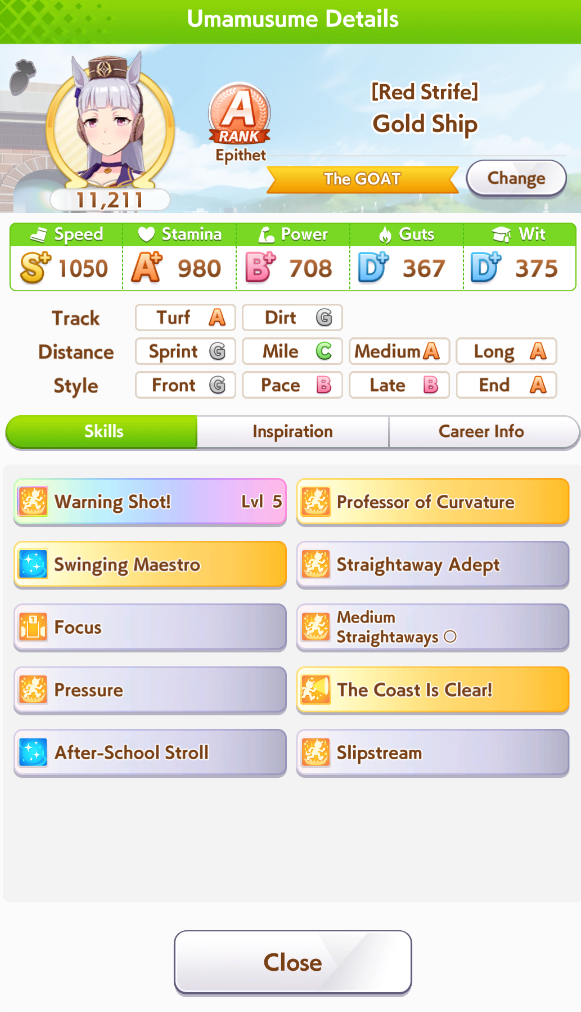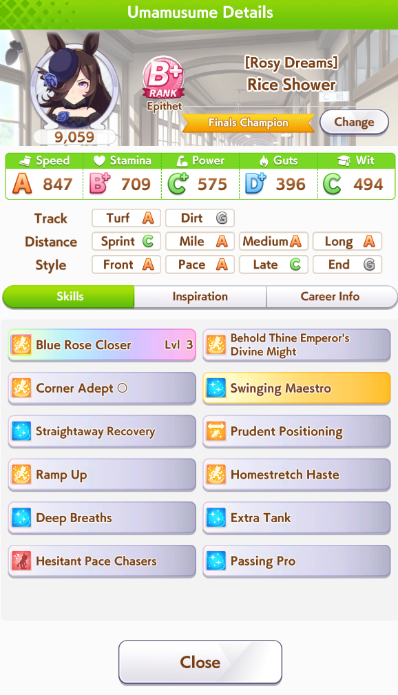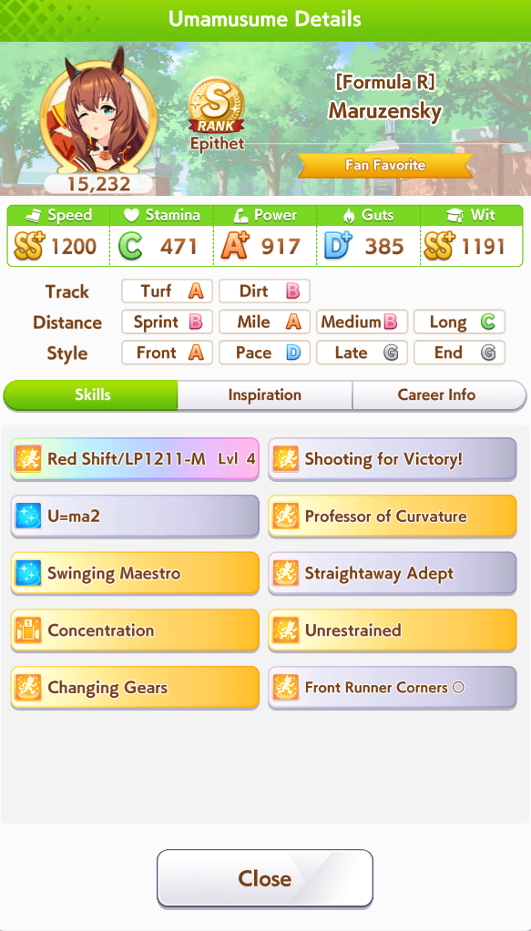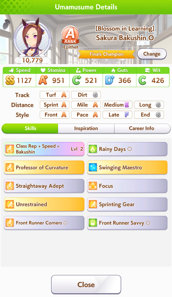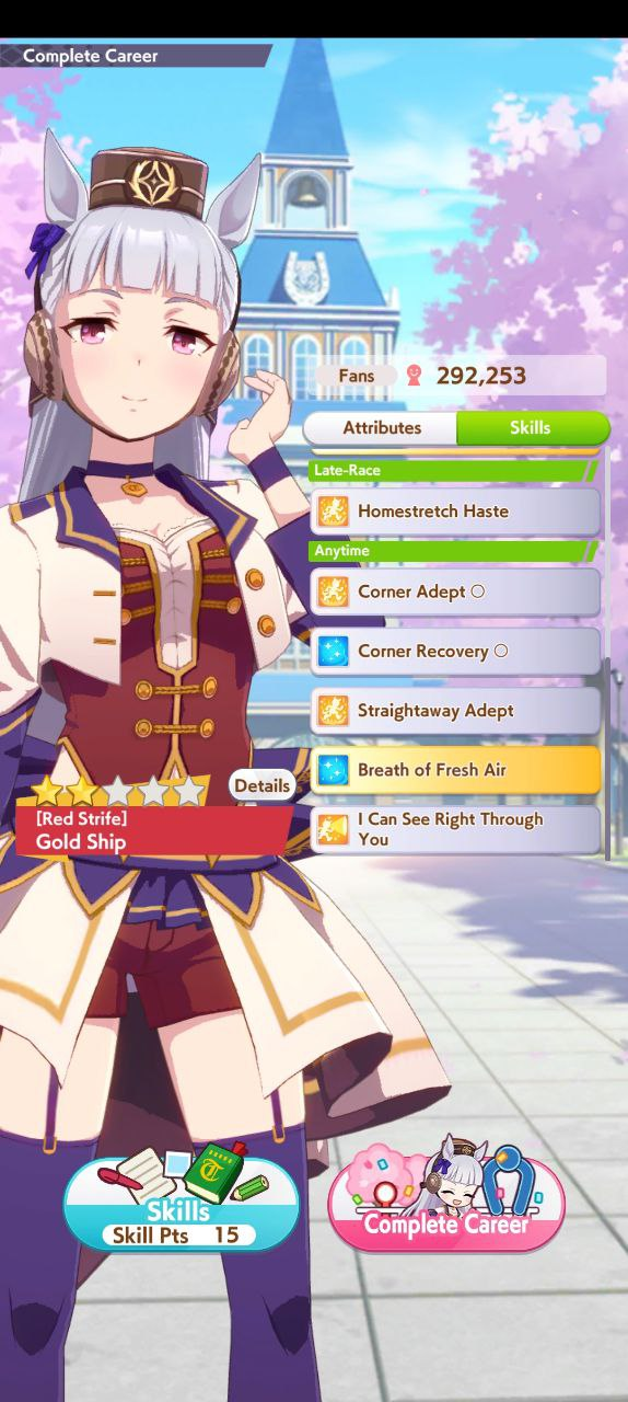 По ощущениям спида можно было и больше вкачать, намерено пропустил как минимум две радужные тренировки на 20-30 очков, где-то с середины карьеры началось просто дичайшее проседание по стамине, всё боялся что её не хватит и останусь у разбитого корыта, приходилось жать на свои +13 на тренировке. Приходилось практически одну стамину тренировать и всё-равно отставание не покрылось нормально. Ну и карьера у неё немножко дебильная, как уже упоминали, чистого спринтера не построить на ней, спасибо хоть Ариму бежать и побеждать не заставляют еще.