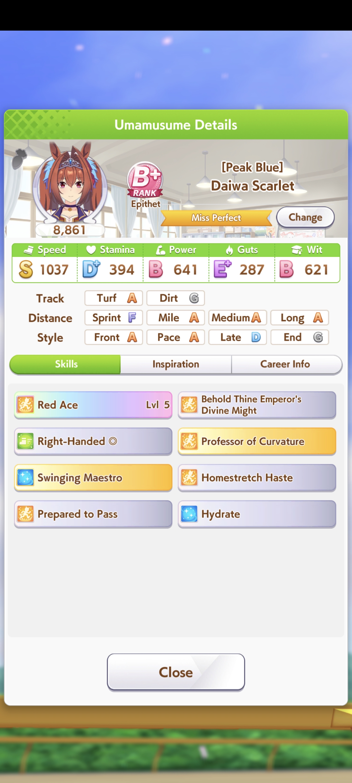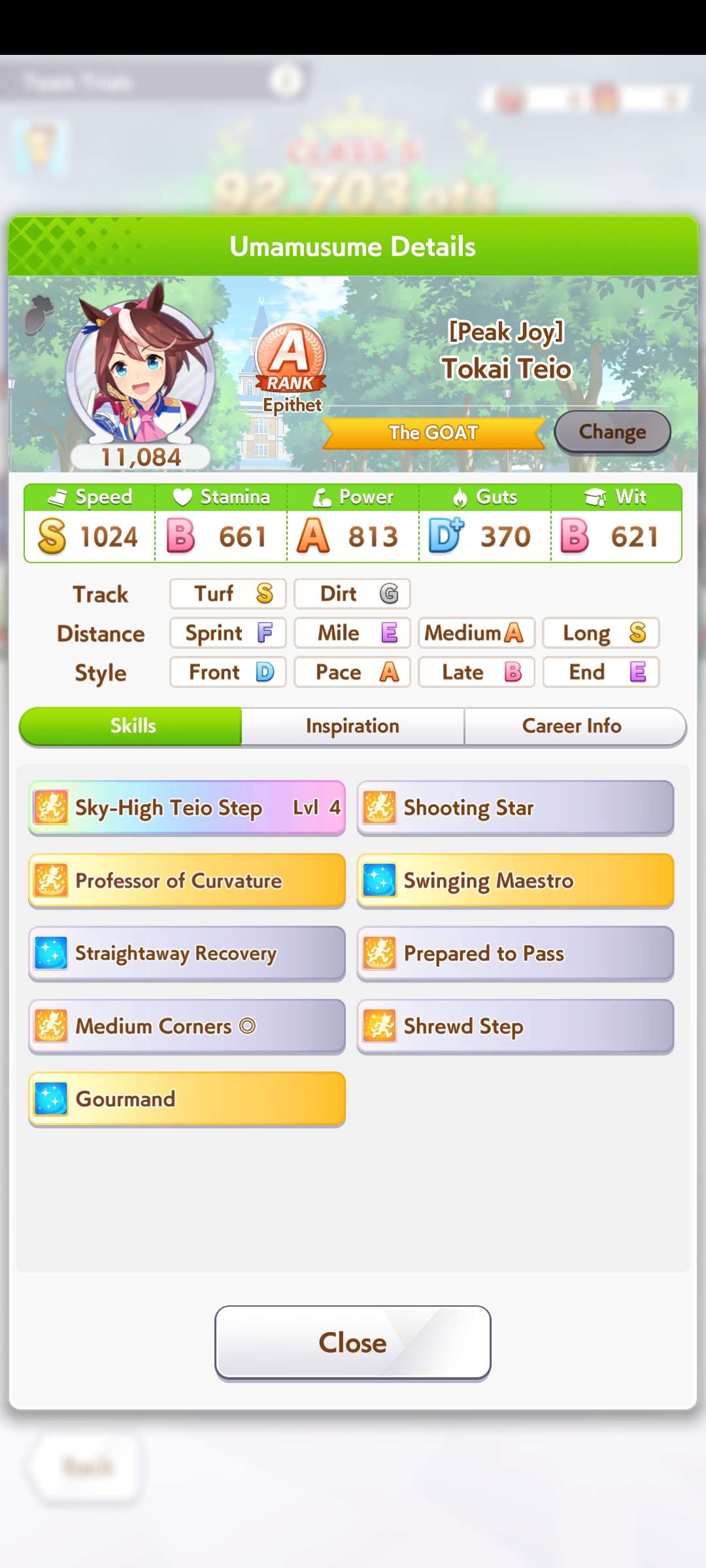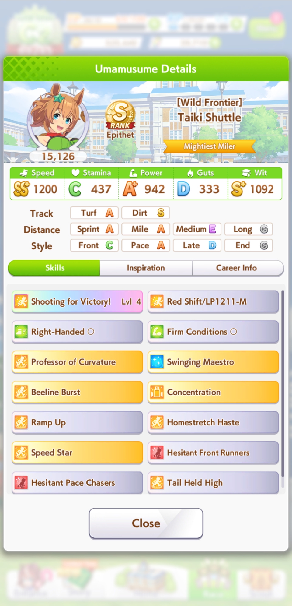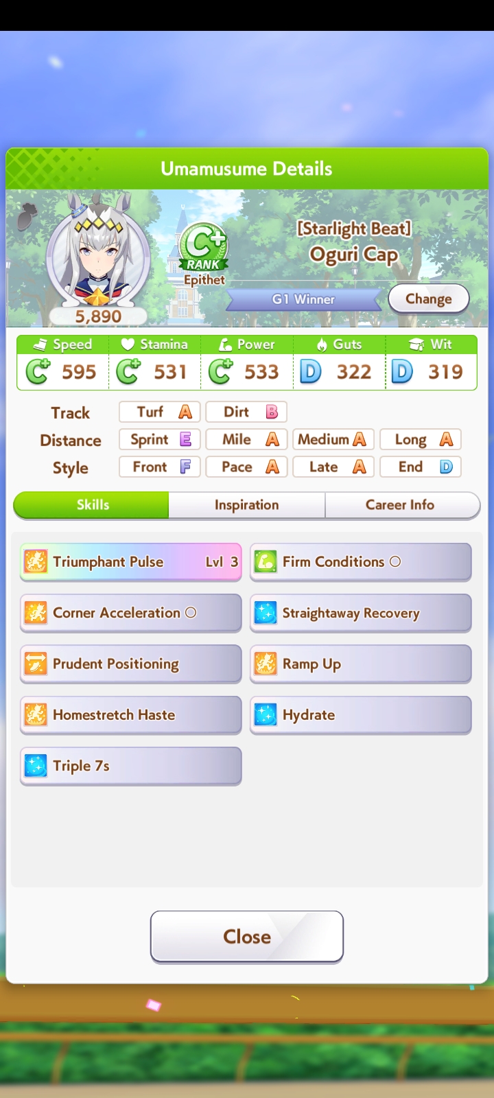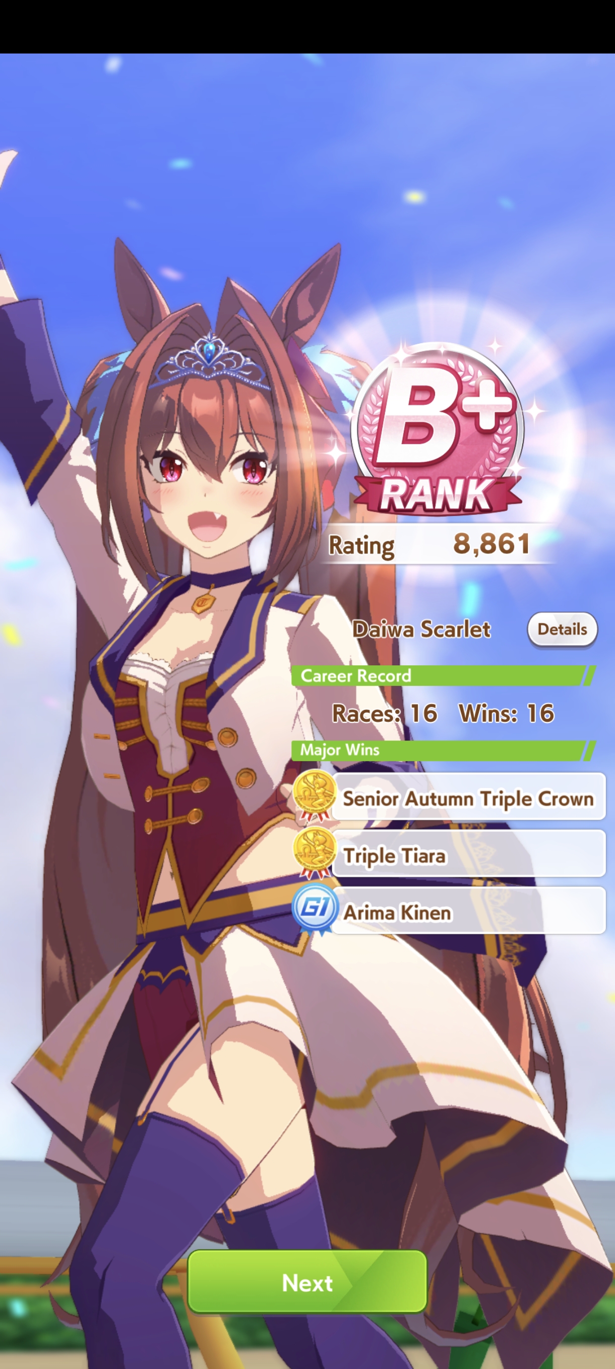 По ощущениям спида можно было и больше вкачать, намерено пропустил как минимум две радужные тренировки на 20-30 очков, где-то с середины карьеры началось просто дичайшее проседание по стамине, всё боялся что её не хватит и останусь у разбитого корыта, приходилось жать на свои +13 на тренировке. Приходилось практически одну стамину тренировать и всё-равно отставание не покрылось нормально. Ну и карьера у неё немножко дебильная, как уже упоминали, чистого спринтера не построить на ней, спасибо хоть Ариму бежать и побеждать не заставляют еще.