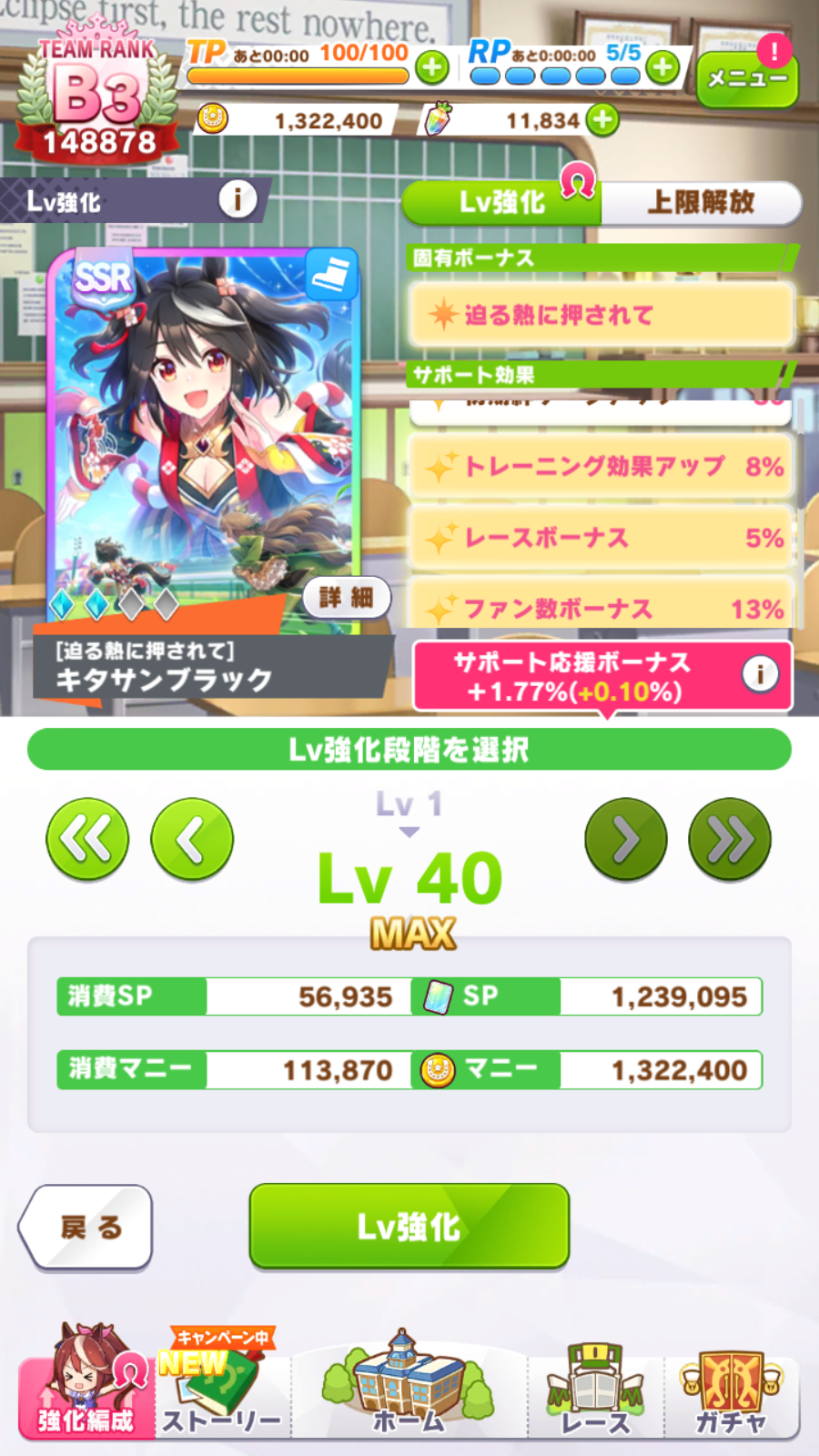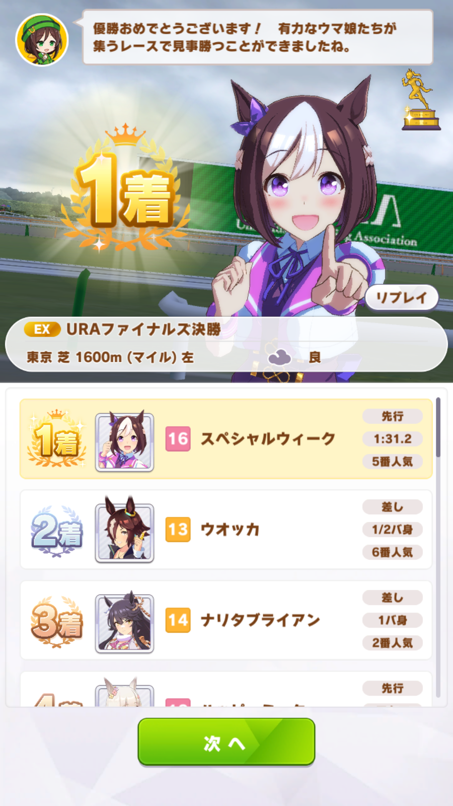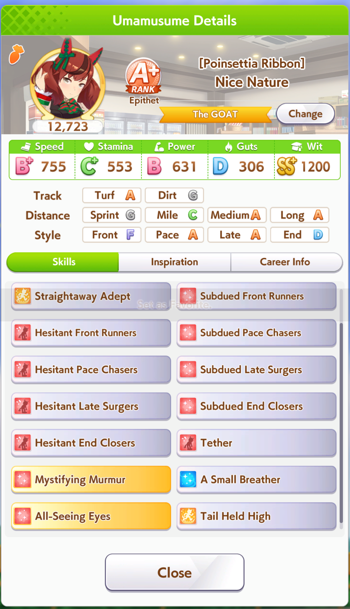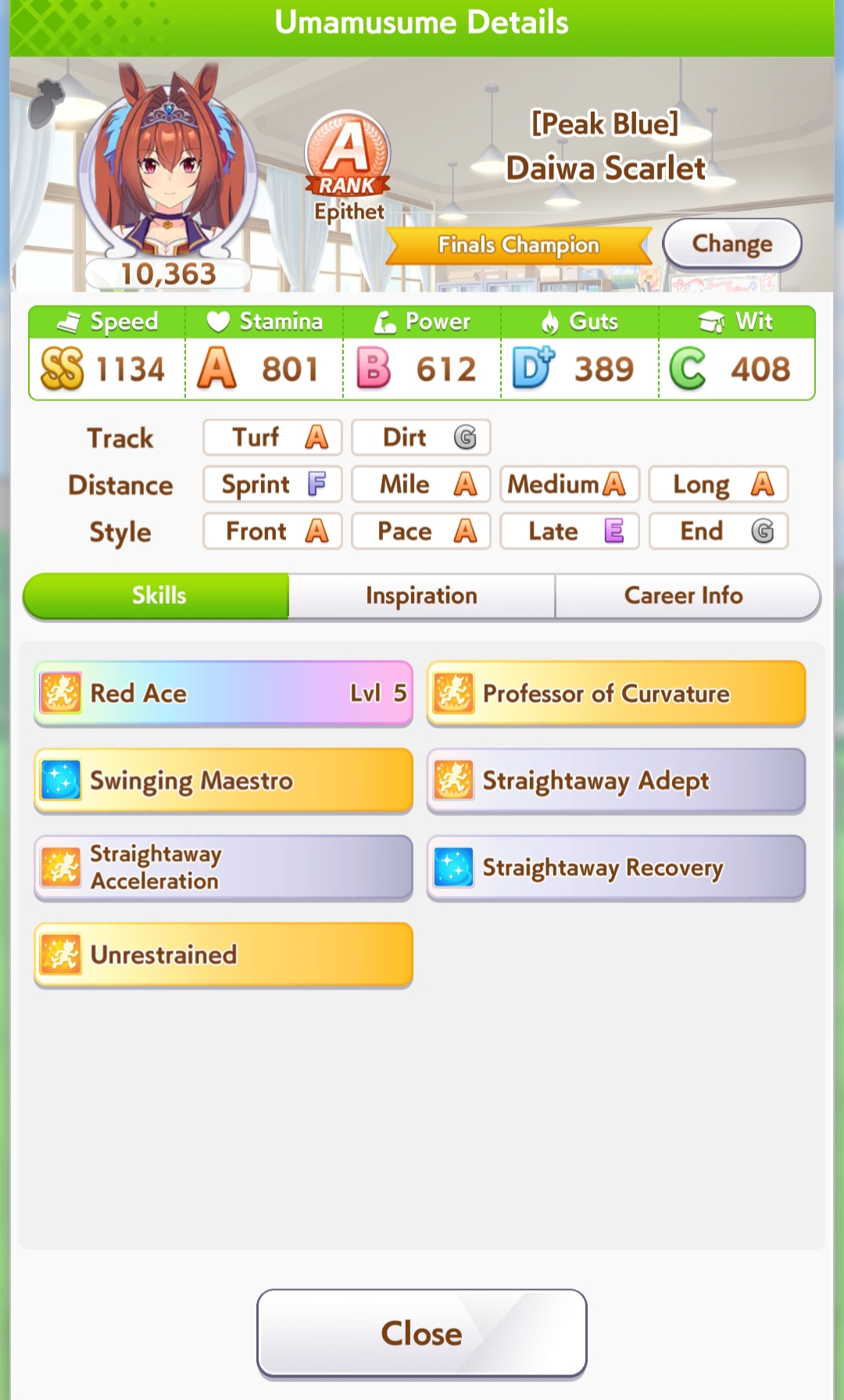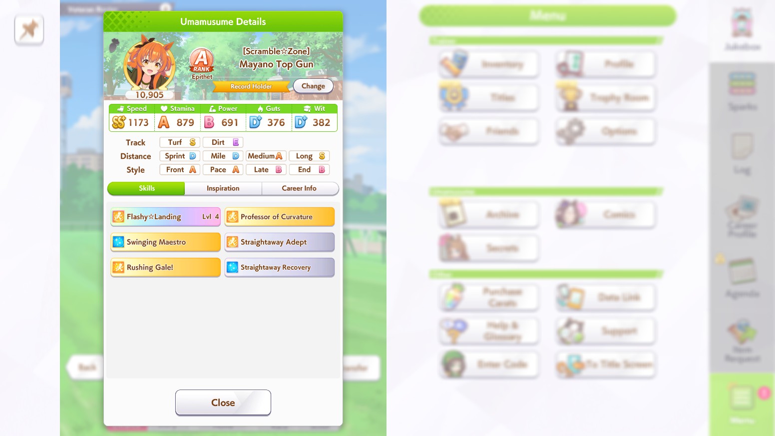 По ощущениям спида можно было и больше вкачать, намерено пропустил как минимум две радужные тренировки на 20-30 очков, где-то с середины карьеры началось просто дичайшее проседание по стамине, всё боялся что её не хватит и останусь у разбитого корыта, приходилось жать на свои +13 на тренировке. Приходилось практически одну стамину тренировать и всё-равно отставание не покрылось нормально. Ну и карьера у неё немножко дебильная, как уже упоминали, чистого спринтера не построить на ней, спасибо хоть Ариму бежать и побеждать не заставляют еще.