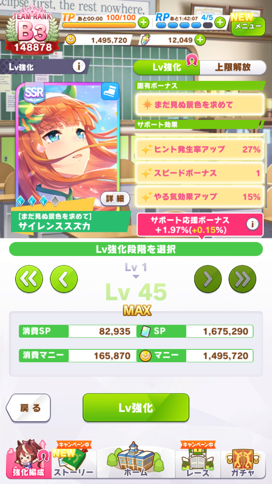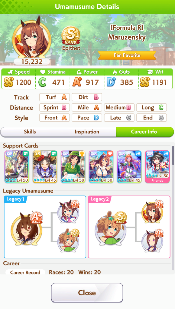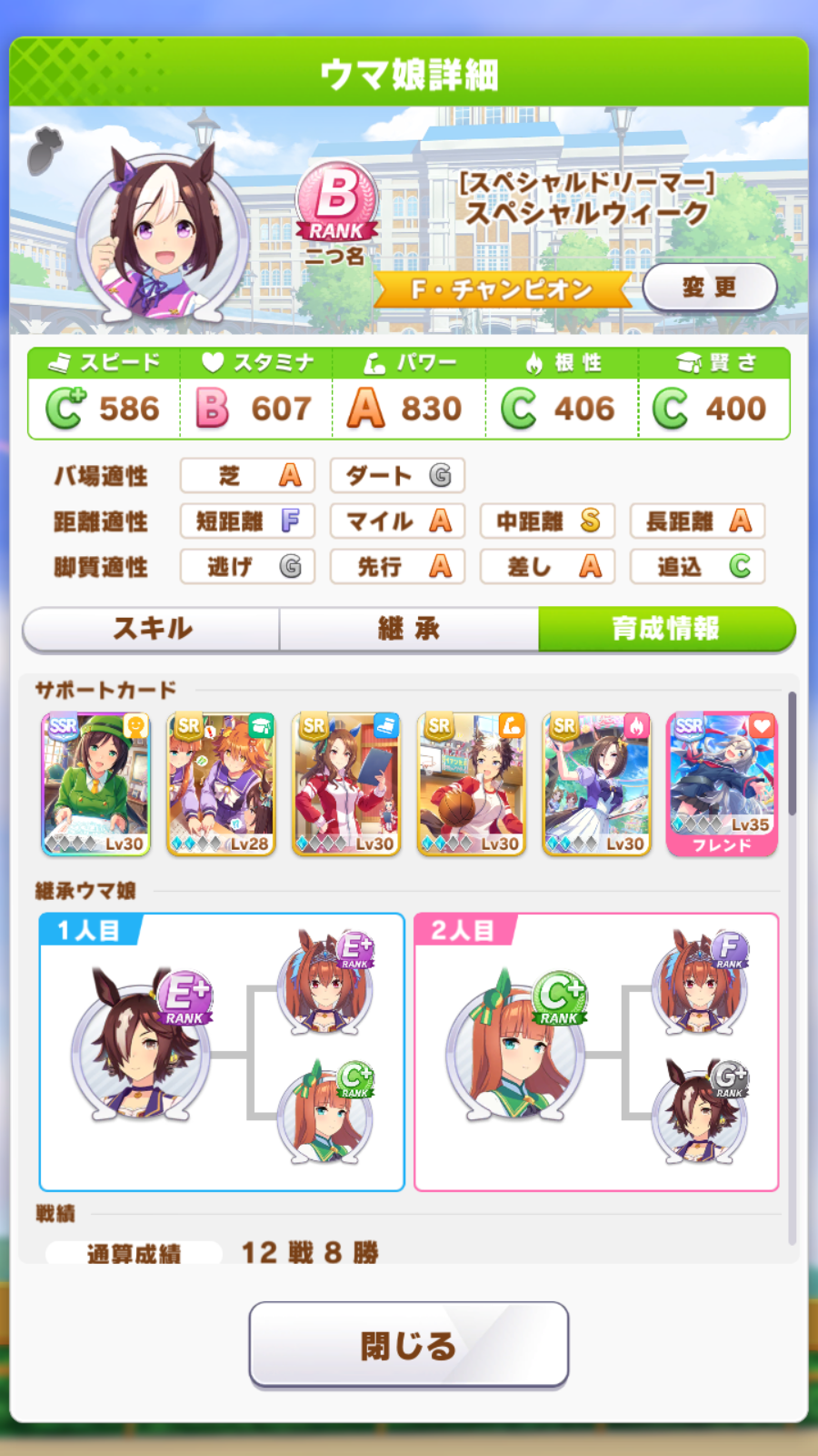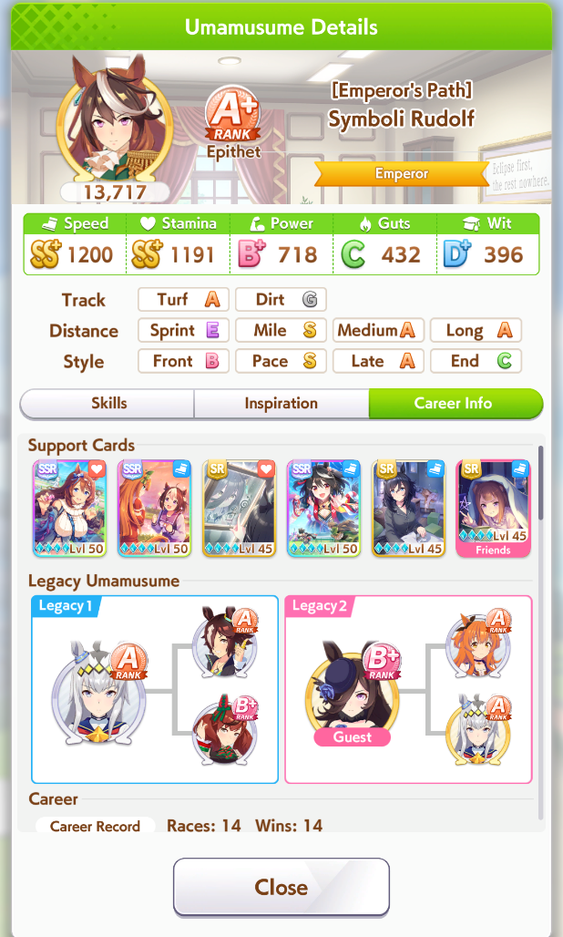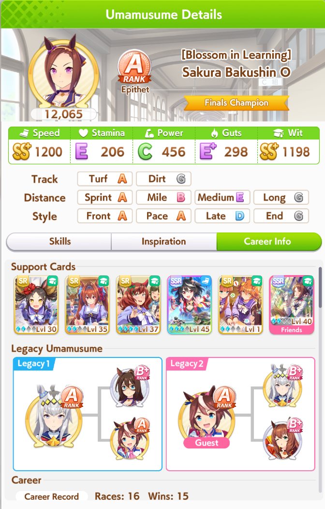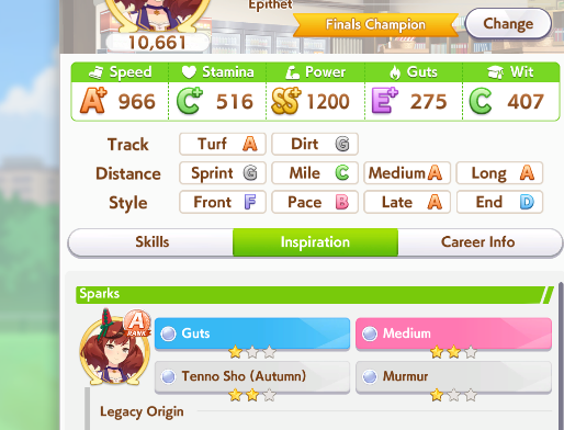 >>5346926 Вот энд раннер с 0 лузов в карьере. Им скорость вообще почти не нужна, а вот павера надо по максимуму. Проблема в том, что хороших карточек на павер критически мало. Попробую занять SSR водку вместо супер крик, и упороться в ещё больше павера, здесь явный перекач стамины, как по мне. Хотя возможно это из за того что в легаси умах в сумме 15 спарков стамины было.