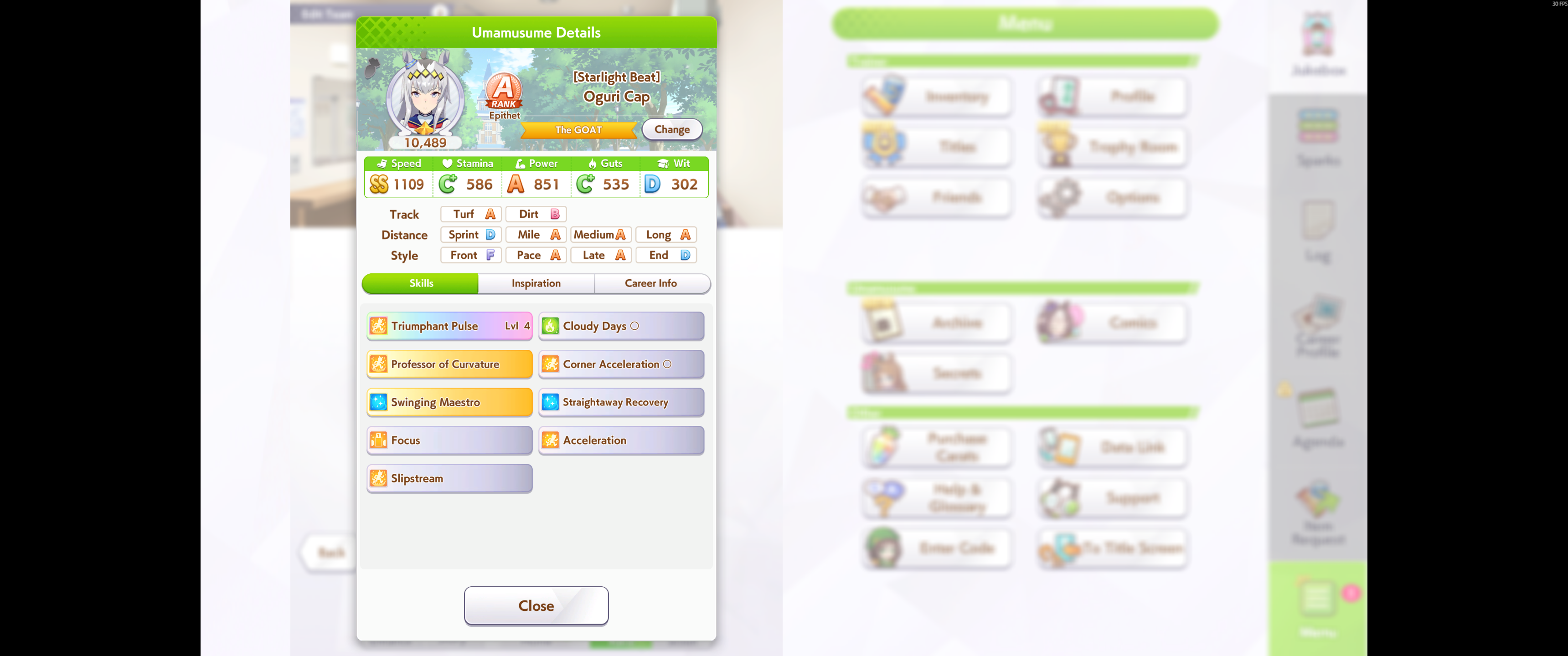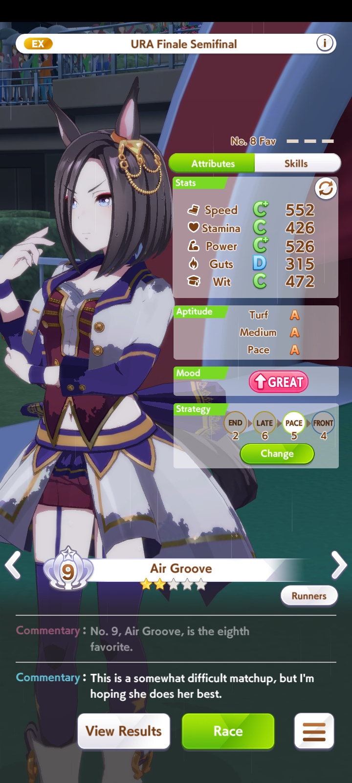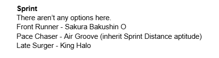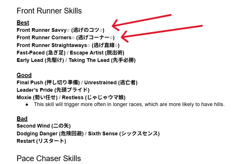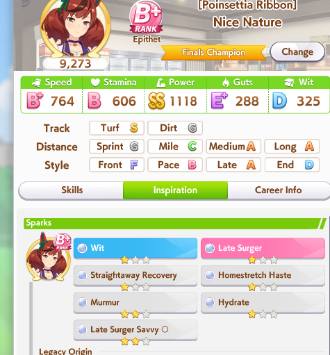 >>5281751 Ну и ещё непонятно, у тебя зачем то взяты и early lead и ramp up. Если ты собрался быть спереди, то зачем тебе ramp up? Если ты собрался обгонять (а этот скилл вообще лучше на late surger или end closer мне кажется, pace chaser в середине скачек ещё никого не обгоняет часто, только в конце чесаться начинает), то зачем тебе early lead? Можешь посмотреть на шкалу сверху там стоят границы где начало скачек, середина и конец (я так понял по крайней мере). Ещё есть последний рывок, он не обозначен, но где-то в середине конечной фазы мне кажется.