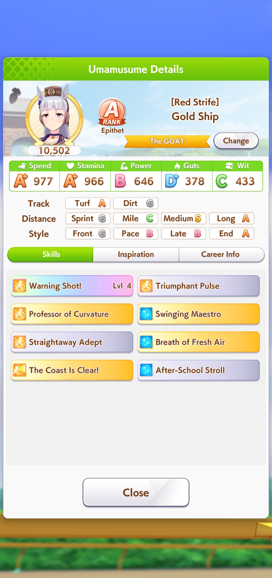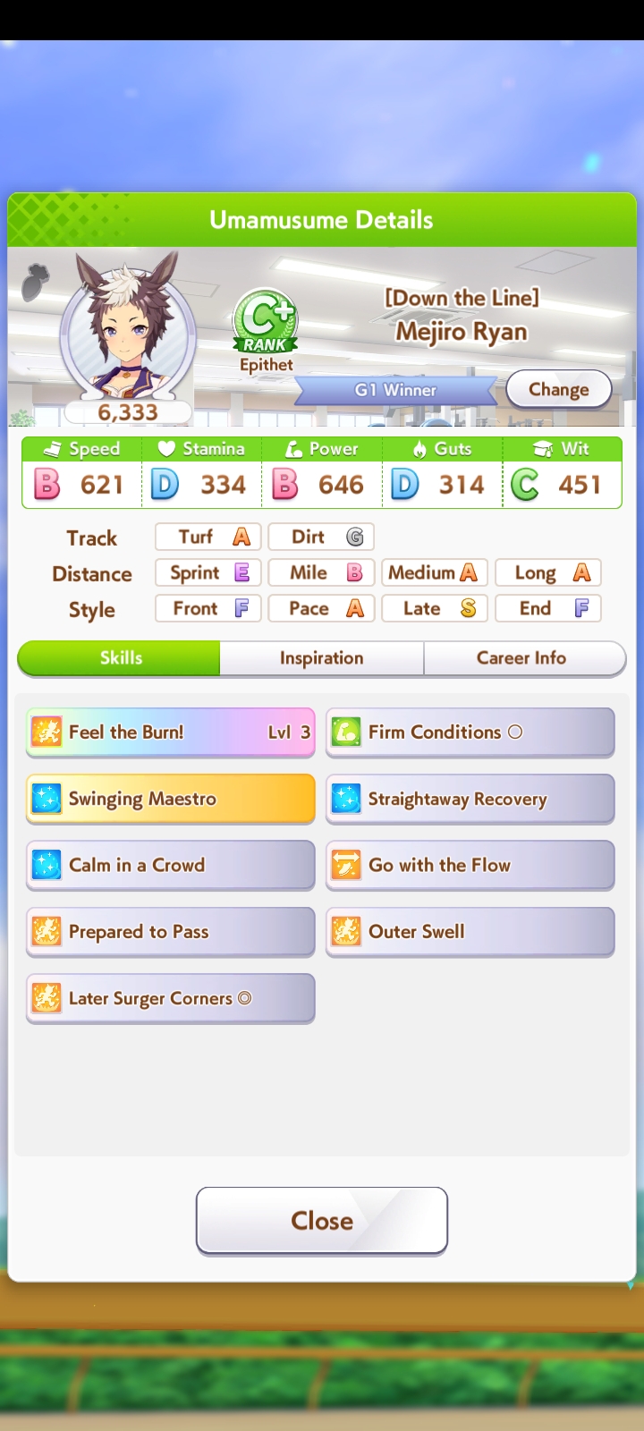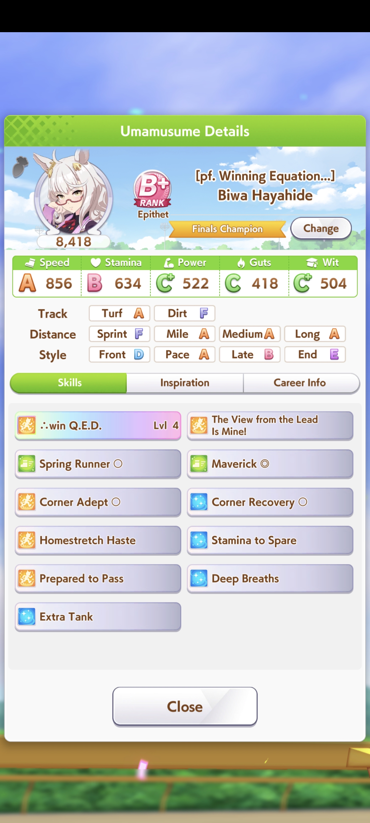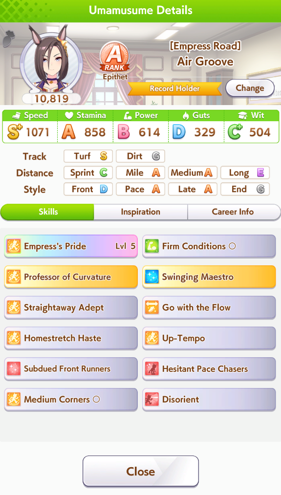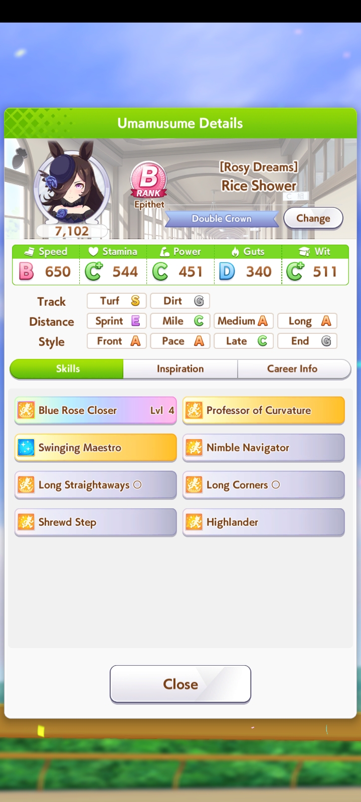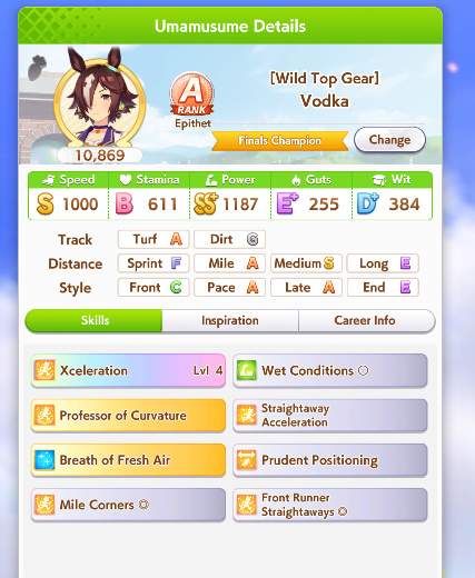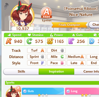 >>5350780 Можно чисто спринтера. В её карьере нужно только Скорость и Повер качать. Мудрость ты перекачал. Спид не докачал. Можешь ещё предками ей Пэйсера до А поднять, чтобы она ближе к передним рядам бежала в гонке и ей не нужно было с задних рядом в спринте обгонять всю толпу.