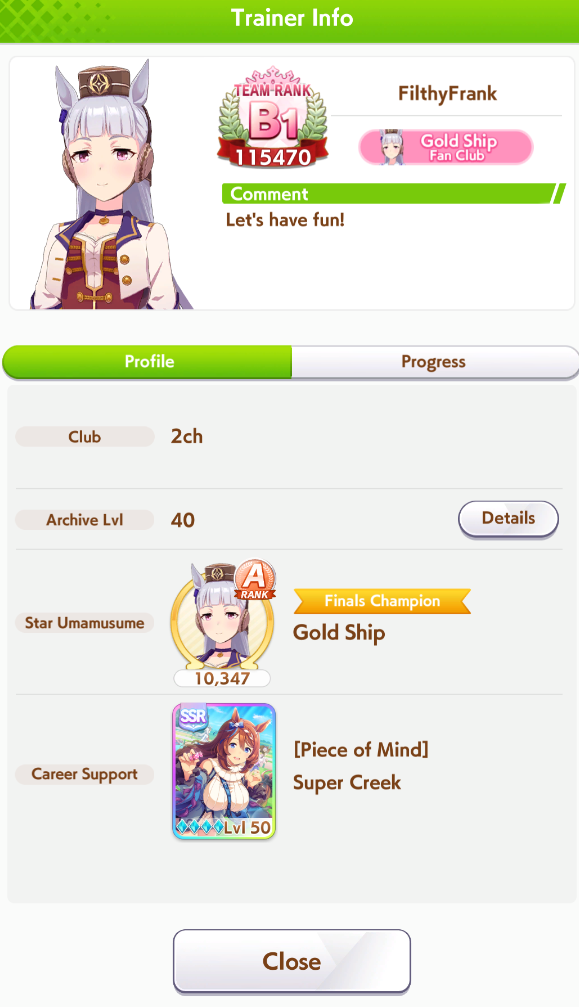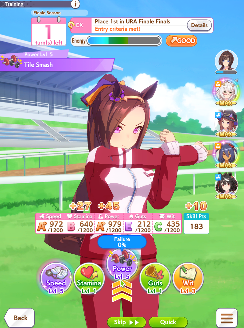 Кто-то сталкивался с тем, что с мобильного интернета игра не работает? Просто не грузит и выдают ошибку. Причем такое только три дня. В выходные еще спокойно шпилил по лте , сейчас ВСЁ. Алсо, помогите ньюфагу понять с чего начать. У меня тима вся зеленая с С рейтингом. Пока играю исключительно в курьеру. Но закончил успешно только один раз за все время за водку. И то потому что ее имбовый скил постоянно прокал. В гайдах пишут типа надо например иметь 1200 скорости к концу карьеры а я еле добираю до 500-600. Что я делаю не так? Я крайне редко отдыхаю когда в пол только энергия падает. Чередую основной стат и вит, чтобы отдыхать через вит.карты ставлю нужные по найду и легаси. Радужные ивенты с друзьями из КБ которые сильный прирост дают. Звезды открываю потенциал увеличиваю кобылам. Что еще делать та а?