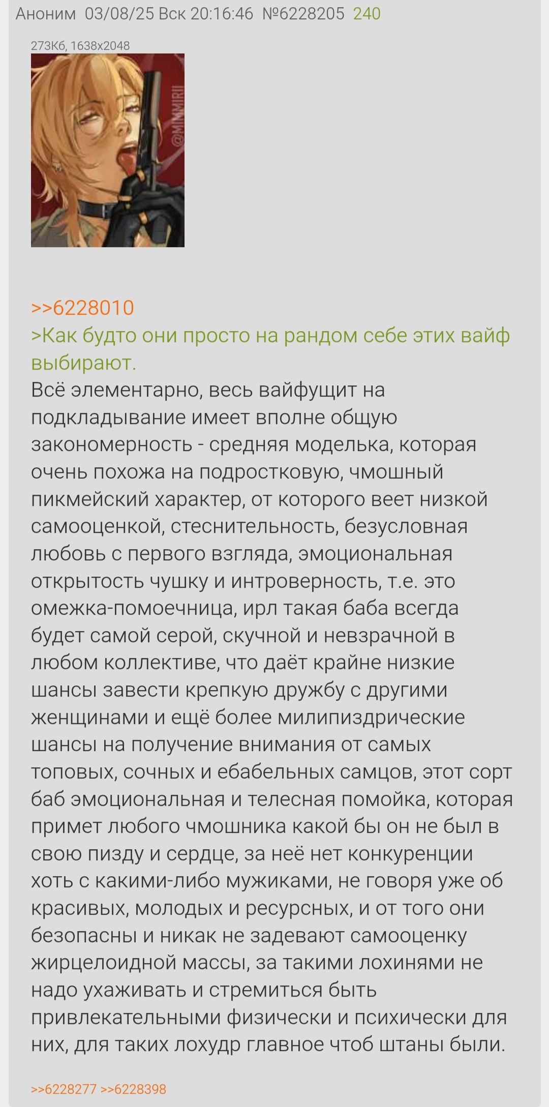 Вообще как я понял, бабы сгорели с Вивиан потому что у самих нихуя любви такой нет, и для кого-то прихорашиваться, покупать красивые платья и прочее, это недоступная для них опция. Там же все сгоревшие это 90% жиробасины всякие, всратки, уродки либо дети мелкие с головами набитыми хуйней.