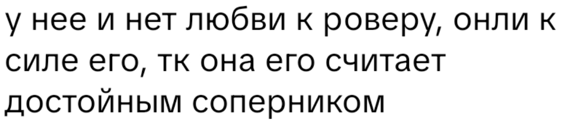 А по безюшковости, опять же, что кумера-инцелята, что паймоны одинаково соревнуются по жопочтению. И оба типа смешно подрываются: одни с того, что Фролова не готова за пять минут на все забить и в Богинях на плече у Ровера повиснуть с переводом ее сразу на Шоры, а другие с того, что для нее именно короткая встреча с Ровером стала самым поворотным моментом в жизни и спустя века она все равно по нему тоскует и хранит веру на воссоединение.