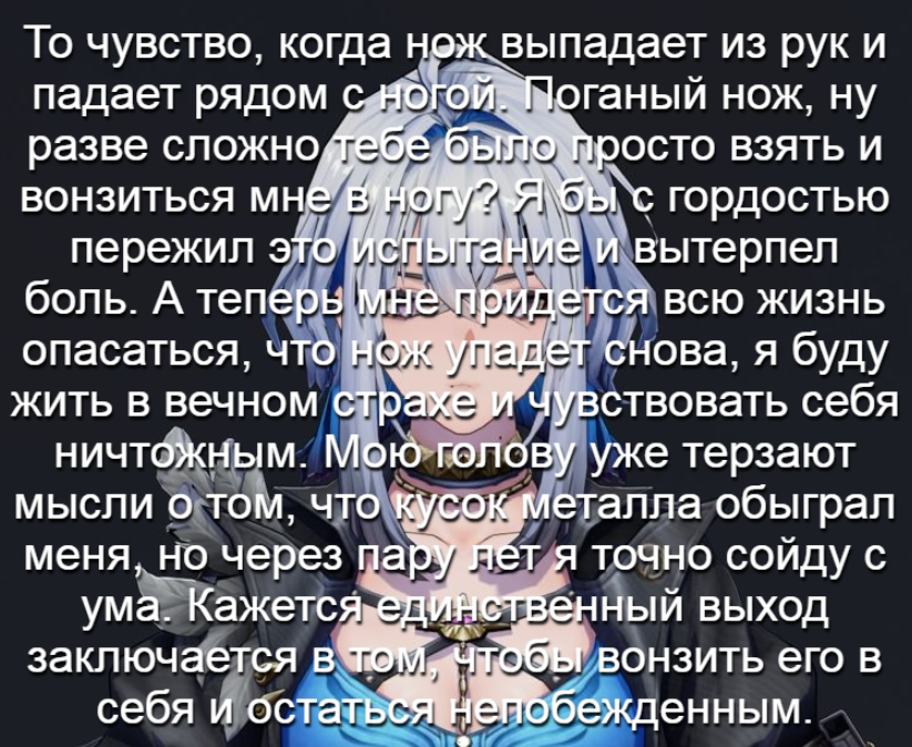 >>5364762 Не, она еще нормальная. Я вот рассказ один читал про вечность в пустоте, то там люди вообще себе глаза выцарапывали от сумашествия. Так что ей еще есть куда стремится.