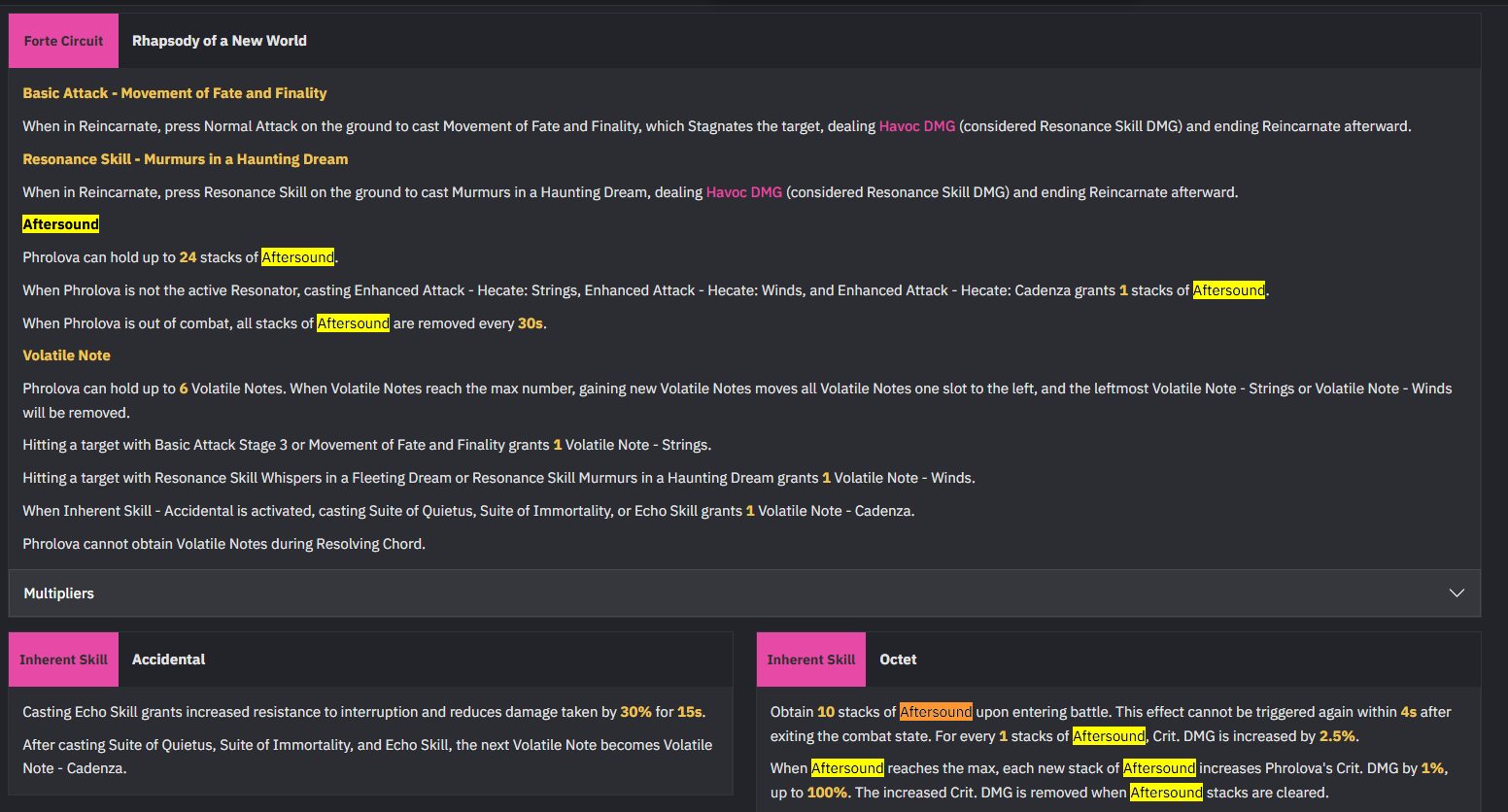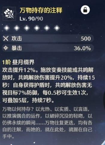 Daylight Moonweave Increases ATK by 12%. When casting an Intro Skill or Resonance Liberation, Resonance Liberation DMG is increased by 20% for 15 seconds. When gaining a shield, Resonance Liberation DMG ignores 7% of the target’s DEF. This effect can trigger once every 0.5 seconds, stack up to 5 times, and lasts for 7 seconds.