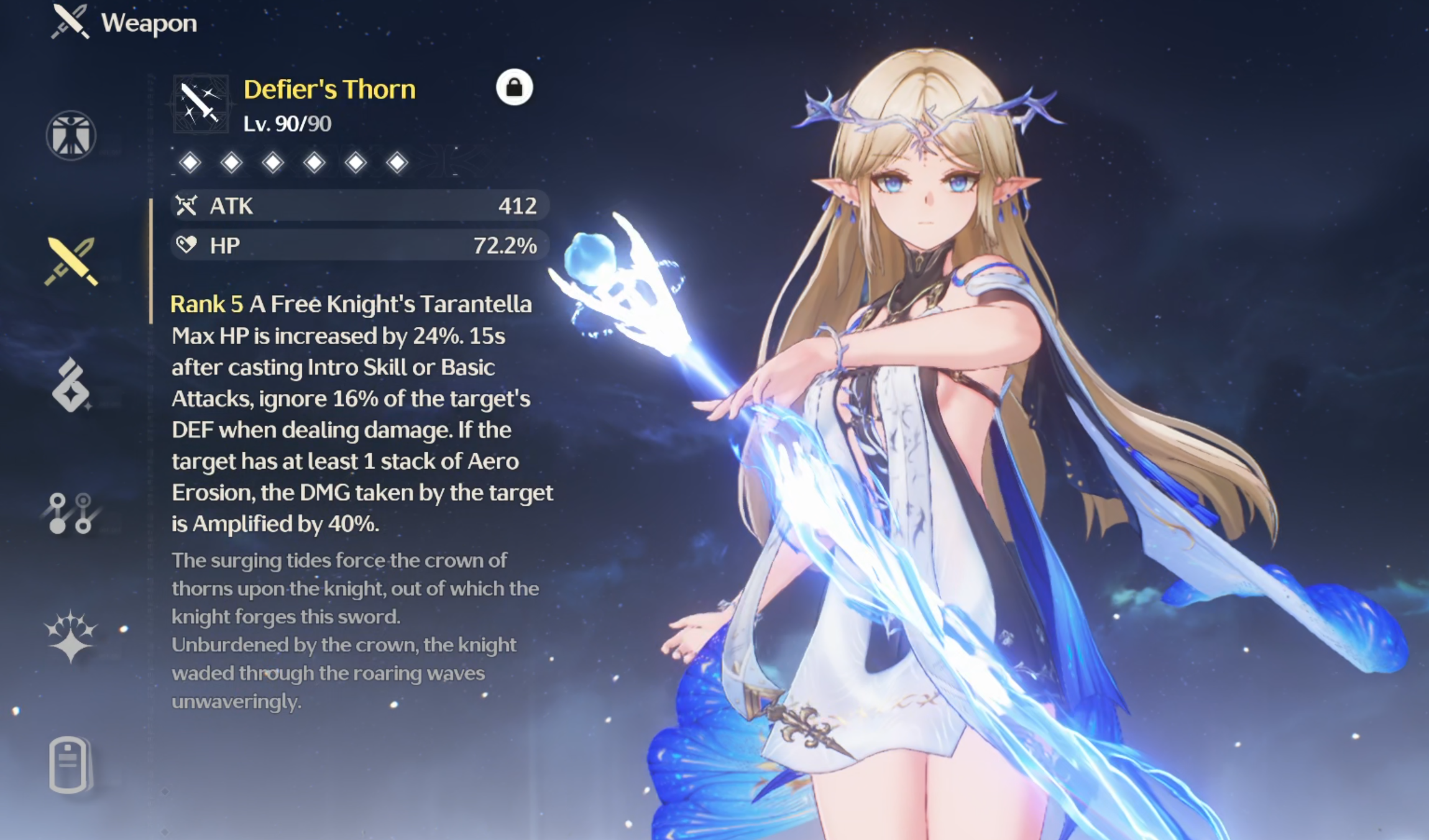 Crown of Thunder-Wielding Authority ATK: 675 | CRIT Rate: 12.1% Increases ATK by 12%. When casting a Intro Skill or Resonance Skill, Heavy Attack DMG is increased by 20% for 15 seconds. When the wielder gains a shield, their Heavy Attacks ignore 7% of the target’s DEF; this effect can stack up to 5 times, can be triggered once every 0.5 seconds, and lasts for 7 seconds.