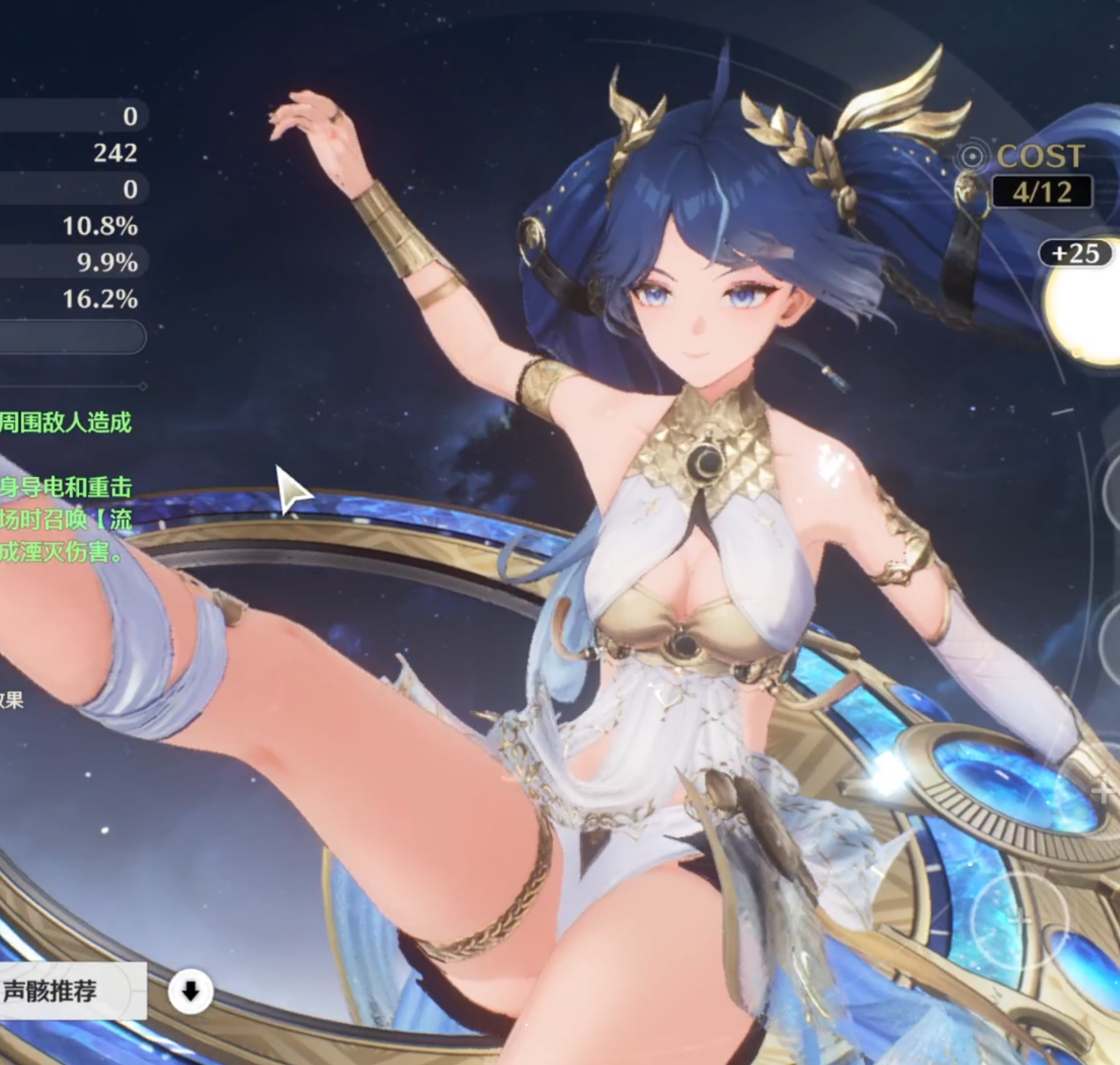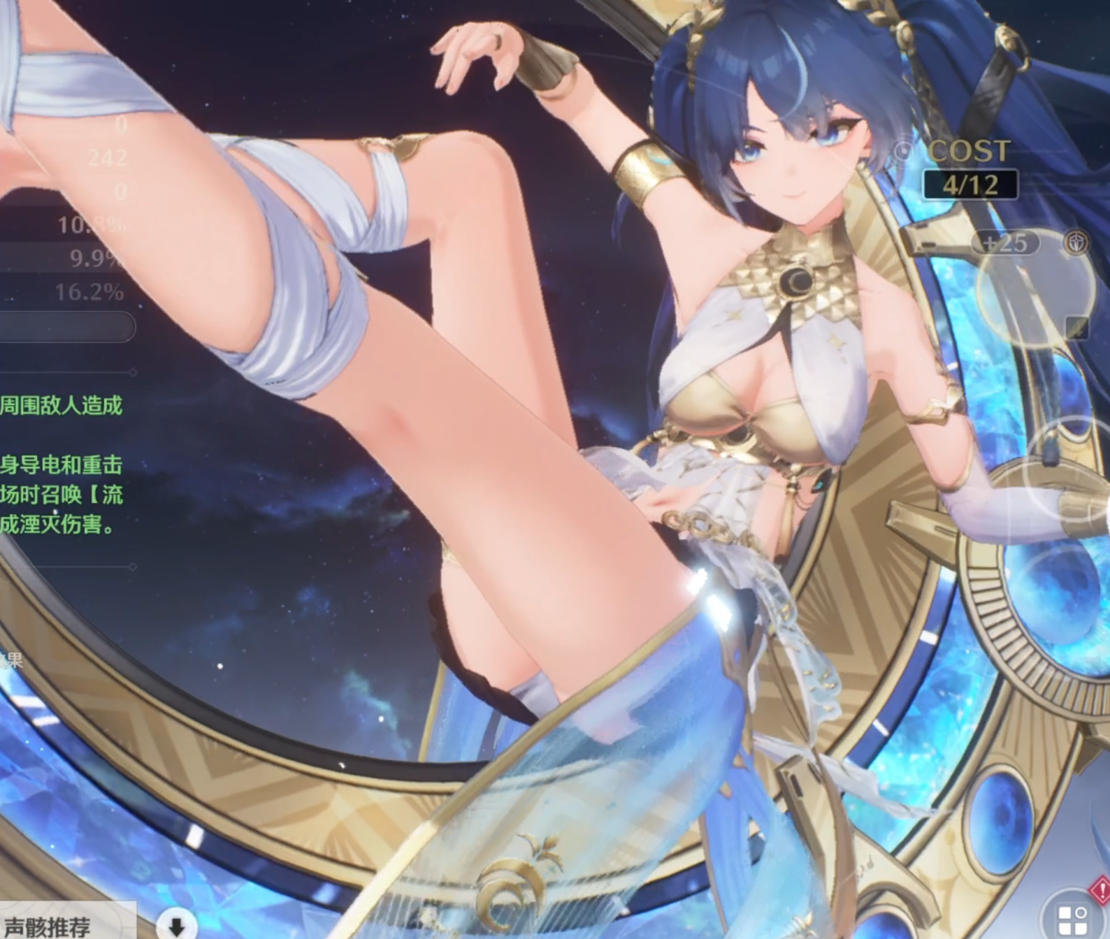 The right to control the crown and cast thunder Attack 675 Critical hit 12.1% Attacks increased by 12%. When casting a variation skill or resonance skill, the damage of the striking is increased by 20% for 15 seconds; when you obtain a shield, the damage of the striking is ignored by the target's 7% defense, and can be stacked for 5 layers, which can take effect every 0.5 seconds for 7 seconds. Thunder will burn her swelling and weakness. In the furnace made of blood and sand, she will no longer be dust, but a dazzling sun