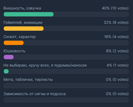 Для меня на первом месте мета. Но не простая мета - мне важно чтобы чемпик был имбой и самодостаточным, по крайней мере на с6. Сейчас например, такой чемпик - исключительно Флерделиз. Она и дамажит дохуя, и хп у нее много, так она еще и хилится. Это топ чемпик не долгое время. НО! Если бы она все время была в форме ушастого кривоногого гнома, то с большой вероятностью, я бы ее не роллил. Поэтому внешка на втором месте - часто она является доп фактором, но бывает и определяющим. Ну и я люблю бимб - тут +30 к шансу быть выкрученной мной. И только потом внешка. Все остальное - приятный бонус.