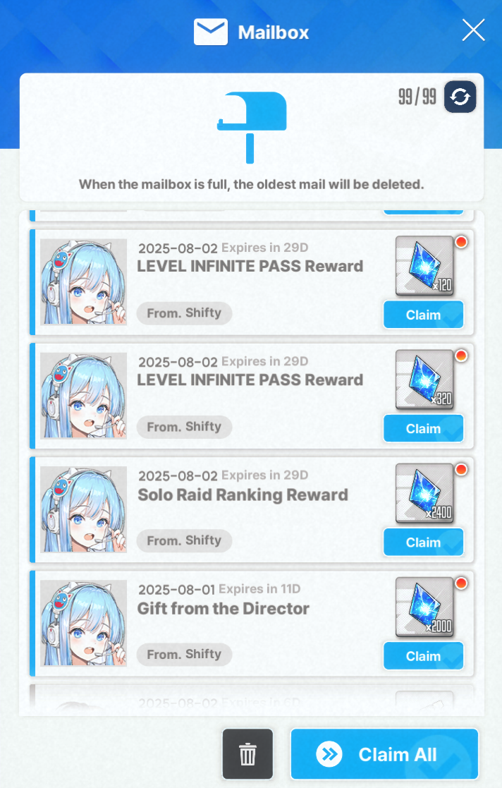 3.5 Weekend-Only - FULL BURST DAY Event Event duration: From 5:00:00, August 9, 2025 to 4:59:59, August 11, 2025 (UTC+9) From 5:00:00, August 16, 2025 to 4:59:59, August 18, 2025 (UTC+9) From 5:00:00, August 23, 2025 to 4:59:59, August 25, 2025 (UTC+9) During the FULL BURST DAY event on weekends, players can obtain an additional reward in Interception and Simulation Room.