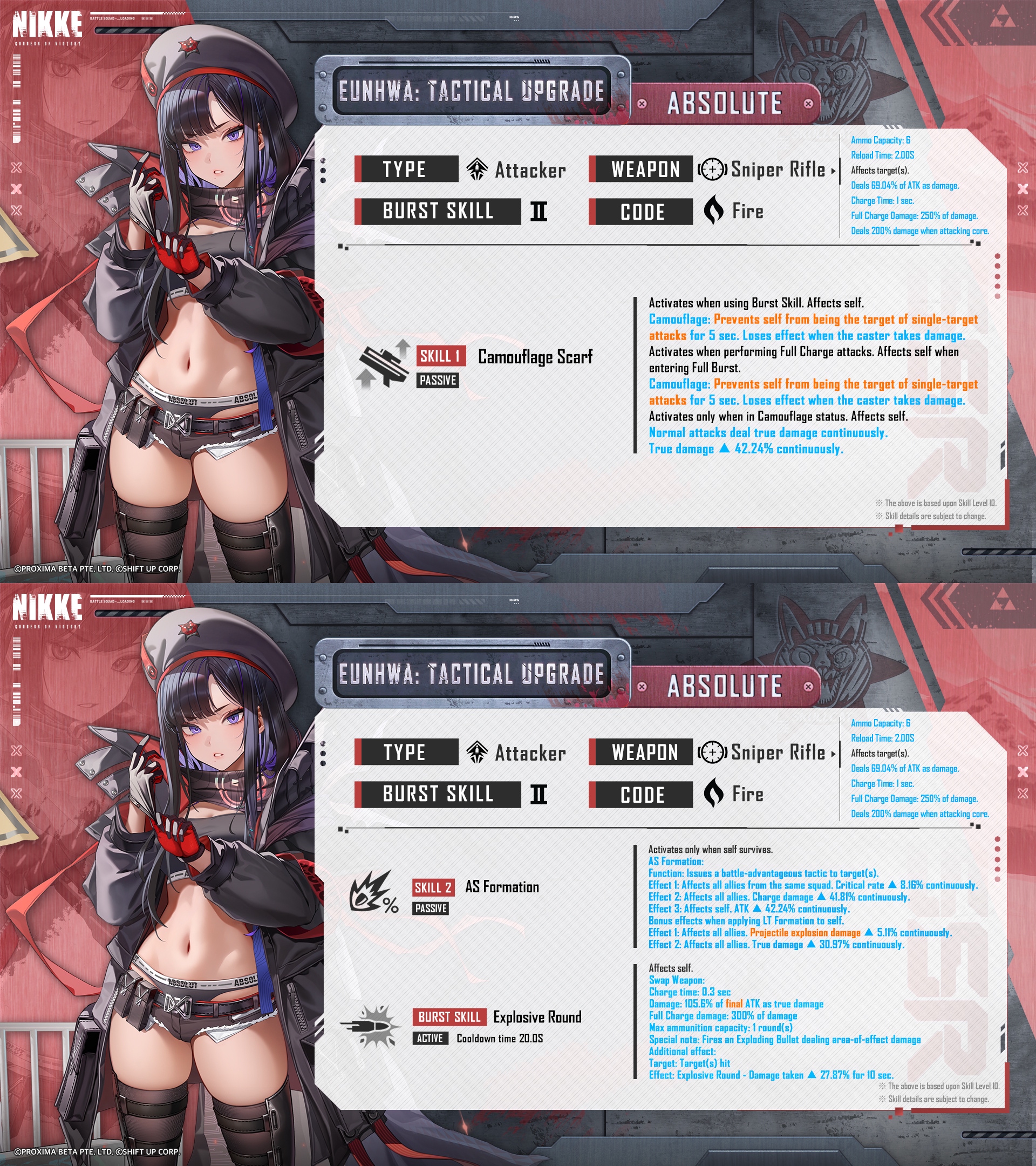 1.2 SSR Eunhwa: Tactical Upgrade SSR Eunhwa: Tactical Upgrade, the leader of the Absolute squad that's made stronger through the Tactical Upgrade Plan, joins the battlefield. Eunhwa: Tactical Upgrade is an Attacker who strengthens her allies while firing powerful attacks herself. She provides firepower support to allies depending on the formation and boosts her own firepower according to the camouflage state. - Class: Attacker - Weapon: Perfectionist T (SR) - Code: Fire - Manufacturer: Elysion Special Recruit duration: From 5:00:00, August 14, 2025 to 4:59:59, September 4, 2025 (UTC+9) In the version update after Special Recruit ends, Eunhwa: Tactical Upgrade will be available in Ordinary Recruit, Social Point Recruit, and from Mold items. (Unavailable in New Commander Special Recruit, Ordinary Recruit (Tutorial), and Mileage Shop.)