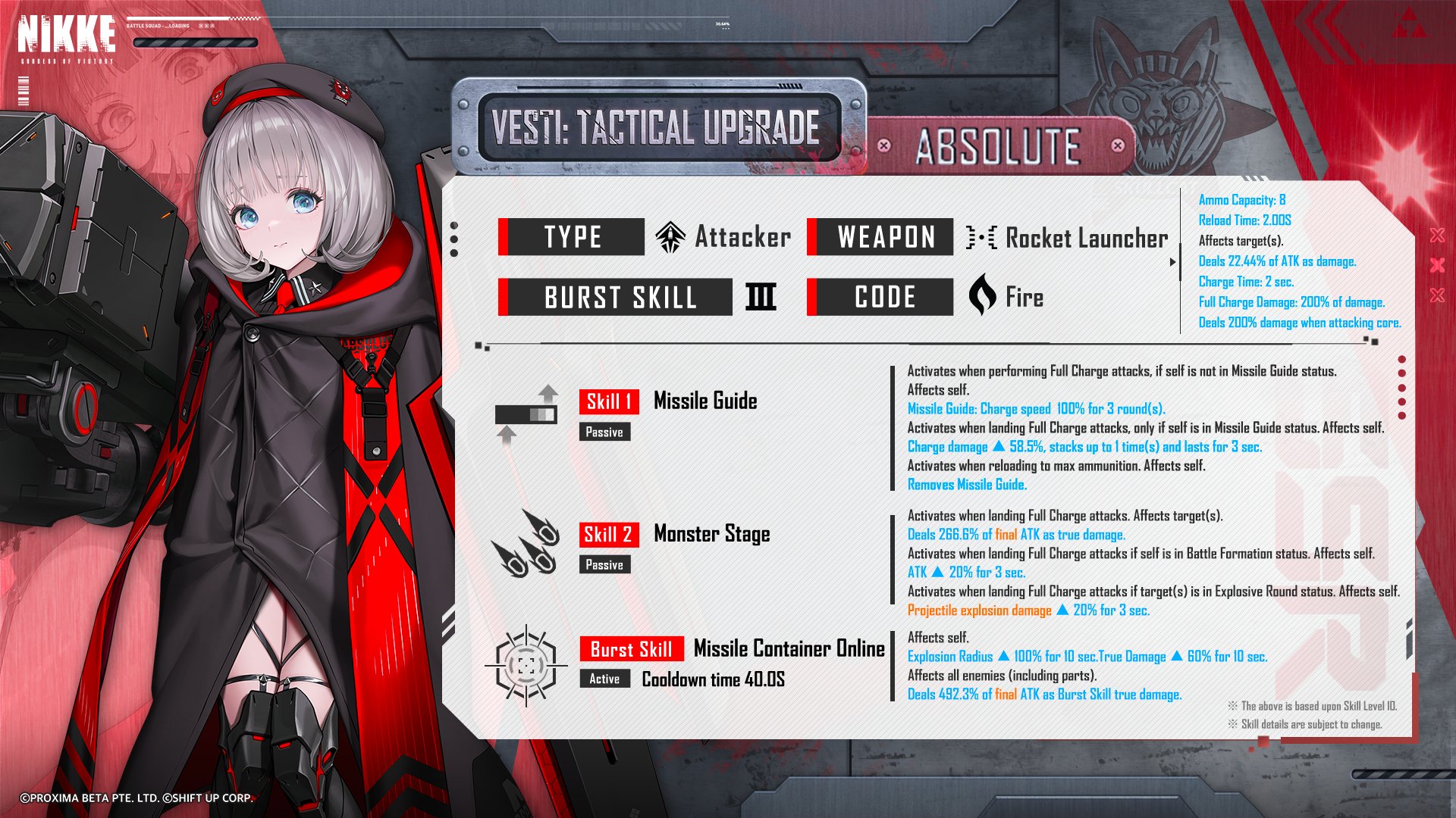 1.3 SSR Vesti: Tactical Upgrade SSR Vesti: Tactical Upgrade, the youngest member of the Absolute squad that's made stronger through the Tactical Upgrade Plan, joins the battlefield. Vesti: Tactical Upgrade is an Attacker with an extensive explosion range. Her Burst Skill allows her to expand the explosion range and deal True Damage in additional. Depending on the formation and the enemy's state, her attacking capabilities are further enhanced. - Class: Attacker - Weapon: Pure Monster T (RL) - Code: Fire - Manufacturer: Elysion Special Recruit duration: From 5:00:00, August 21, 2025 to 4:59:59, September 11, 2025 (UTC+9) In the version update after Special Recruit ends, Vesti: Tactical Upgrade will be available in Ordinary Recruit, Social Point Recruit, and from Mold items. (Unavailable in New Commander Special Recruit, Ordinary Recruit (Tutorial), and Mileage Shop)
