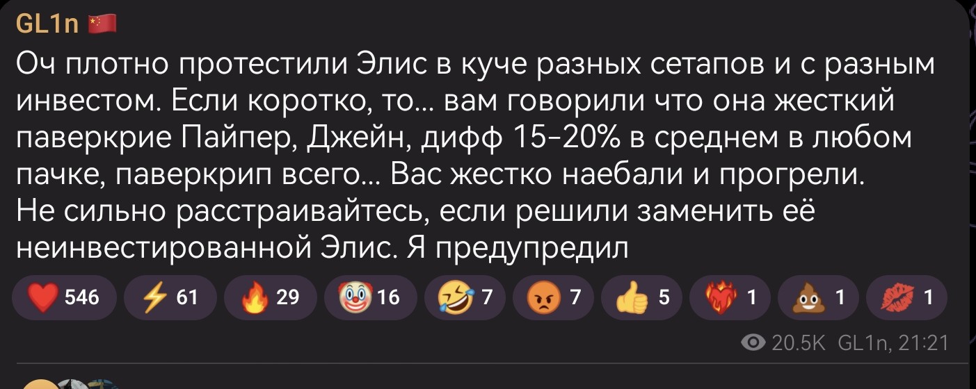 >>5373137 Элис конечно же, все крутите элис, там м2 падает как будто задаром! куча видео круток где ее за 150 еле забирают и сигну +60 в этом патче % выигрывания круток точно ПОДКРУТИЛИ )))))))