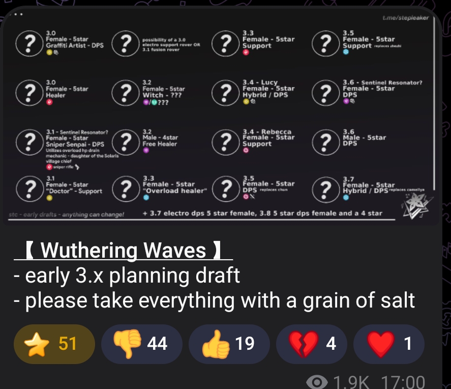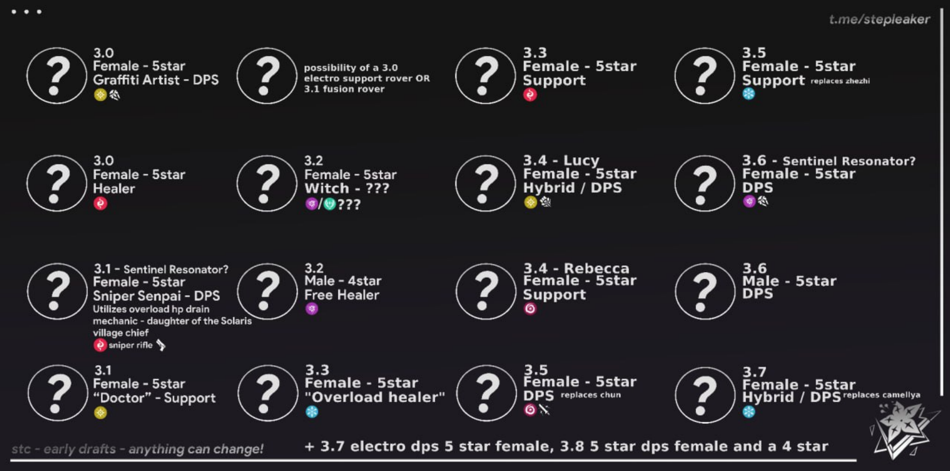 Ты понимаешь что все эти патчи что выпускают их делают не за 1 месяц перед релизом и не за 40 дней? Их делают сильно заранее, потому что сначала нужно написать сюжет, потом под него регион сделать, концепты, персонажей, а потом начать все это собирать, дать актерам озвучки тексты, писать музыку. Так что я уверен, что уже сейчас во всю тестируется даже 3.4, а так же уже делается все вплоть до 3.8 А это значит что все персонажи уже определены - потому что сценарий уже написан - делаются модельки, подбираются актеры озвучки и прочее.
