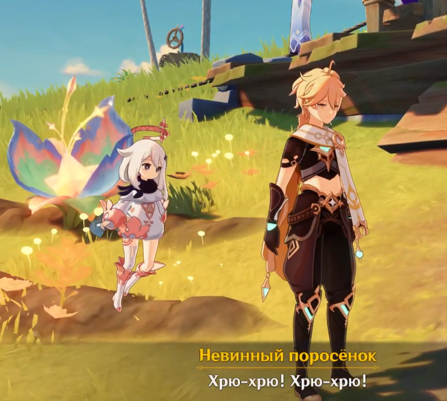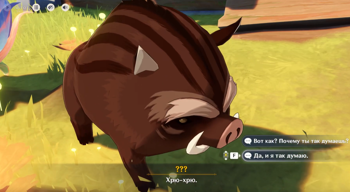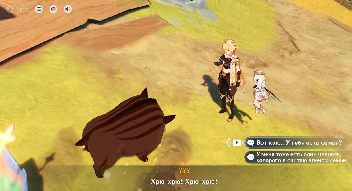 Так мы узнали, что: 1) ГГ имеет суперспособность понимать язык поросят 2) Поросёнок более привлекательный для общения персонаж, чем 90% Тейвата, и с ним можно про семью поговорить.