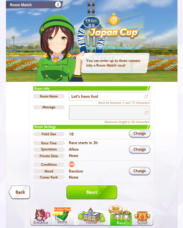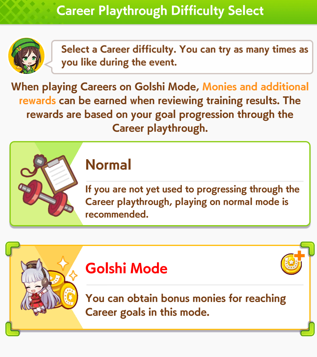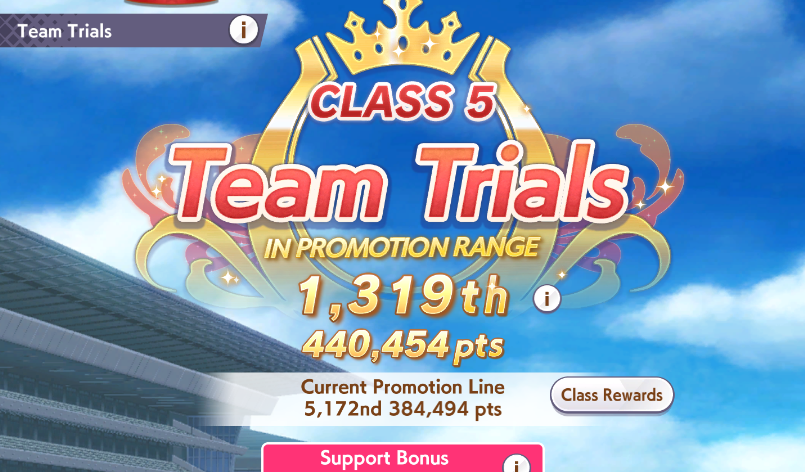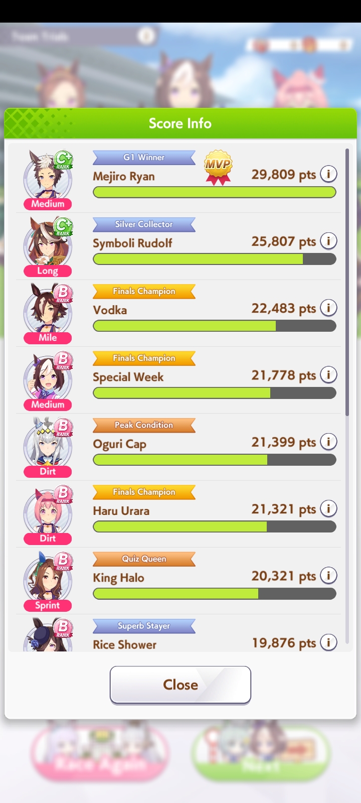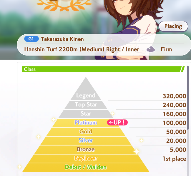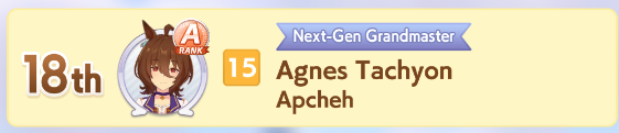 >>5360759 Там за месяц должны опубликовать условия ивента (трэк, длина, погода). Тебе надо будет сделать трёх коней для ивента с учётом этих условий. Например, если гонка левосторонняя, то ты будешь брать зелёный скилл на левый поворот, но не на правый. И другие различные скиллы могут быть эффективными или неэффективными в зависимости от условий. У вас мб такого ещё не будет (хз), но на Японии в начале ивента сначала предлагают выбрать разряд, высший или средний. В высшем нет ограничений, а в среднем можно использовать лошадей только имеющей оценку (B, A, S, S+, SS, ...) не выше определённого значения. Далее будет 2 дня первого раунда, и потом 2 дня второго раунда. Каждый день ты получаешь вроде три билетика, и ещё за вроде 30 морковок можешь купить четвёртый. За один билетик ты делаешь 5 гонок. В первом раунде если ты за эти пять гонок выиграешь хотя бы в одной, то ты попадаешь в группу Б, если выиграешь в трёх+, то попадаешь в группу А. Во втором раунде если ты за пять гонок выиграешь один раз, то ты вроде подаешь из группы А или Б в группу Б в финале, а если три раза, то попадаешь из группы А в группу А в финале. Из Б в А уже попасть нельзя будет. В зависимости от текущей группы разное кол-во наград за победы. Далее финал. Сперва пол дня на то, чтобы ты зарегал команду в финале. Потом пол дня матчинг. Далее день на то, чтобы посмотреть свой забег в финале и забрать награду. В финале ты можешь получить место от 1 до 3. Награды самые большие за первое место в группе А, потом уменьшаются, при этом за третье в А и за первое в Б дают одинаковое кол-во морковок.