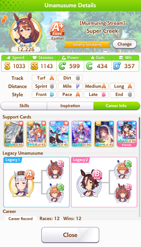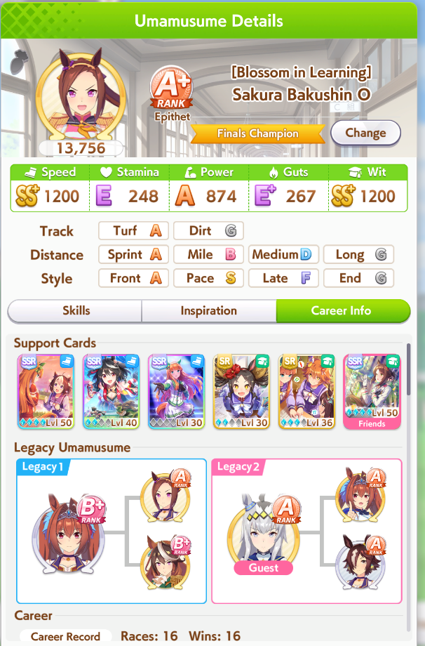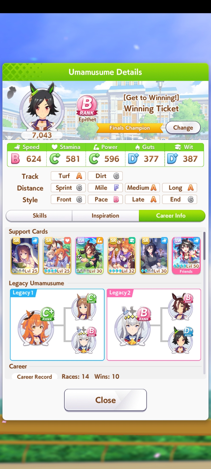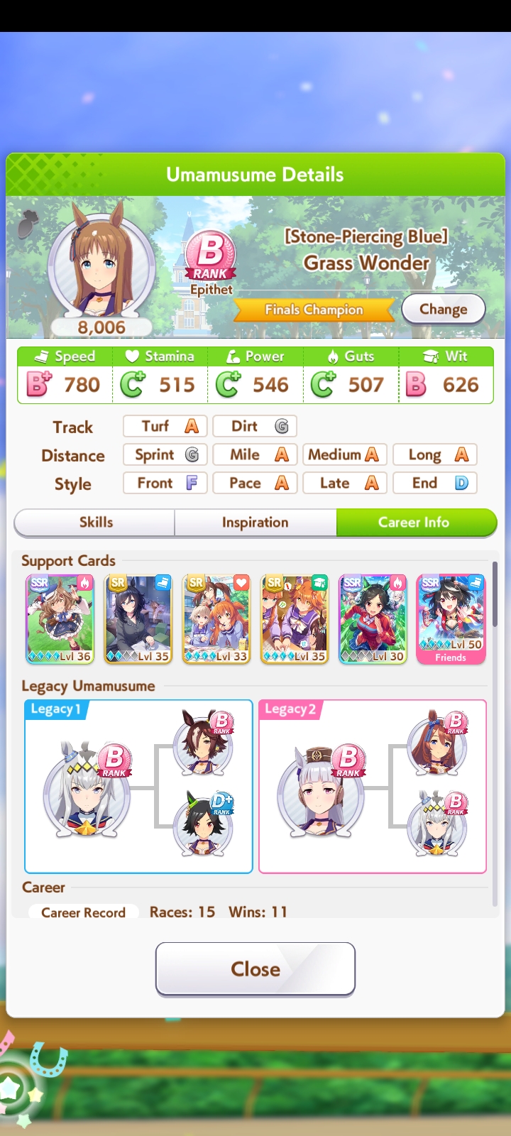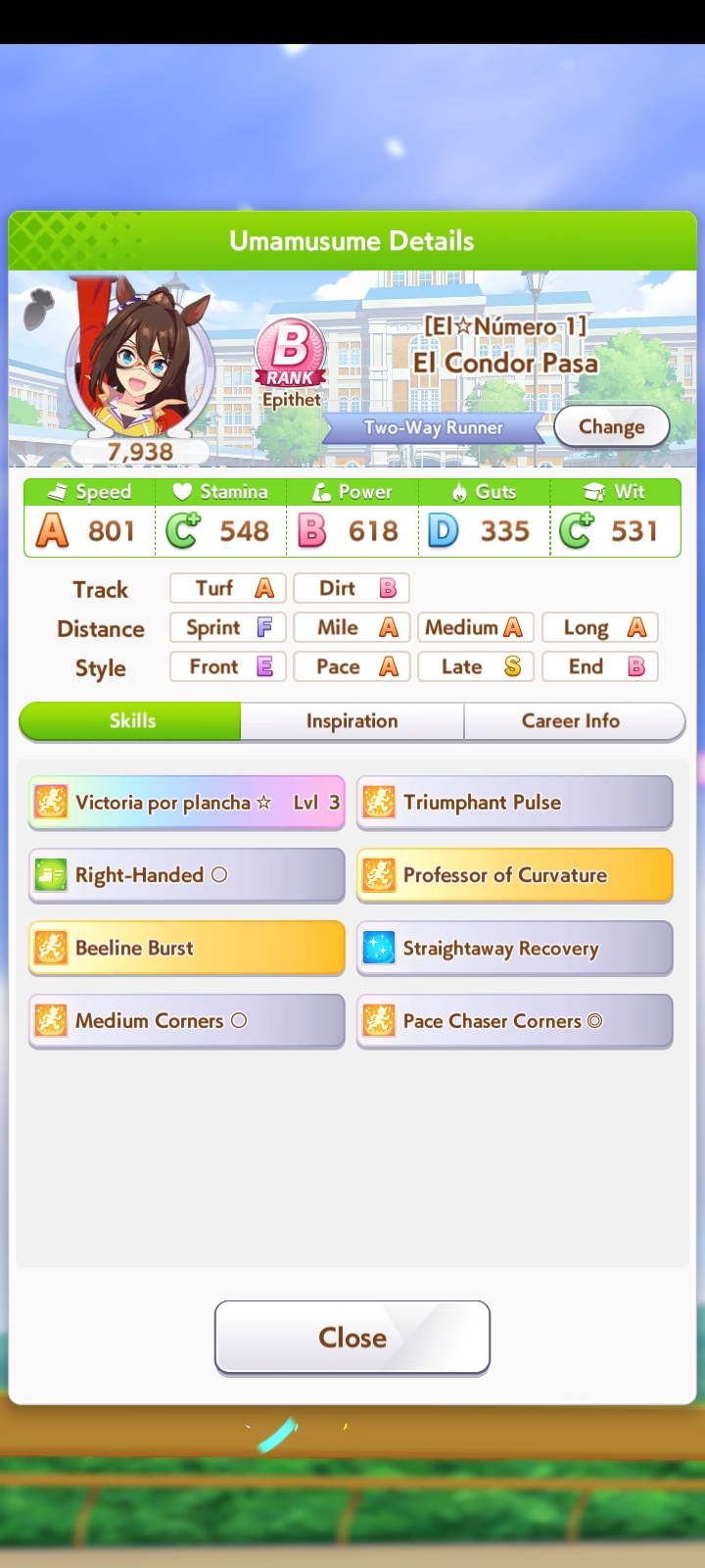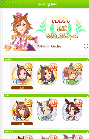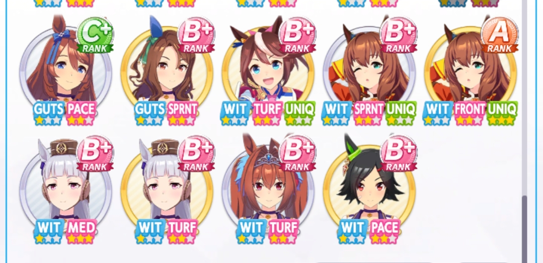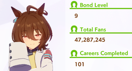 Грув в спринтера со второй попытки вкачалась, первую я похерил невкачем стамины. Для фулл ролей осталось дертовика выбить, будь то Эль Кондор Паса или айдол из завтрашнего баннера. Но конечно 1 трехзвездочная лошадь, да и та с рандомными предками, удручает.