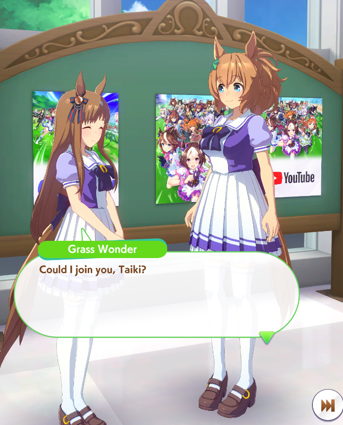 >>5393753 Нужно чтобы тригернулся эвент запускающий свиданку. Там выбираешь первый вариант чтобы начать с ней встречаться. Потом на иконке Рекреации появится значок. Теперь при нажатии на Рекреации можно выбирать с кем пойти на свидание - с твоей поней или с Тазуной. Можно пять раз с ней сходить на свиданку. Это восстанавливает энергию и настроение. На пятом свидании есть шанс получить золотой скилл Концентрации.