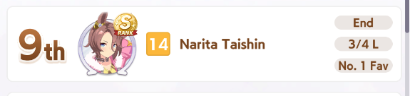 Ну что ж, седьмая карьера вышла за неё, хоть и не собирался, думал просто пробегусь вечерком ради дэйликов, вылечу ближе к финалу и на том всё, как обычно. Но как-то оно на седьмом десятке карьер по легче реально стало что ли идти. То ли Китасан решает и остальные карты к ней потихоньку начали подтягиваться, то ли предки теперь хоть что-то статами подсыпают, а не +1+5 как раньше, может всё вместе. Но теперь даже понями которыми не мог раньше и три гонки пройти, спокойно дохожу до финала или даже уры. У этой тоже карьера не самая простая, всё боялся что для Аримы стамины не хватит, качал её как не в себя, в итоге хватило, но остальные статы очень просели. Вышло что в финале вообще никто на неё не ставил и она даже близко фаворитом не была, но при этом довольно спокойно забирала гонки. Виз прямо пострадал очень сильно, даже не знаю почему так.