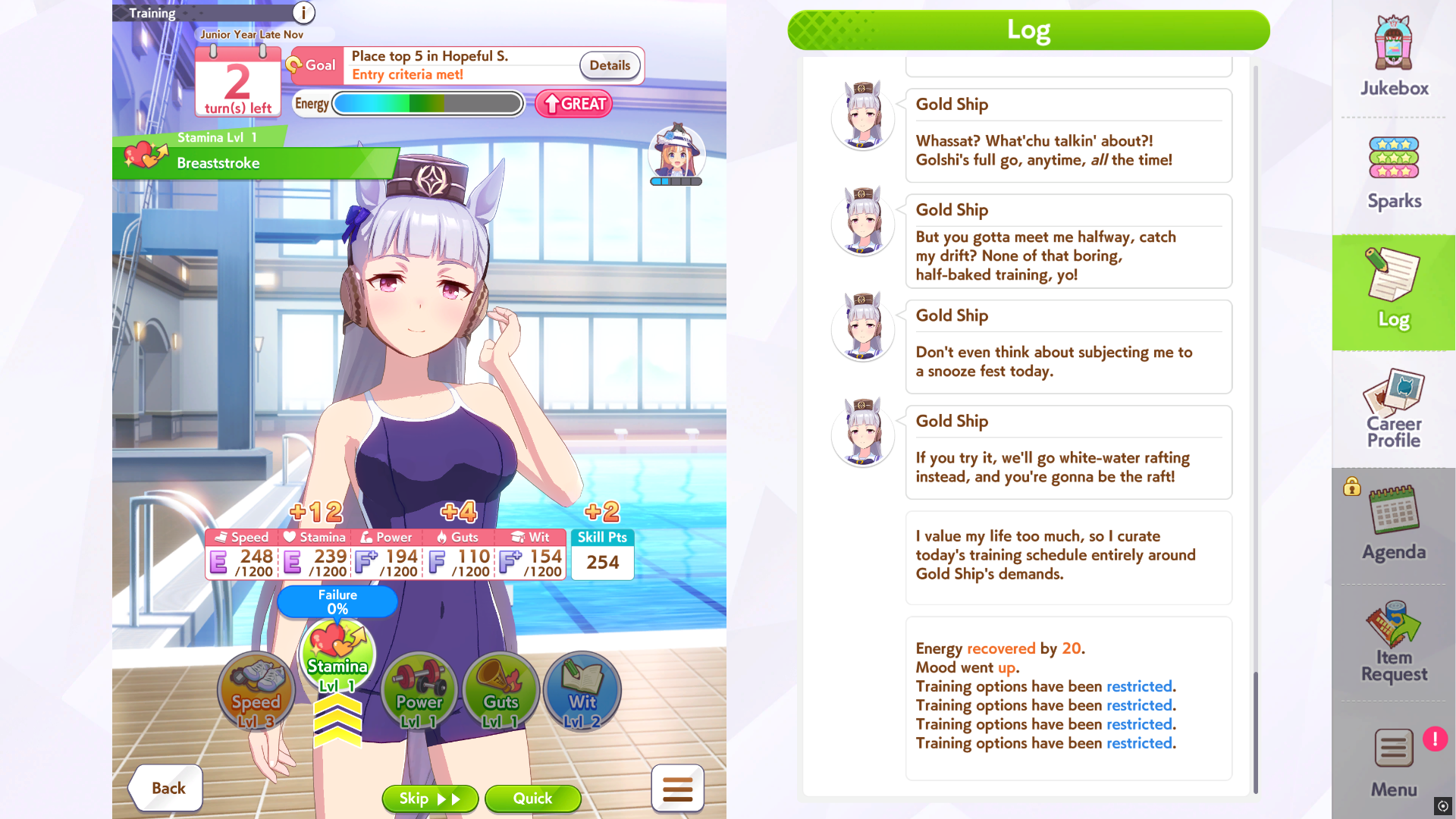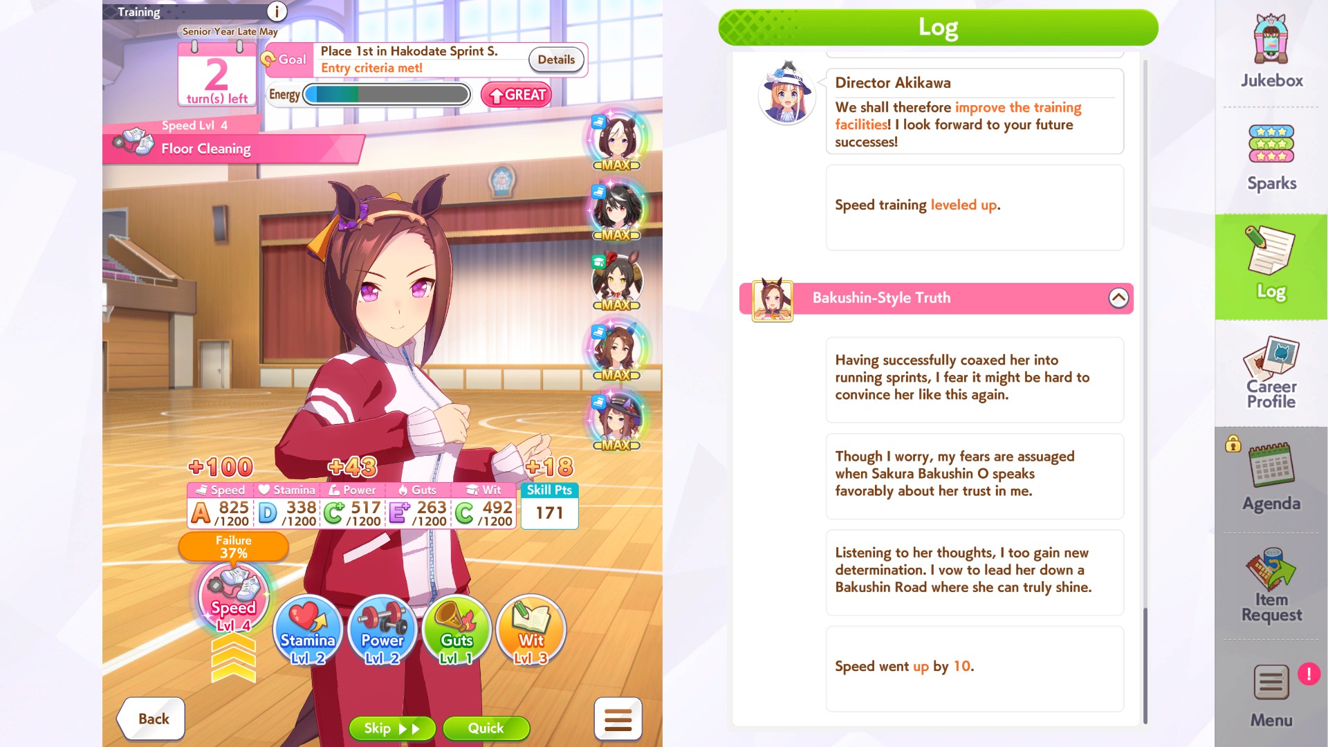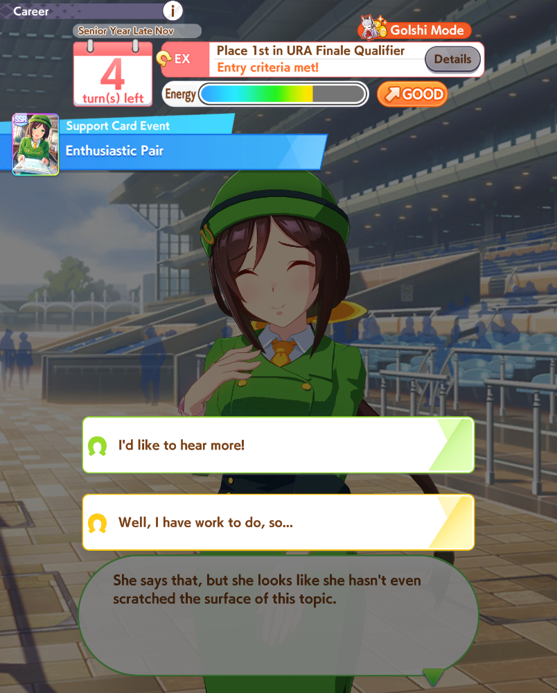 А неплохо они придумали, когда у меня были недокачанные карточки саппортов то получалось делать успешные раны с удачными эвентами и тренировками с 2+радугой. А только качнул саппорты по максимуму чтоб хоть какой-то шанс в пвп был, на тебе пошли ночные совы после каждого отдыха со стабильным проком в этот же день на -муд, и охуительные тренировки на которые тупо никто из сапов не приходит. Дай бог если одну трёхрадужную треню за карьеру сделаю. Патент ебёт...