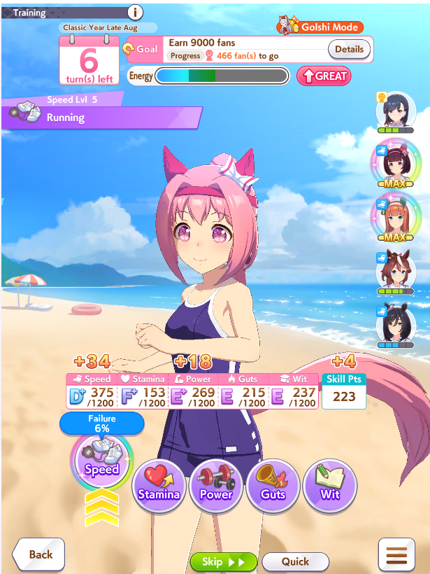 >>5368587 Без 700-800 стамины можешь даже не лезть. Сисяху макс лвла арендуй, она тебе лучший скилл на стамину даст и играй 3спид-3стамина или 4спид-2стамина, если есть вкачанная до максимума срка. Павер с родителей и радужного спида накапает.
