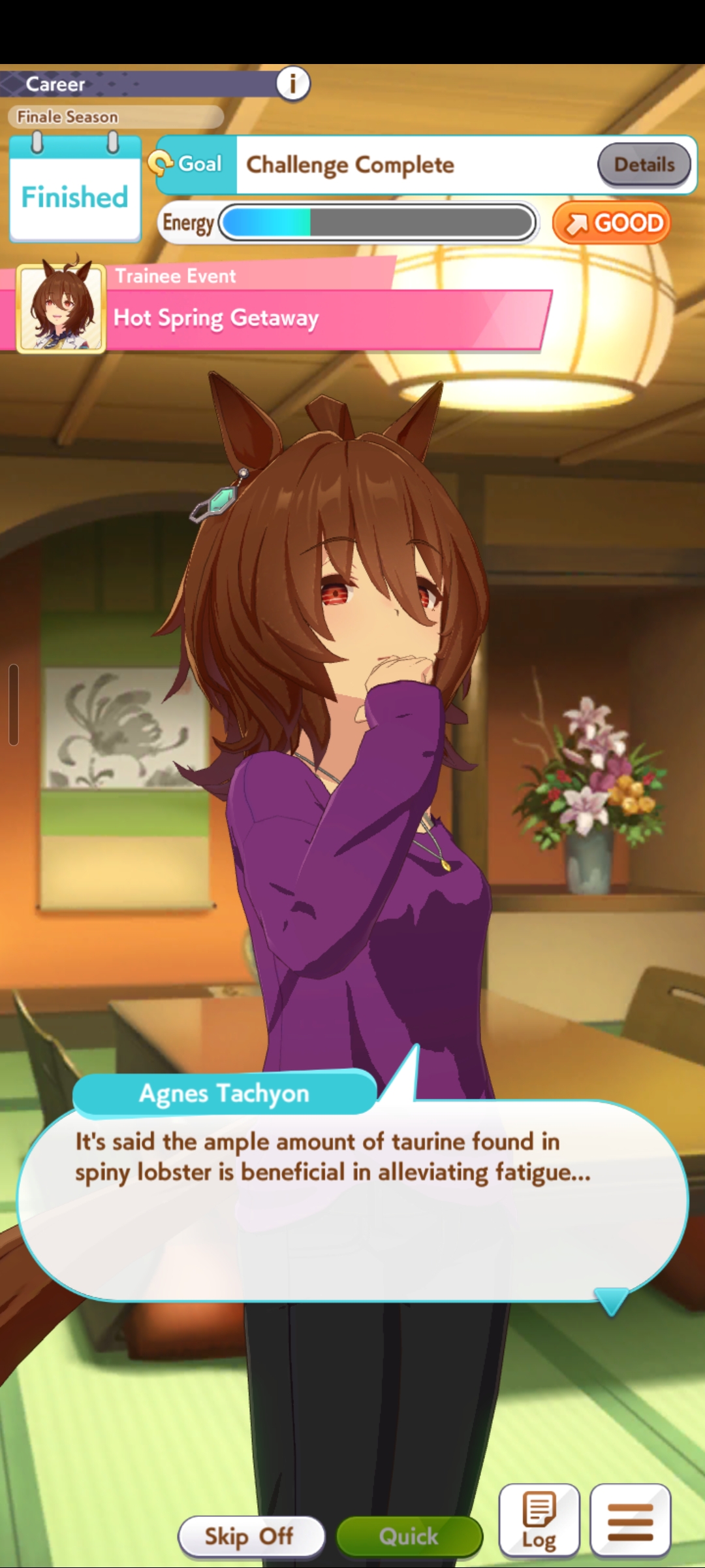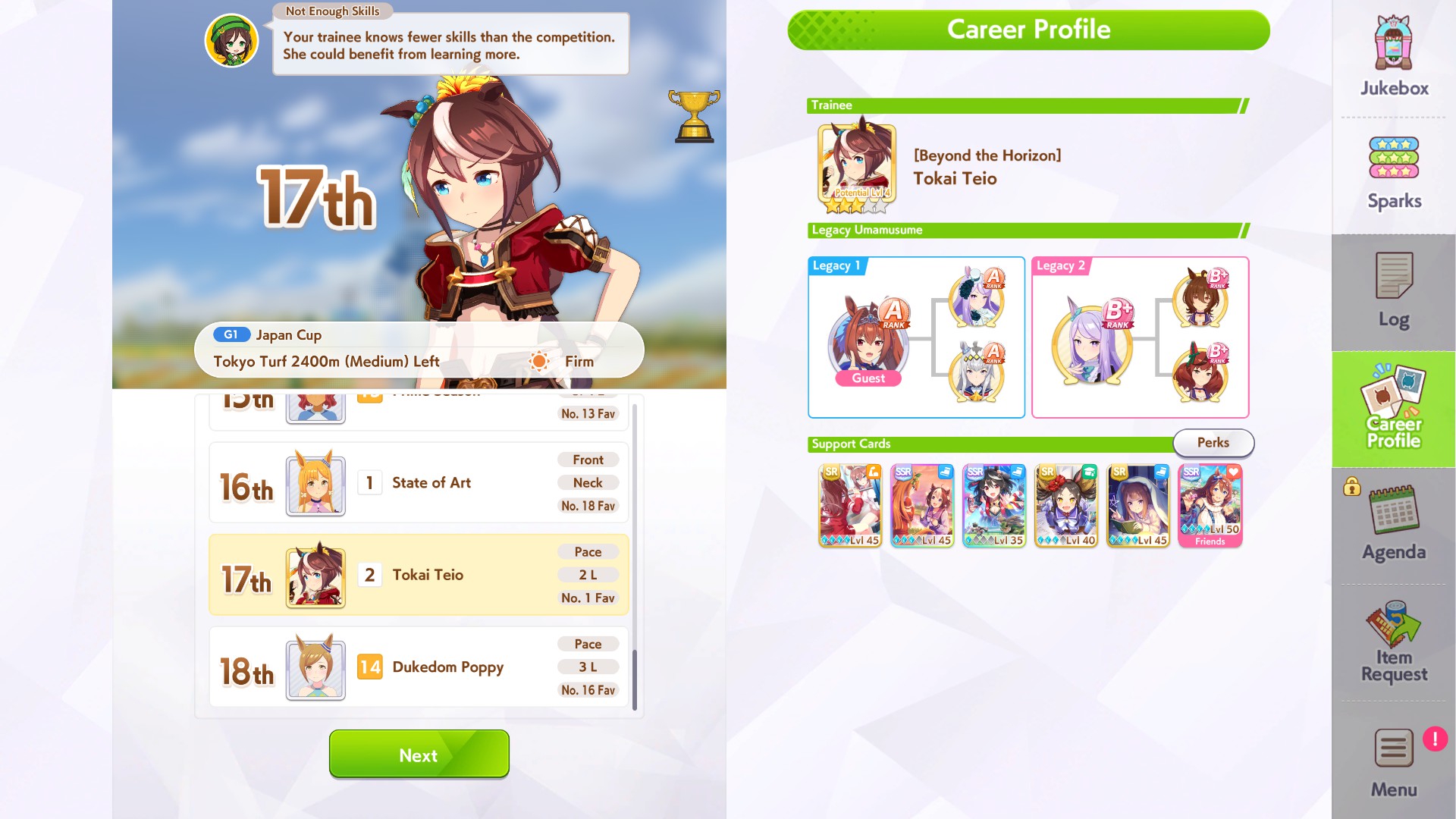 Проблемная девочка, конечно. Обосрался, когда она после Аримы поймала ивент на слакера и на тренировку с +45 к скорости не пришла, потом ещё на финальных гонках регулярно ловила лейт старт, рашила, залетала в коробочки, заставляя тратить на себя будильники, короче вела себя по прописанному характеру.