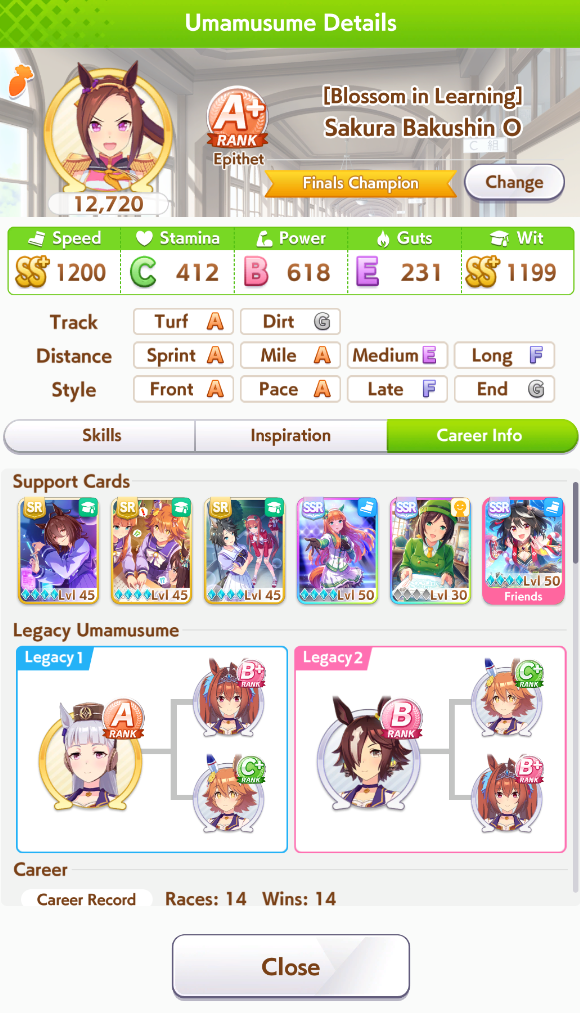 Тренеры, нужен ваш совет. Решил забилдить СуперКрик под лонг и пока вот лучшее, что получалось и какая была до. Жаль, что новая на S в лонг не качнулась потому что я предпочёл предка, который заливает по 60 в стамину. Так вот, сам вопрос. Я правильно понимаю, что А'шек я не увижу до тех пор пока не нападает дублей SR'ных карт? Я уже просто не знаю, что делаю не так. Уже и рисковать решил и на 60% шансов жать тренировку при 3 радужных, чтобы залило статов и карты замаксил, но просто не могу преодолеть этот барьер.