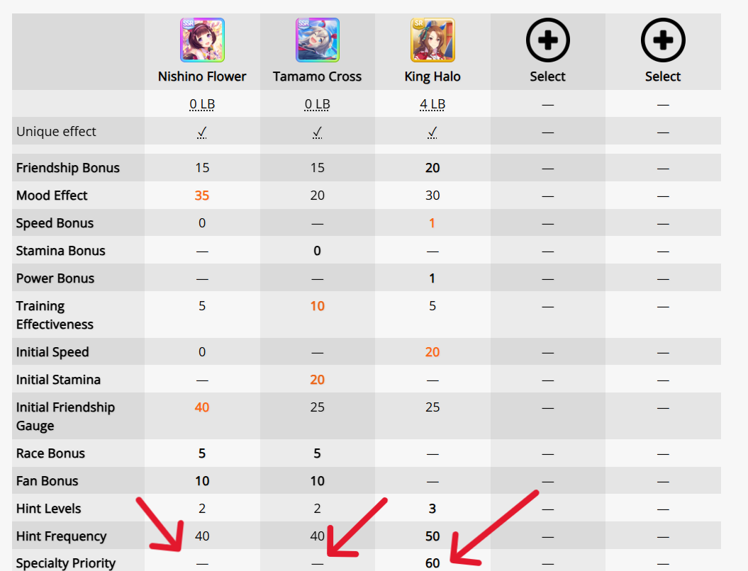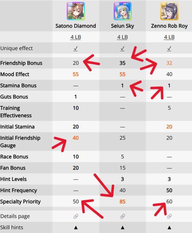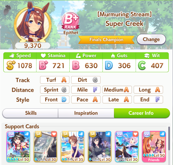 >>5394181 На лонг сложно качать, т.к. стамина плохо качается. Бери лучше на скорость предков или на мощность (по ощущениям смотри). В целом по ощущениям нужно предков брать на те статы к которым у тебя нет бонуса от тренировок (для Супер Крик бонусы это 10% стамина и 20% интеллекта насколько я помню). Прокачай ей потенциал пять, чтобы взять Свингинг Маестро. Карточку МакКвин нужно обязательно побольше ЛБшнуть, либо вообще заменить на карточку Райс Шауэр (правда этой вообще надо минимум 2 ЛБ), заодно она тебе гатс подкачает (у тебя маловато нужно что-то около 450). Можно воткнуть Матиканетаннхаузера или Хару Урару гатс (если у тебя есть 3+ ЛБ) вместо одной из скоростей. Вместо Спешиал Вик взять что-то более дающее статов (что там метафаги всё время ставят, Свип Тошо?), так как с потенциалом пять у тебя будет свингинг маестро + уникальная способность, хватит тебе. Вообще сложно знать что там у тебя за карты, да и даже зная сложно советы давать, т.к. я другими картами, как кроме своими не играл.